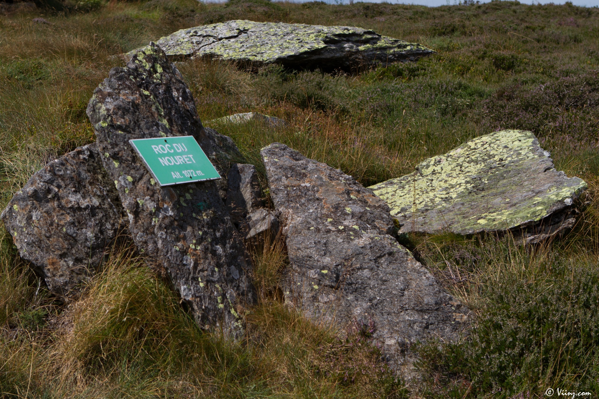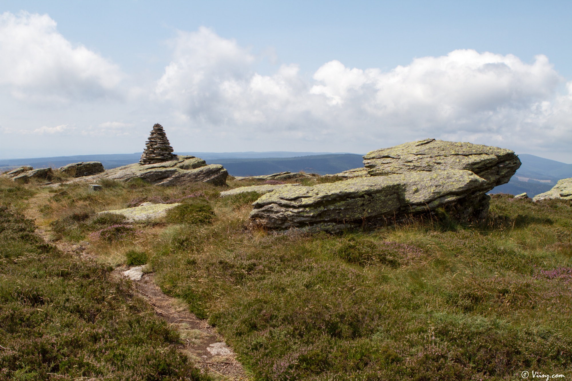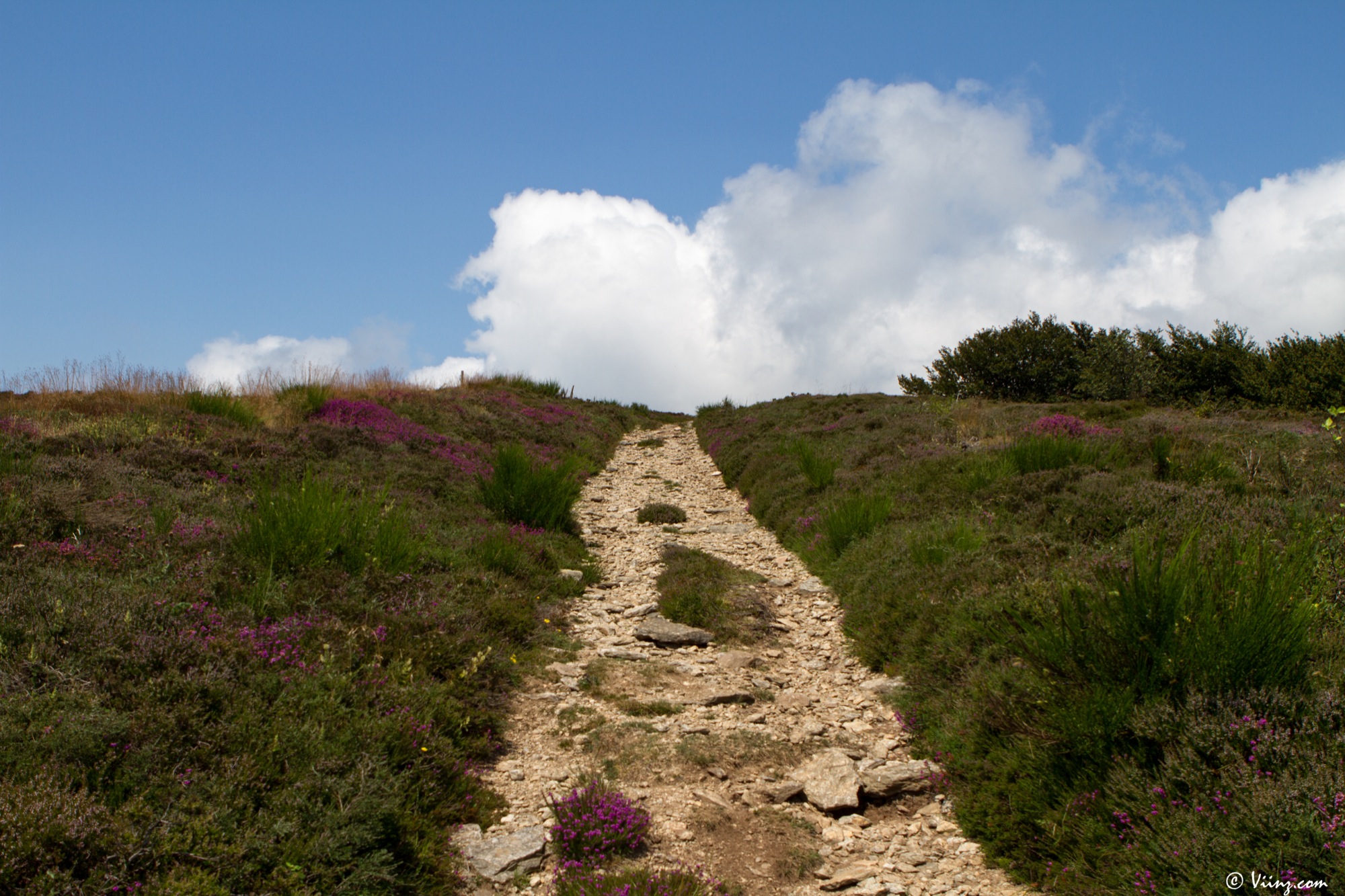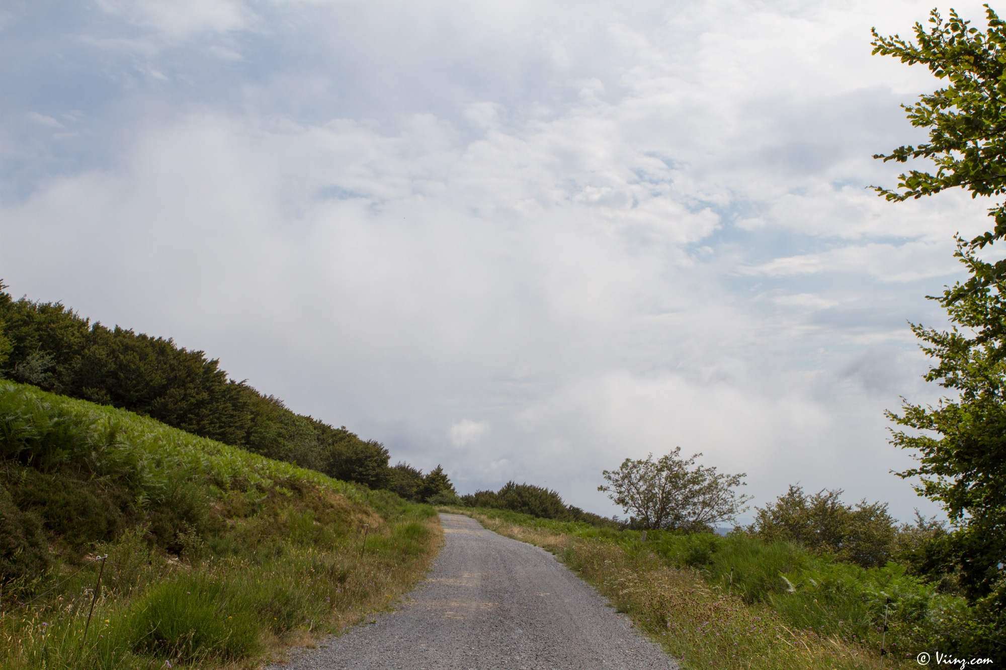 Manque de bol ce jour-là, il fait relativement moche sur le pic et le vent souffle (bon, il souffle tout le temps ici, à dire vrai). Il faudra attendre une bonne demie-heure pour que le soleil daigne se lever et darde ses rayons sur nos peaux dénuées de crème. Le vent frais, ce vil fourbe, couvrira le crime. Sacrée alliance, inattendue au vu du manteau nuageux mais si vous voulez vous balader là-haut : prenez de la crème. C’est d’autant plus dommage de brûler que le paysage change et donne envie d’en profiter. Lande de bruyères et de fougères, énorme chenille au milieu du chemin et une vue à couper le souffle depuis le Roc du Nouret ! Splendide, d’autant plus que le soleil se fait plus présent et moins fourbe. Voilà qui pousse à redescendre, un peu plus vite.