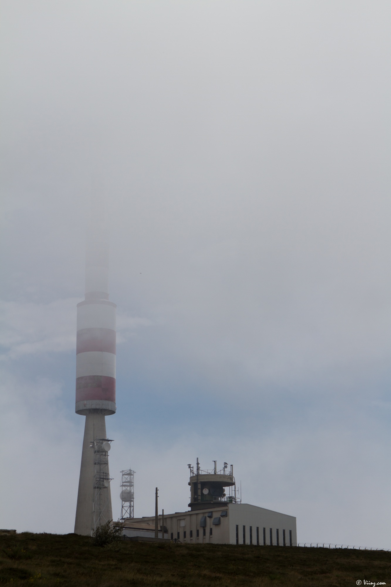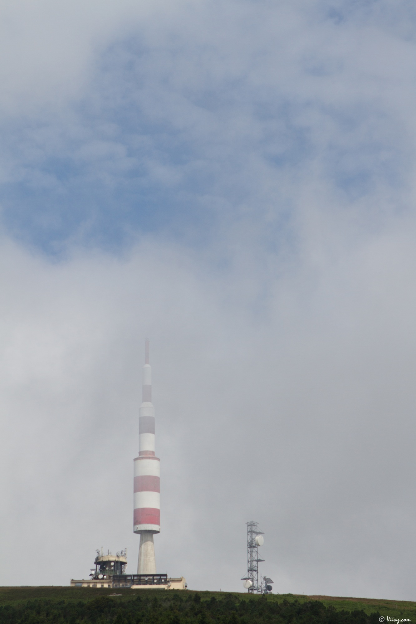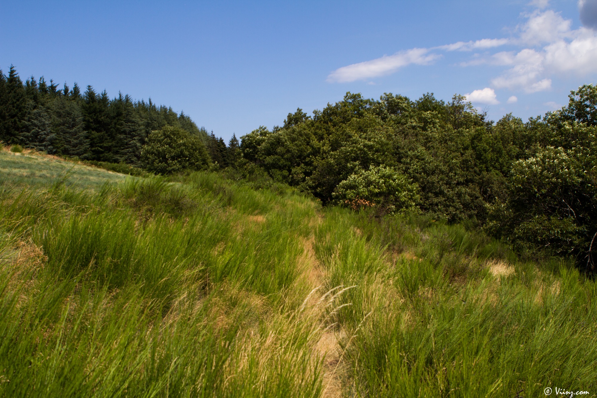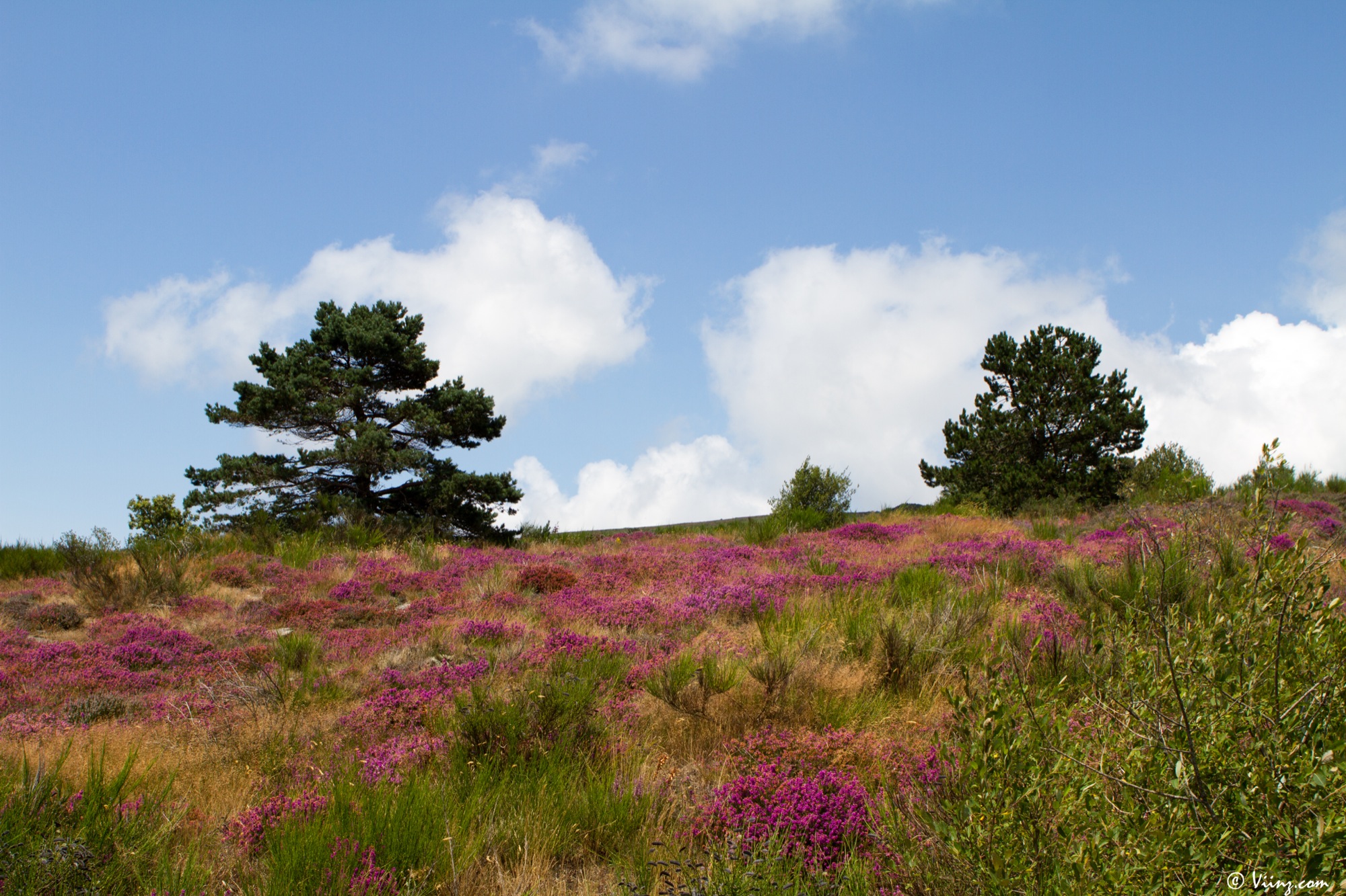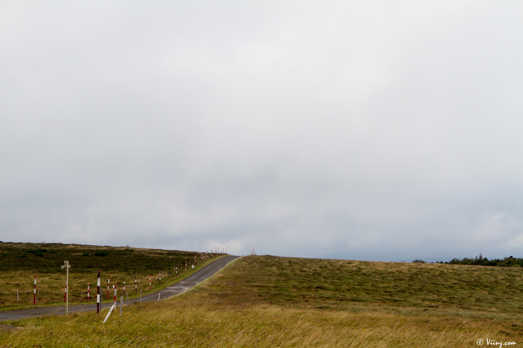 Manque de bol ce jour-là, il fait relativement moche sur le pic et le vent souffle (bon, il souffle tout le temps ici, à dire vrai). Il faudra attendre une bonne demie-heure pour que le soleil daigne se lever et darde ses rayons sur nos peaux dénuées de crème. Le vent frais, ce vil fourbe, couvrira le crime. Sacrée alliance, inattendue au vu du manteau nuageux mais si vous voulez vous balader là-haut : prenez de la crème. C’est d’autant plus dommage de brûler que le paysage change et donne envie d’en profiter. Lande de bruyères et de fougères, énorme chenille au milieu du chemin et une vue à couper le souffle depuis le Roc du Nouret ! Splendide, d’autant plus que le soleil se fait plus présent et moins fourbe. Voilà qui pousse à redescendre, un peu plus vite.