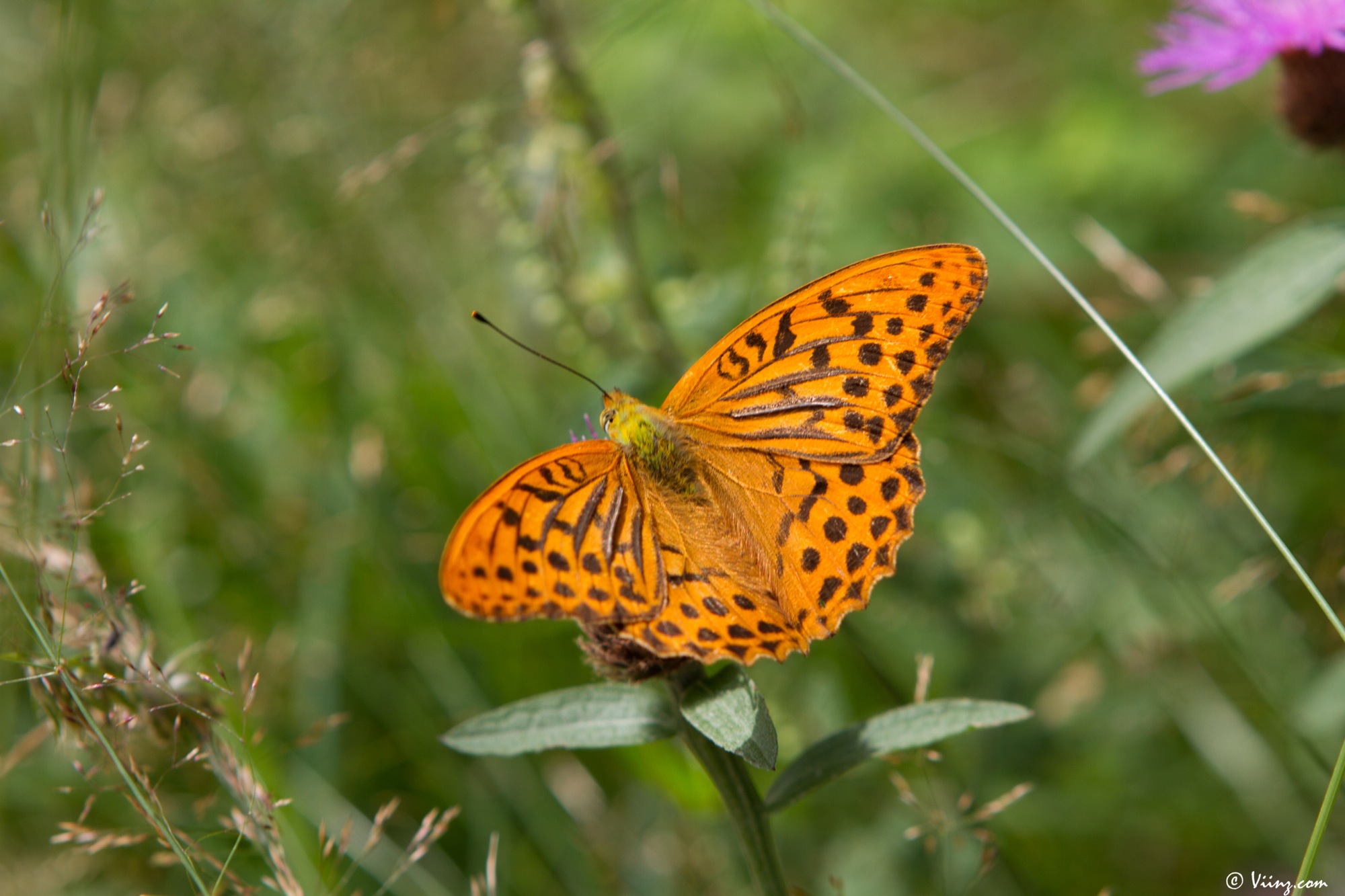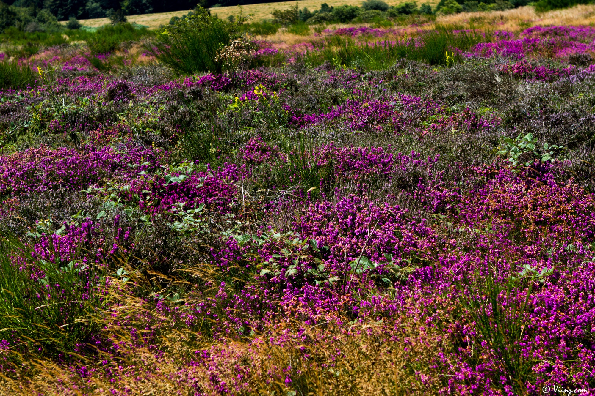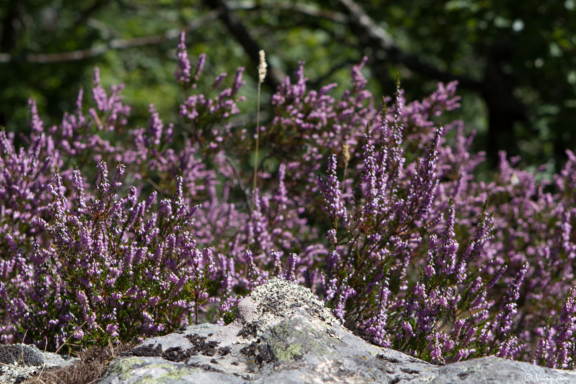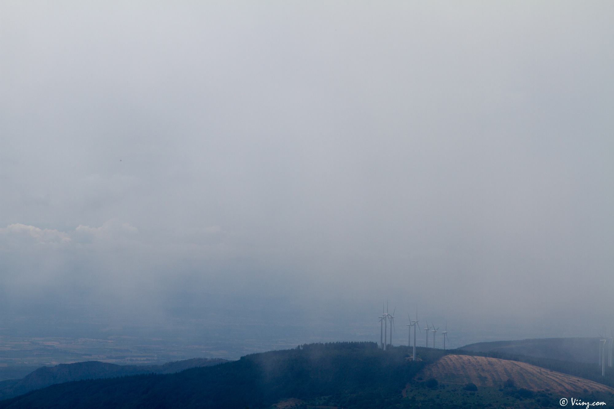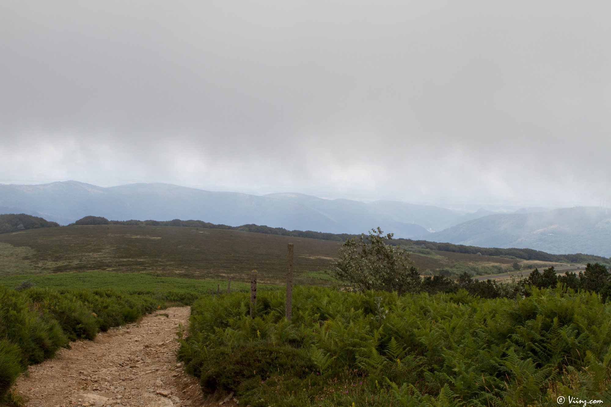 Manque de bol ce jour-là, il fait relativement moche sur le pic et le vent souffle (bon, il souffle tout le temps ici, à dire vrai). Il faudra attendre une bonne demie-heure pour que le soleil daigne se lever et darde ses rayons sur nos peaux dénuées de crème. Le vent frais, ce vil fourbe, couvrira le crime. Sacrée alliance, inattendue au vu du manteau nuageux mais si vous voulez vous balader là-haut : prenez de la crème. C’est d’autant plus dommage de brûler que le paysage change et donne envie d’en profiter. Lande de bruyères et de fougères, énorme chenille au milieu du chemin et une vue à couper le souffle depuis le Roc du Nouret ! Splendide, d’autant plus que le soleil se fait plus présent et moins fourbe. Voilà qui pousse à redescendre, un peu plus vite.