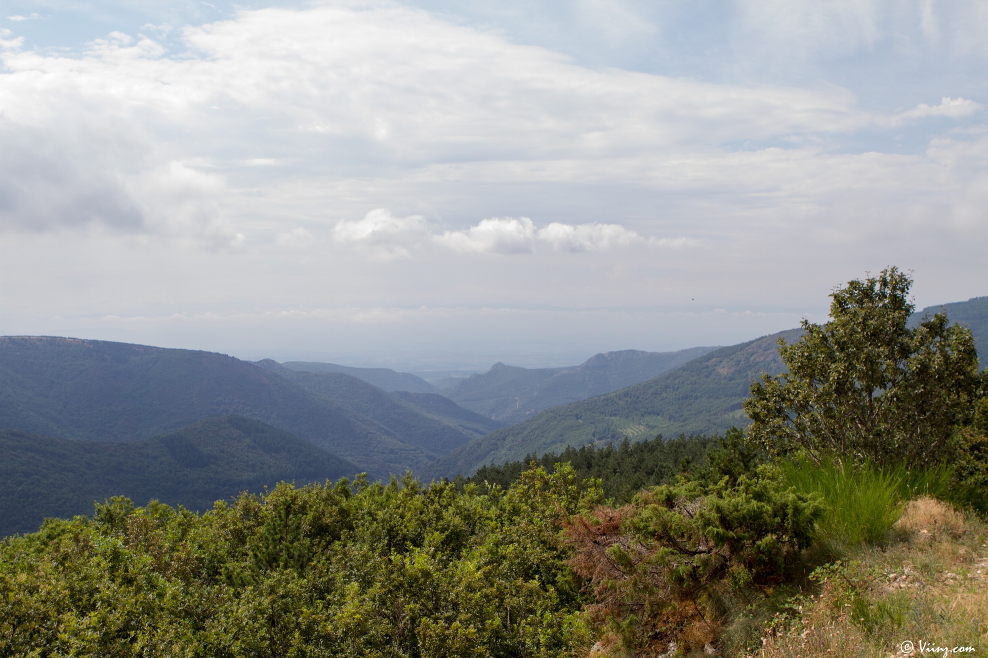 Autre randonnée, autre topo. Le départ se fait du même point mais on est cette fois-ci partis pour 600m de dénivelé et 21 km de marche ! Pas vraiment le même gabarit mais l’annonce est alléchante : “les Panoramas”, autrement dit un sentier qui, partant de Castans, rejoint le pic de Nore et le Roc du Nouret avant de redescendre sur Pradelles-Cabardès et ses glacières. Soit. Hauts les cœurs, j’ai déjà randonnée pire. Il faut soit dit en passant courage garder en début de randonnée tant celle-ci ne présente que peu d’intérêt. La piste, large, sinue entre les pins sans offrir (ou presque) la moindre trouée dans les arbres et il faut attendre l’arrivée au pied du pic de Nore pour enfin voir le paysage et le “panorama”, justement.