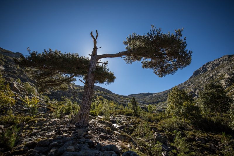 Le terrain se dénude petit à petit et les conifères disparaissent, avec un dernier spécimen solitaire de toute beauté. On atteint enfin la petite bergerie de Colga. Le paysage en retrait, avec la chaîne du Monte Cinto nettement plus visible désormais, est superbe. Il est temps d’entamer le dernier bout d’ascension dans une grande étendue très minérale et sauvage, jusqu’à la crête que l’on devine tout là-haut.