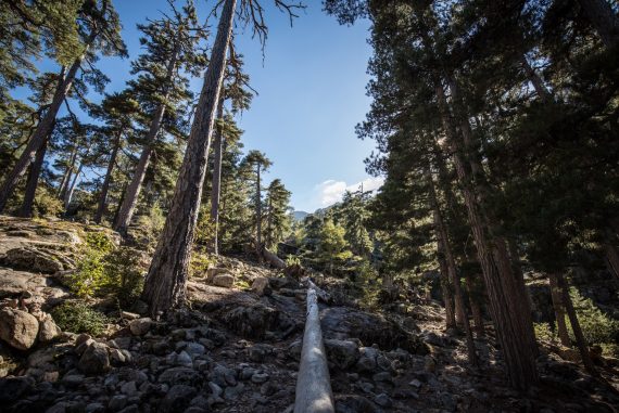 Depuis la maison forestière de Poppaghia, c’est parti pour un peu plus de 700 mètres d’ascension vers une petite merveille située sur le GR20 : le lac de Nino. Le parcours commence en forêt, en compagnie de quelques vaches à moitié sauvages. Le Monte Cinto se laisse apercevoir de temps en temps entre les frondaisons.