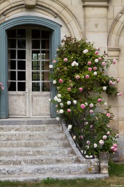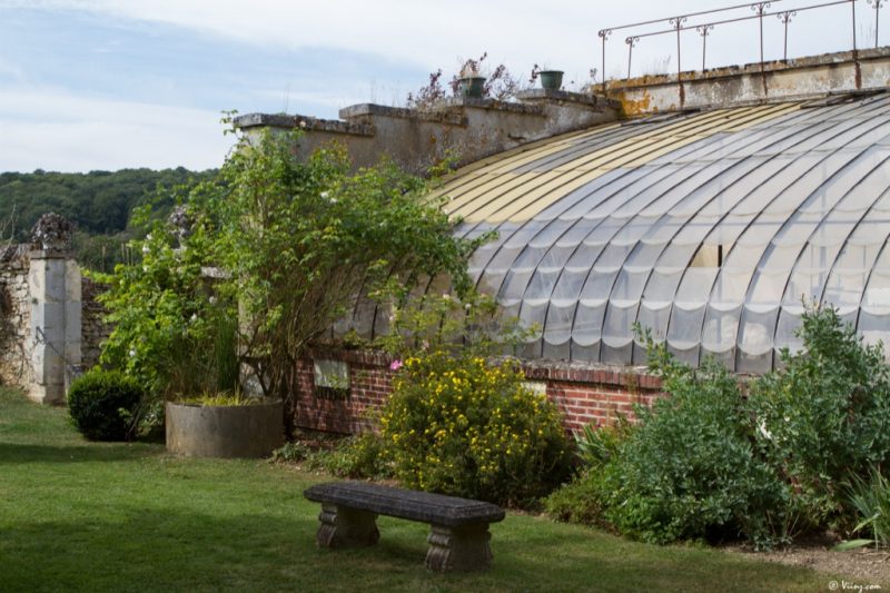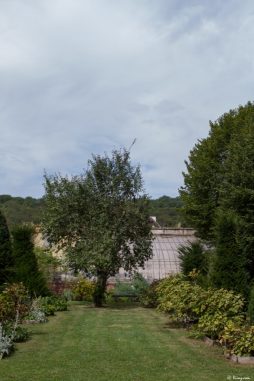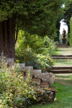 On pénètre alors dans l’ensemble de quatre terrasses plantées et fleuries qui constituent le domaine du château d’Ambleville. On découvre sur la droite une ancienne serre et ses parterres, son prunier gorgé de fruits qui donne d’ailleurs quelque peu envie. Un ancien bassin trône aussi là, surveillé par une statue. Le tout est baigné de soleil et on se sent plutôt bien.