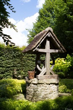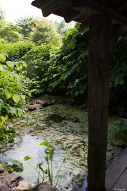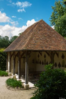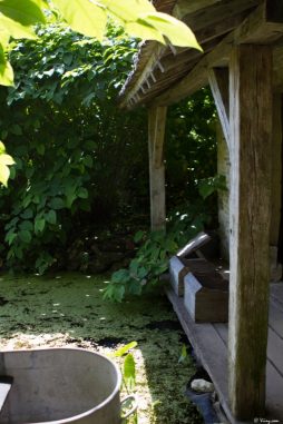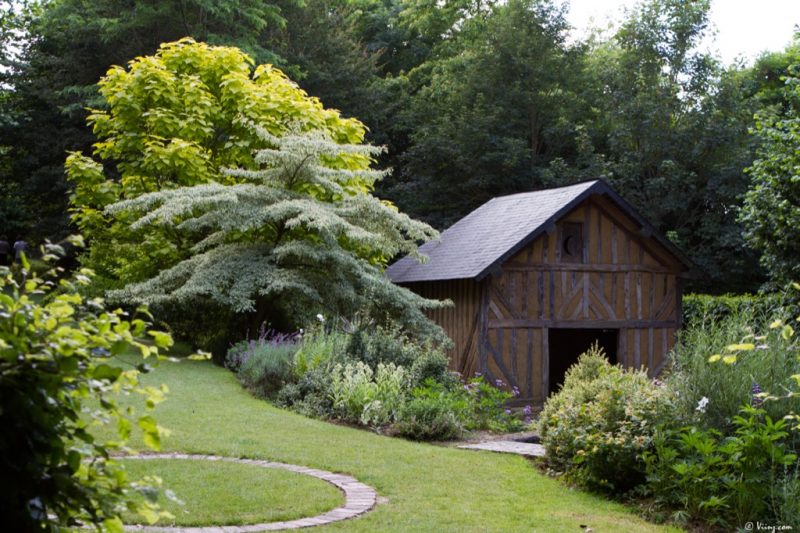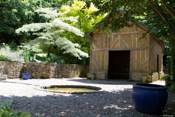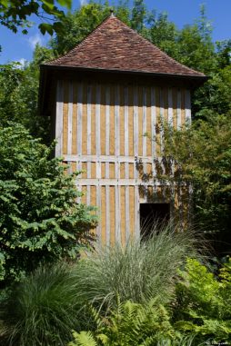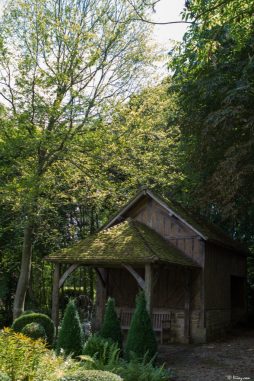 On continue avec un très joli puits planqué dans un enclos de verdure, suivi d’un nom moins joli jardins des senteurs où il faut laisser traîner ses mains sur les plantes pour finir chez les paons, absents, toujours est-il que leur logis est charmant et que le sous-bois qui borde cette nouvelle construction est un espace frais salvateur sous un soleil normand en pleine forme.
