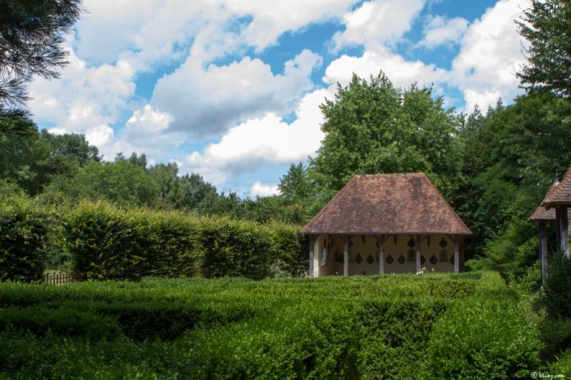 L’allée qui accueille les visiteurs nous emmène tout d’abord en surplomb des jardins de la lune et du soleil mais il ne s’agit pas de s’y arrêter, les propriétaires ayant mis en place un itinéraire très bien fait… Quelques mètres plus loin, c’est le pigeonnier, splendide, et une masure abritant deux ânes un brin acariâtres que l’on contemple. Luxuriance des arbres, des fleurs et mariage parfait des couleurs des frondaisons. La visite ne fait que commencer mais on pourrait d’ores et déjà se poser là et rester une heure à profiter du soleil et du calme.