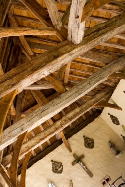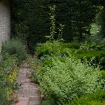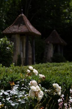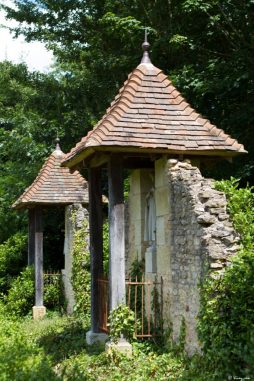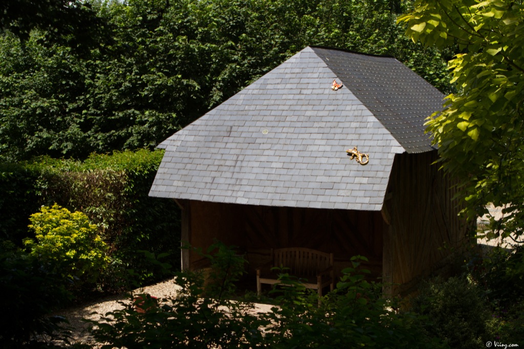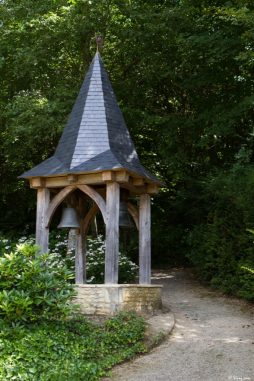 Un peu en contrebas, après avoir fait quelques photos de la balancelle perdue au milieu des arbres, on découvre un labyrinthe de buis sobrement taillés, entouré de haies et de vieilles pierres religieuses avant, enfin, de déboucher sur une évocation d’église. Vieilles poutres, clocher au ras du sol et fleurs en pagaille tandis qu’un chant résonne, donnant à cette zone un caractère un peu mystique et apaisant.