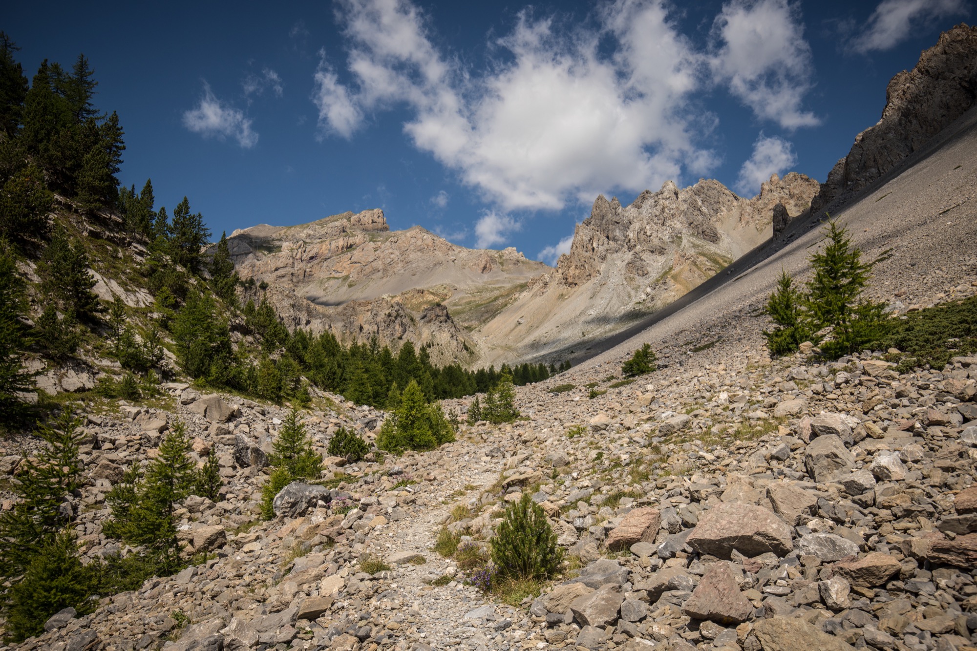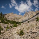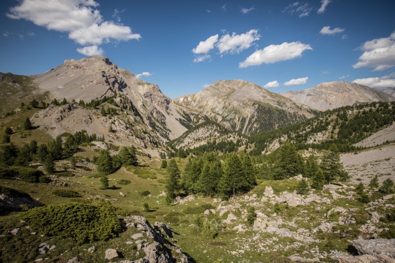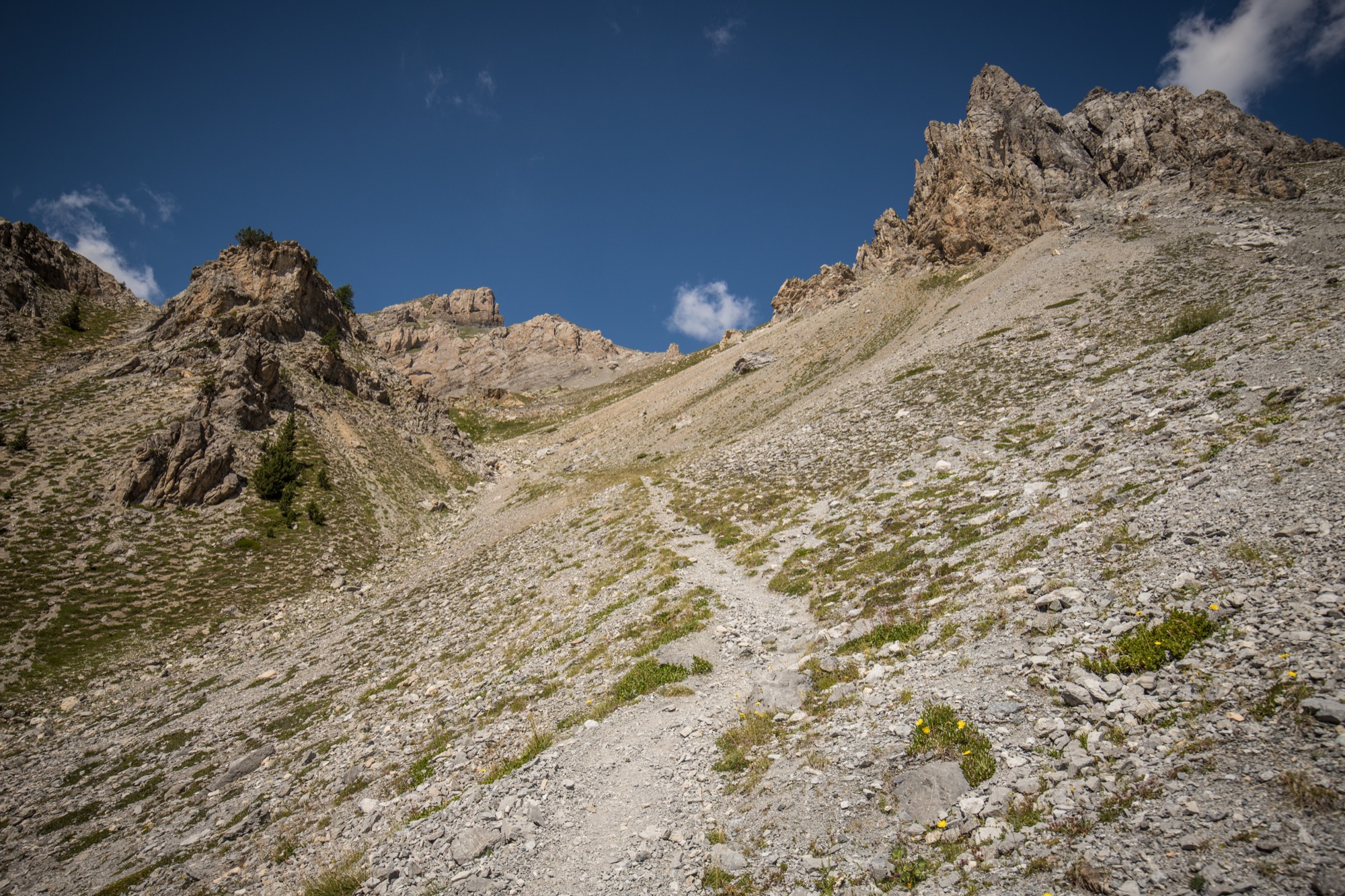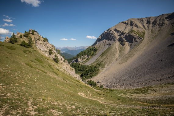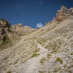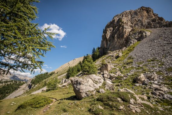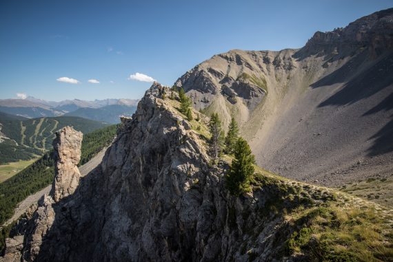 Pour la descente finale, on a le choix d’emprunter la piste qui descend doucement vers Brunissard, avec un petit domaine hivernal qui rend la zone un peu moins jolie que tout ce qu’on a vu auparavant ; ou bien prendre un nouveau sentier balcon sur la droite, en direction du col du Cros. J’ai préféré prendre ce chemin et bien m’en a pris car s’il rajoute 200 mètres de grimpette très progressive, il offre de superbes vues sur la vallée d’Arvieux, sur la zone de l’Izoard et permet aussi d’admirer l’immense dent rocheuse située à quelques mètres du col du Cros. Le reste de la descente, en forêt, fut malheureusement un peu plus long que prévu, le sentier principal était tout simplement coupé par une immense coulée rocheuse ! Rien de vraiment dramatique et pas de quoi me faire changer d’avis sur cette randonnée et ce Pic des Esparges Fines : la zone mérite qu’on y randonne !