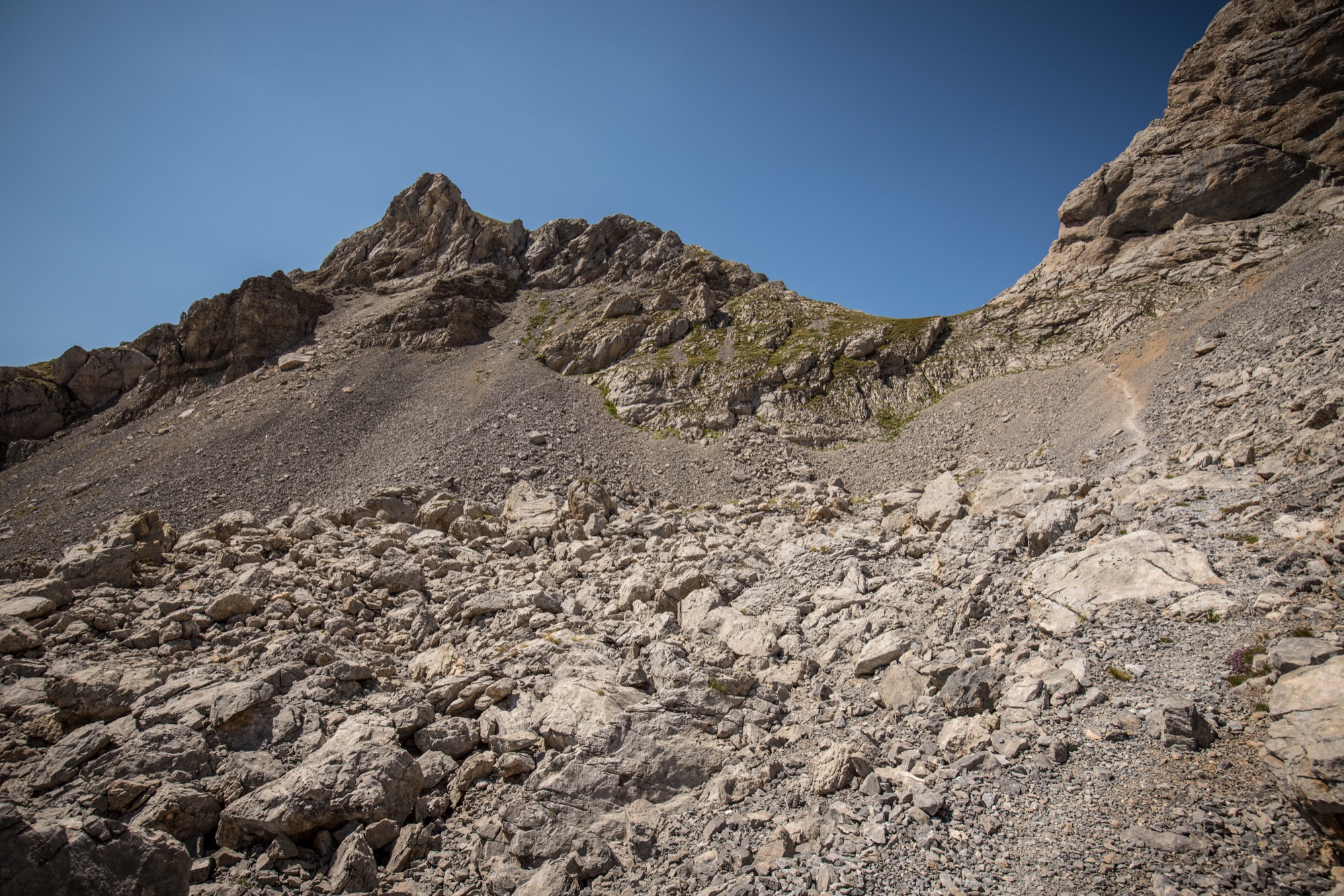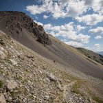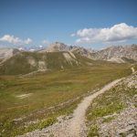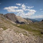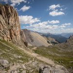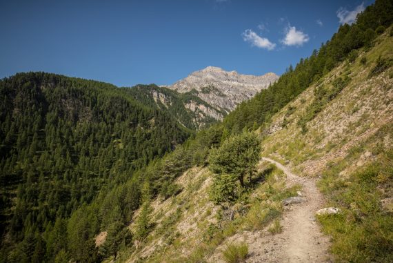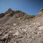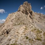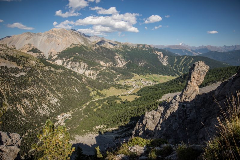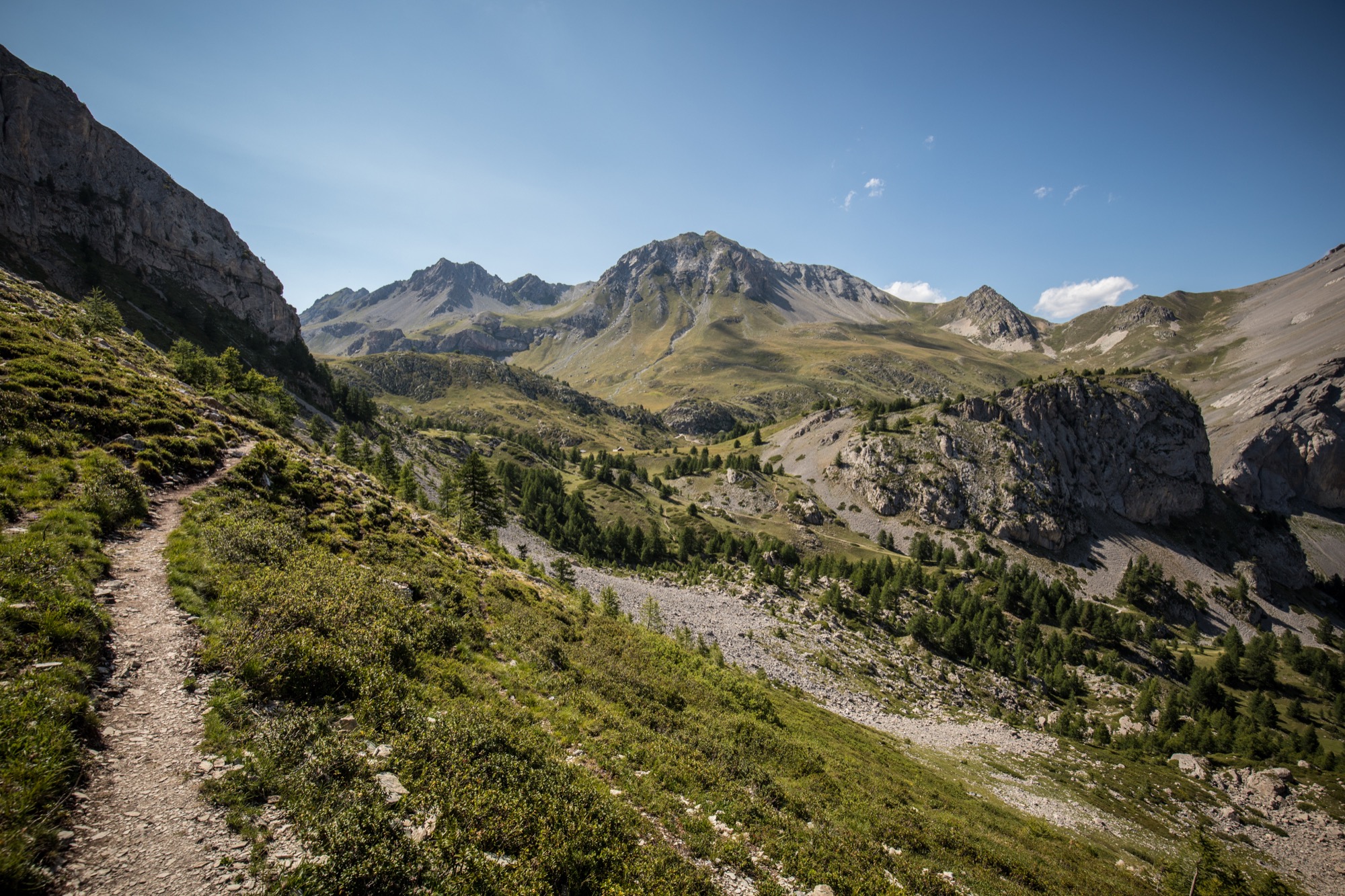 Pour la descente finale, on a le choix d’emprunter la piste qui descend doucement vers Brunissard, avec un petit domaine hivernal qui rend la zone un peu moins jolie que tout ce qu’on a vu auparavant ; ou bien prendre un nouveau sentier balcon sur la droite, en direction du col du Cros. J’ai préféré prendre ce chemin et bien m’en a pris car s’il rajoute 200 mètres de grimpette très progressive, il offre de superbes vues sur la vallée d’Arvieux, sur la zone de l’Izoard et permet aussi d’admirer l’immense dent rocheuse située à quelques mètres du col du Cros. Le reste de la descente, en forêt, fut malheureusement un peu plus long que prévu, le sentier principal était tout simplement coupé par une immense coulée rocheuse ! Rien de vraiment dramatique et pas de quoi me faire changer d’avis sur cette randonnée et ce Pic des Esparges Fines : la zone mérite qu’on y randonne !