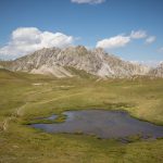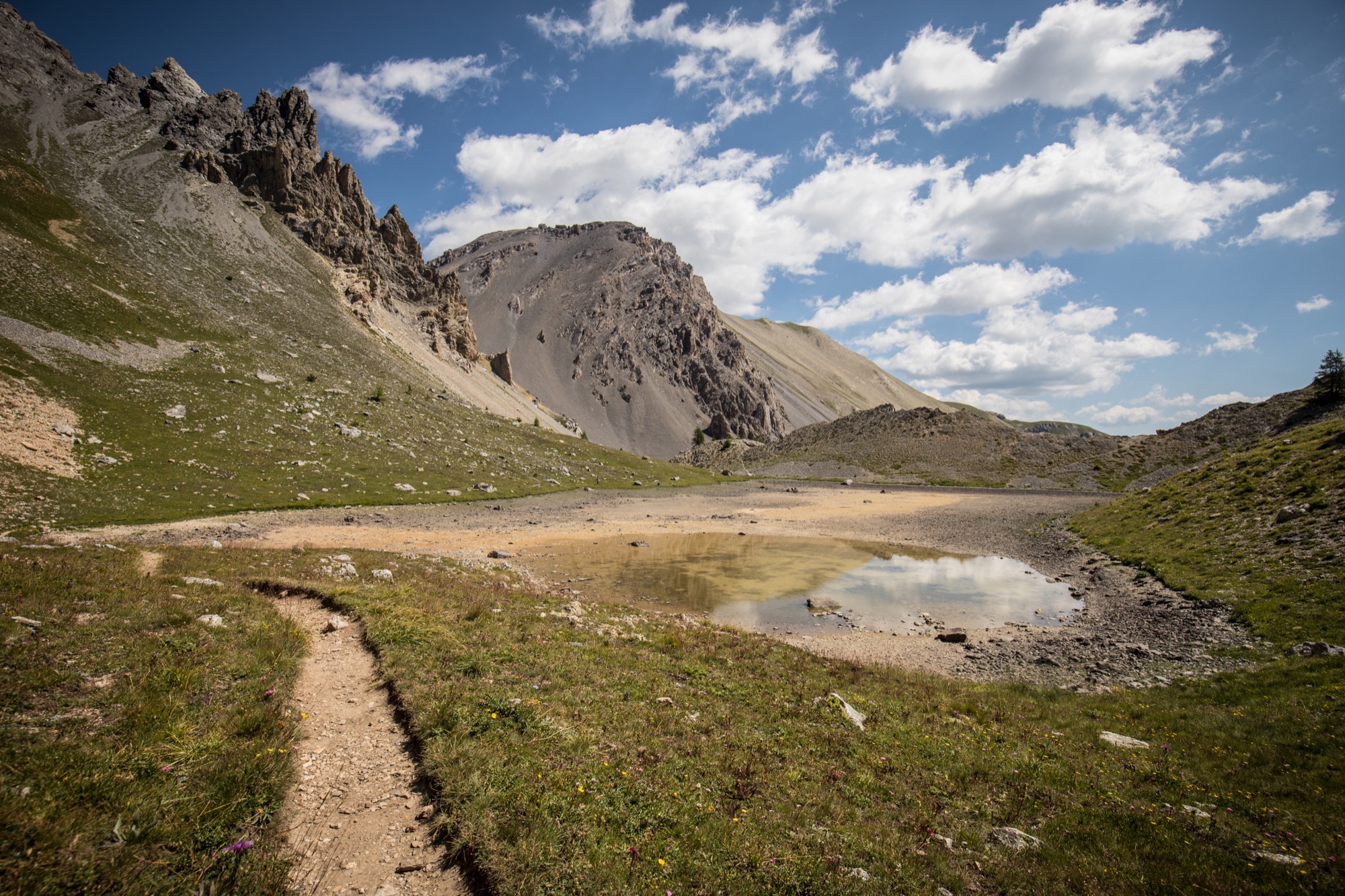 C’est à partir de ce moment-là que les choses sérieuses commencent, le sentier montant le long du torrent de Combe Bonne vers le Pic du Cros et ses voisins. L’ascension reste très progressive et agréable, sur un sentier d’excellente qualité. Cela se corse un peu sur la fin de cette première belle section pour rejoindre un petit vallon qui abrite le lac du Lauzon, en tout cas ce qu’il en reste à cette saison ! Les pics alentours, avec leurs couleurs et formes assez singulières, forment un splendide écrin pour ce petit lac.