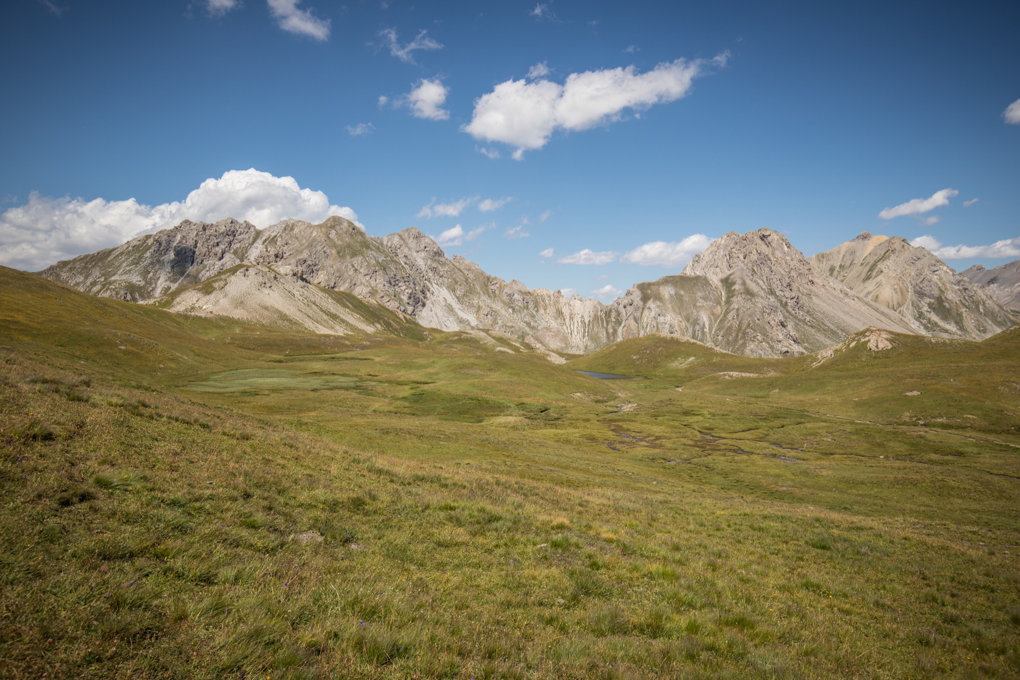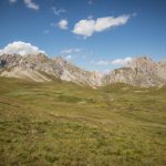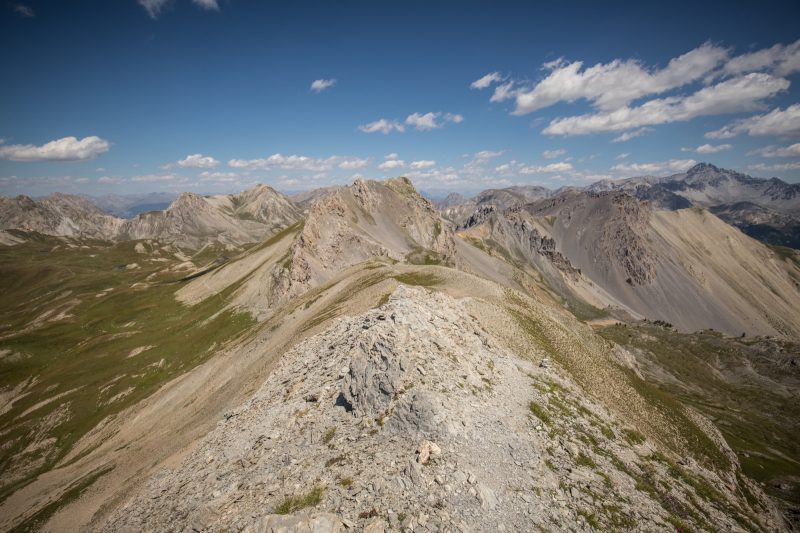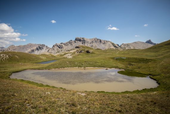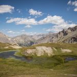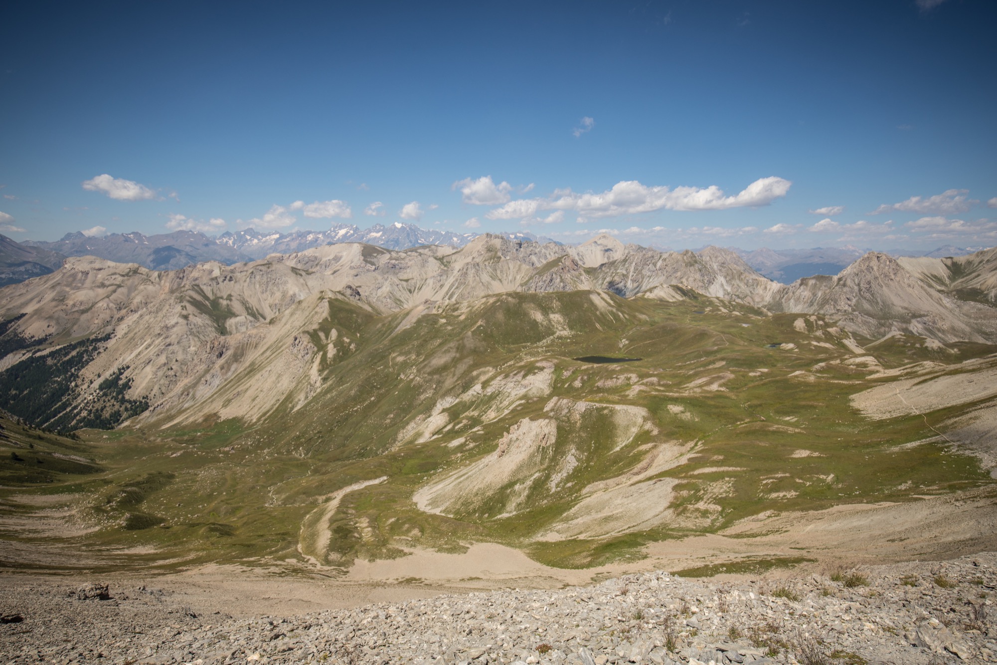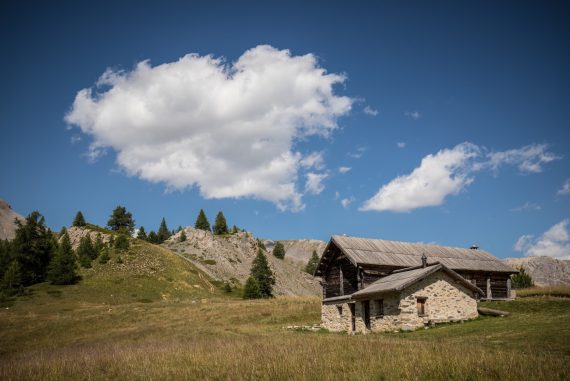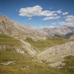 Le sommet du Pic des Esparges Fines atteint et ce splendide groupement de lacs admiré convenablement, il était désormais temps d’entamer la descente en direction des jolis chalets de Clapeyto. Le paysage, composé de l’autre versant du Pic du Cros et de ses voisins et de la zone martienne du col de l’Izoard au loin, garantit le caractère spectaculaire de la descente qui se fait là-encore sur d’excellents sentiers. Les chalets sont ainsi rapidement atteints et même dépassés. Le coin est paradisiaque, on a bien envie de pouvoir se poser ici, avec son 4×4 et son chalet !