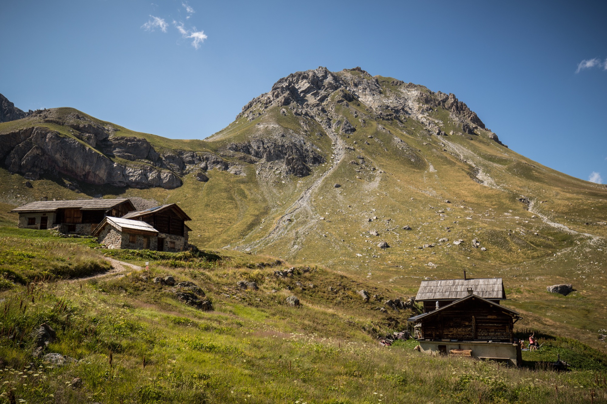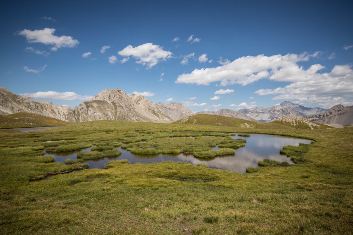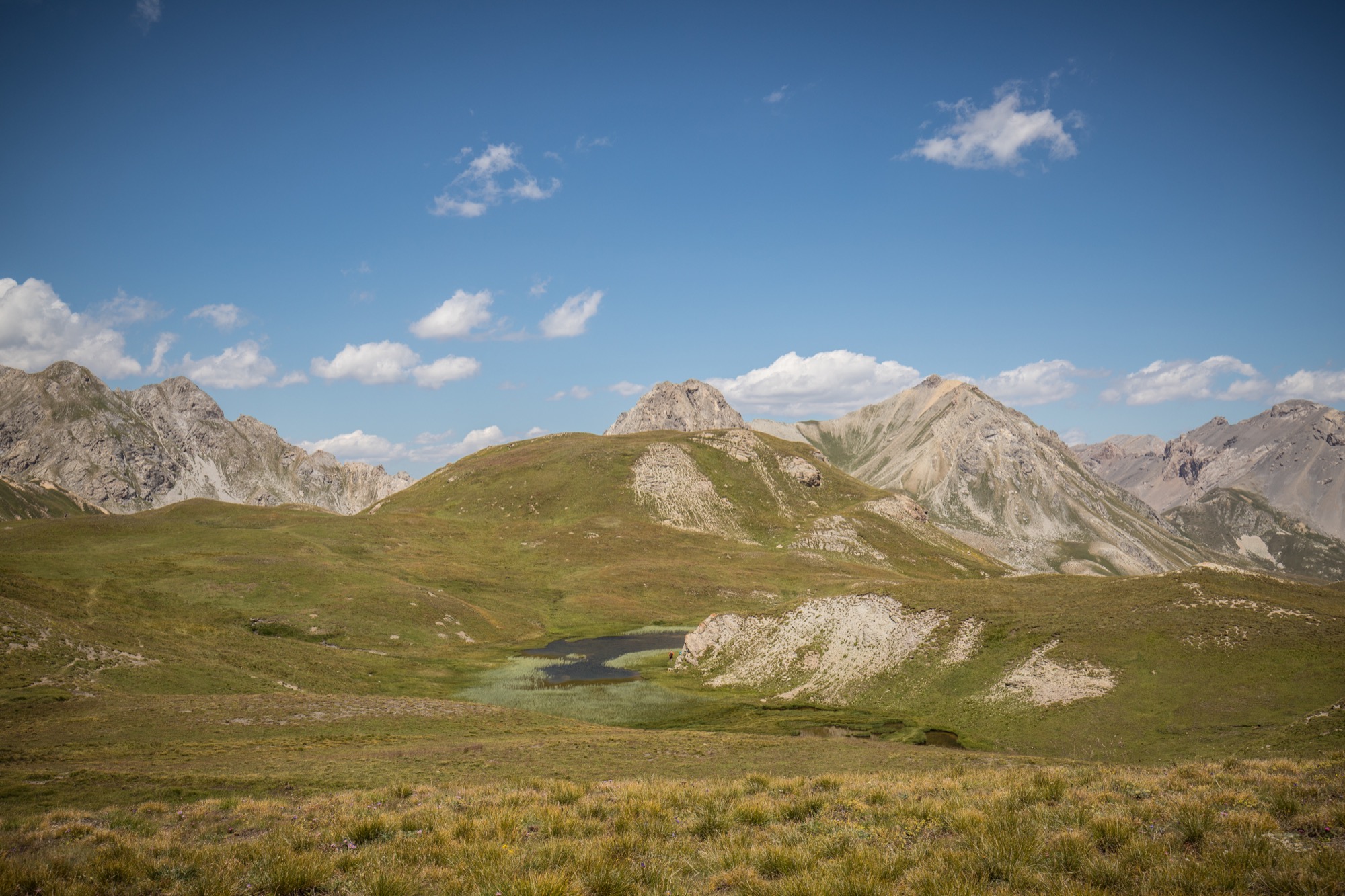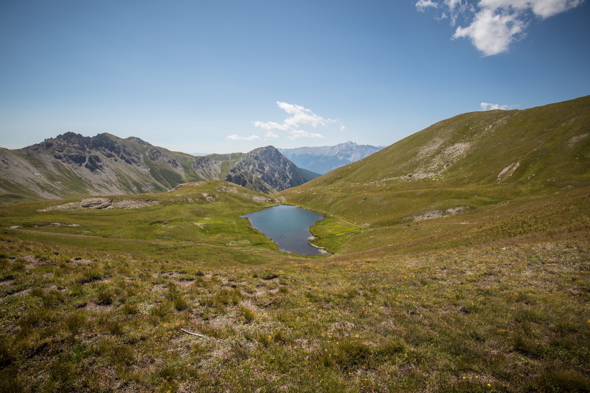 Le sommet du Pic des Esparges Fines atteint et ce splendide groupement de lacs admiré convenablement, il était désormais temps d’entamer la descente en direction des jolis chalets de Clapeyto. Le paysage, composé de l’autre versant du Pic du Cros et de ses voisins et de la zone martienne du col de l’Izoard au loin, garantit le caractère spectaculaire de la descente qui se fait là-encore sur d’excellents sentiers. Les chalets sont ainsi rapidement atteints et même dépassés. Le coin est paradisiaque, on a bien envie de pouvoir se poser ici, avec son 4×4 et son chalet !