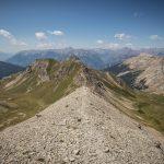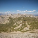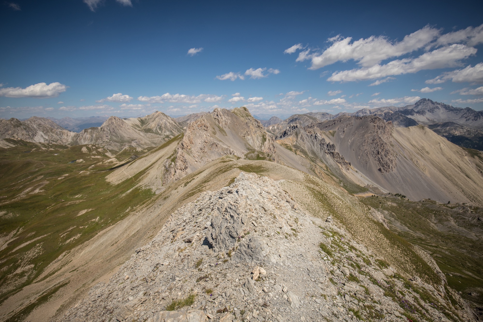 Il reste ensuite un gros coup de montée dans un terrain très minéral pour rejoindre le col du Lauzon, à quasiment 2600 mètres d’altitude. Du col, on observe avec délice le chemin parcouru et on découvre aussi et surtout le paysage d’alpages d’altitude qui s’étend devant nous pour la suite de la randonnée. On peut d’ailleurs tout à fait éviter le Pic des Esparges Fines en coupant tout droit mais je n’en fais rien et prend le chemin de crête qui monte doucement vers le sommet. Le chemin offre de jolies vues en cours de route, avant de rejoindre la cime très arrondie du pic, qui s’il n’est pas très haut bénéficie d’une position bien dégagée et ouvre donc un large champ de vision ! Splendide de tous côtés.