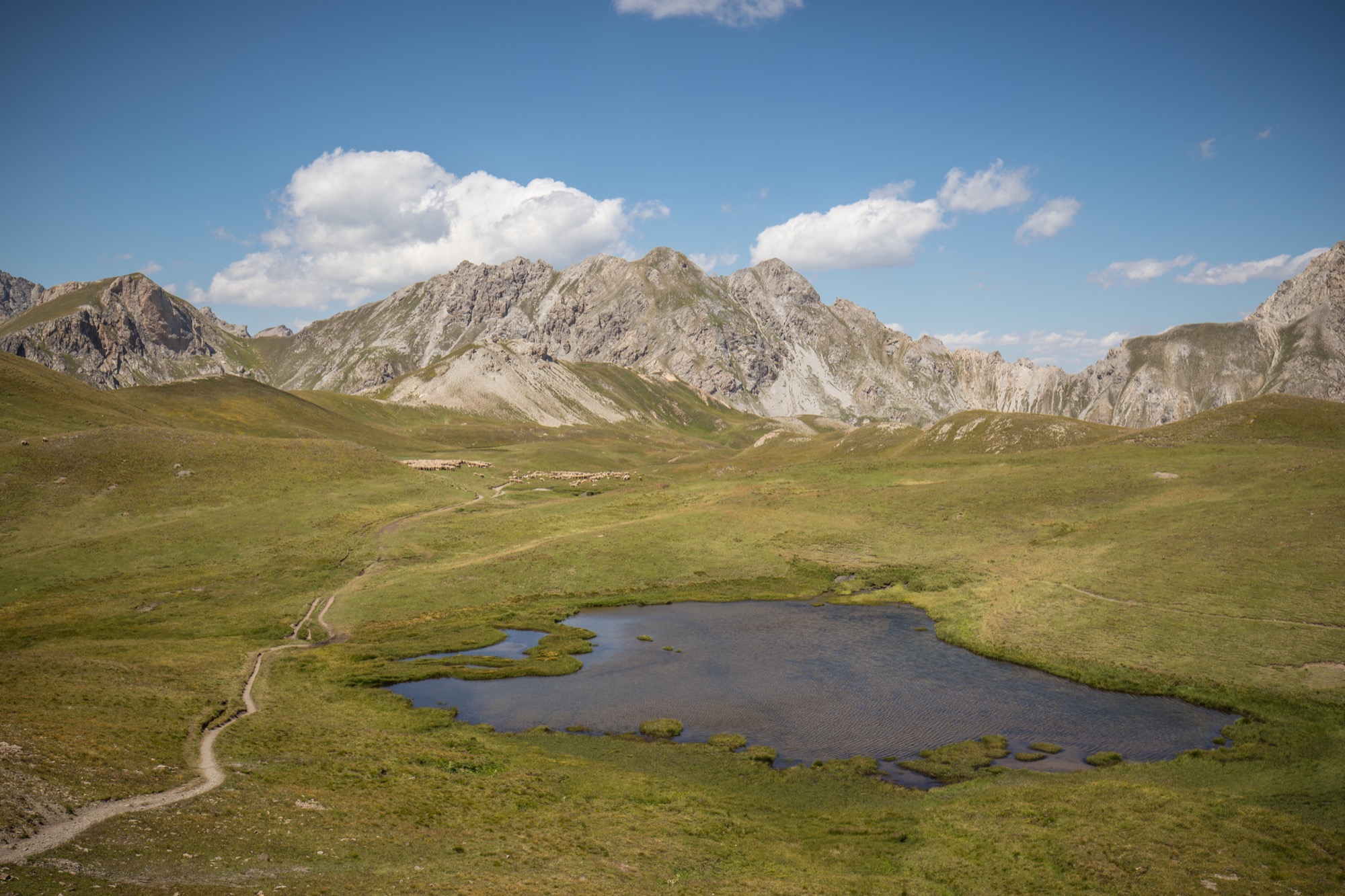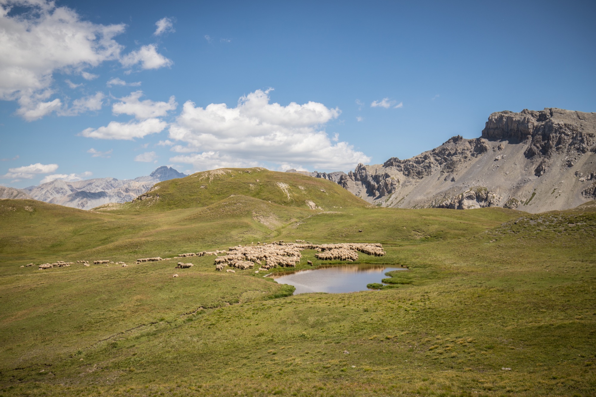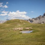 La descente, un peu technique par endroits, permet de rejoindre le plancher des vaches où les jambes peuvent ensuite dérouler à bonne vitesse sur le plat en direction des multiples lacs aperçus auparavant ! Lac du Néal, lac Marion, lac de la Favière ou encore lac Cogour sont autant de points de rendez-vous photographiques autour du col du Ransier. La pause s’impose au dessus du dernier nommé, le lac Cogour “supérieur”, à savoir situé au dessus du chemin de randonnée et qui illustre cet article. Avant cela, il aura fallu contourner un joli troupeau de brebis sagement gardé par deux patous. On a d’ailleurs failli assister à une belle défense de l’un des chiens face à deux randonneurs n’ayant rien trouvé de mieux comme idée que de rester sur le sentier et de traverser le troupeau en plein milieu. Y en a qui cherchent…
