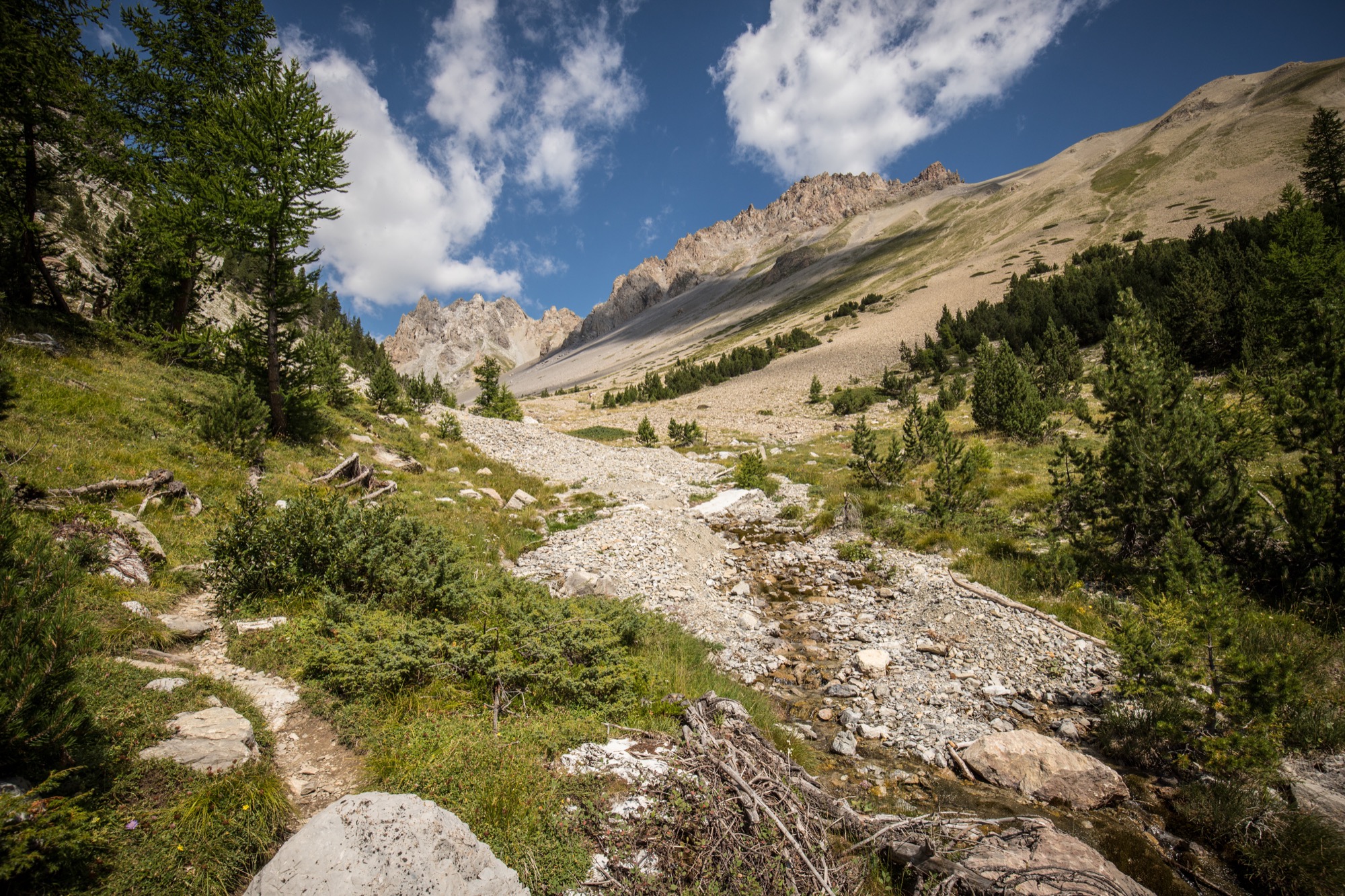 Rendez-vous dans un autre coin du Parc Naturel Régional du Queyras pour cette belle randonnée du Pic des Esparges Fines. Le légendaire col de l’Izoard n’est pas loin, nous sommes dans la vallée d’Arvieux, que j’ai traversé sans m’arrêter pour me rendre au hameau suivant, celui de Brunissard, pour y garer mon auto et entamer le parcours. Celui-ci démarre d’ailleurs calmement et descend la vallée en restant à la même altitude, donnant l’impression de grimper plus qu’on ne le fait réellement sans grand effort physique ! Ce joli sentier balcon continue de coller aux flancs de la montagne jusqu’au niveau du hameau du Coin, où il rejoint une piste forestière.