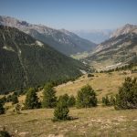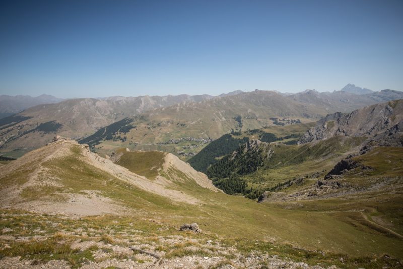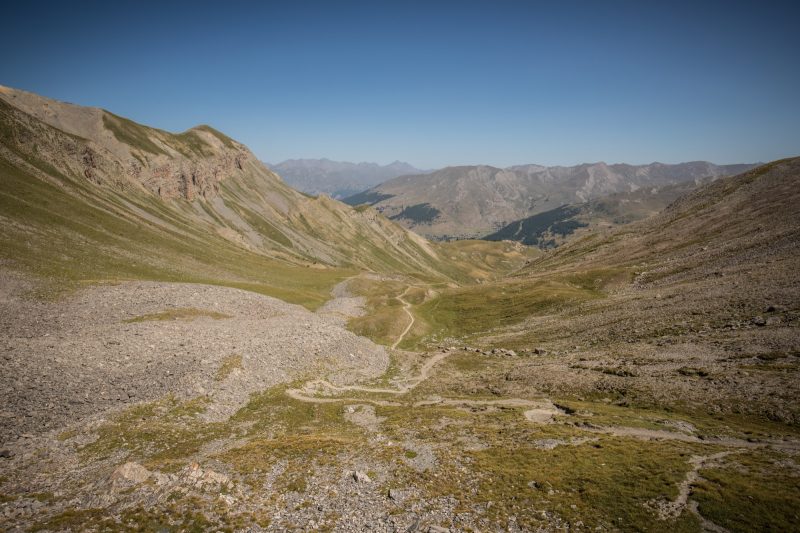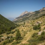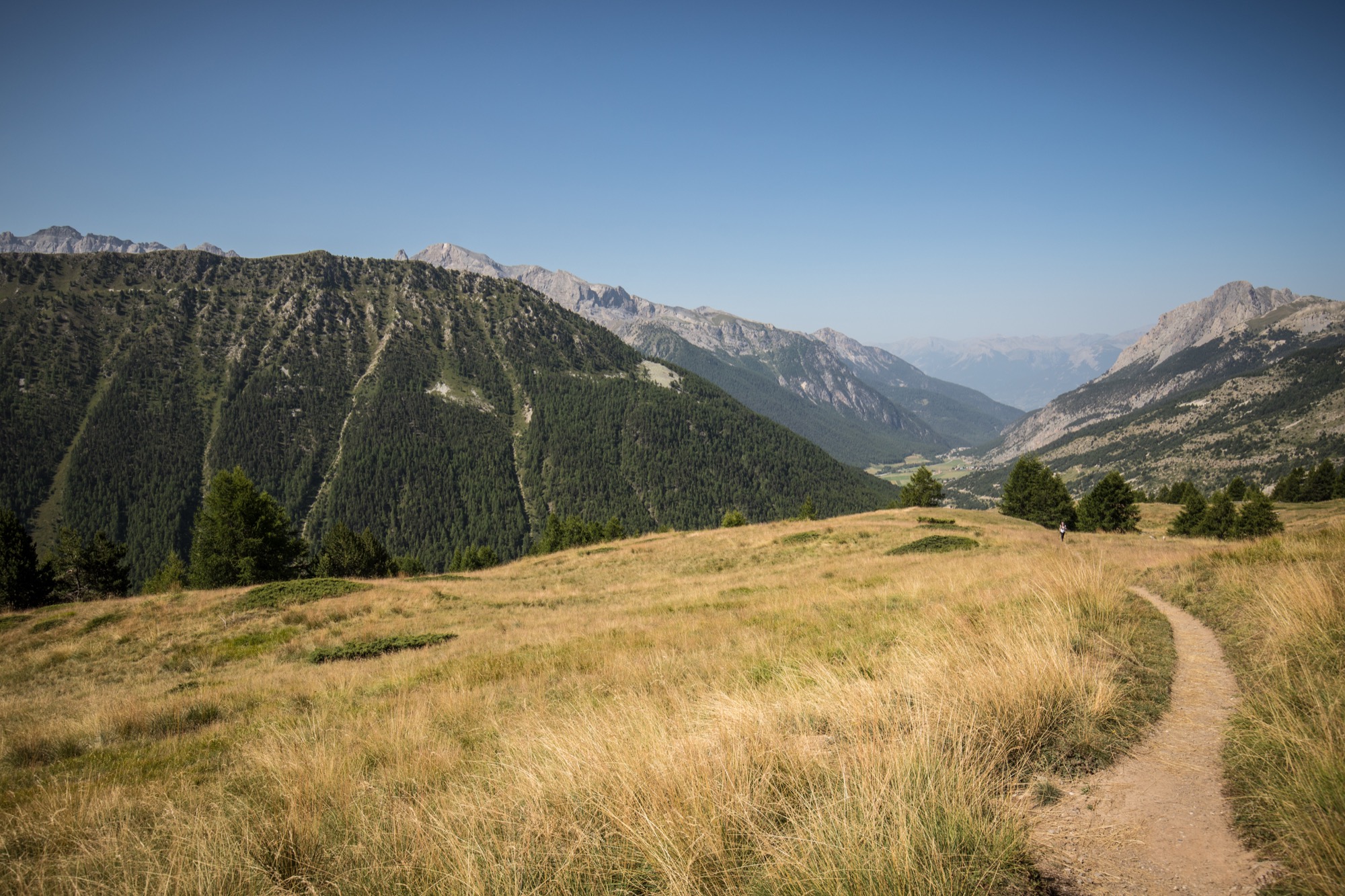 Le sentier, parfaitement aménagé, nous éloigne doucement du hameau du Rabinoux pour rejoindre et traverser la forêt. La pente, douce, s’infléchit pour grimper de façon constante et satisfaisante jusqu’au col des Estronques. Les vues sur la vallée en contrebas sont à savourer pendant les éventuelles pauses mais il y aura de toute façon largement de quoi s’occuper les yeux un tout petit peu plus haut, au col justement ! La vallée de Saint-Véran se laisse alors apercevoir mais il va falloir encore grimper un peu pour que l’horizon s’élargisse complètement.