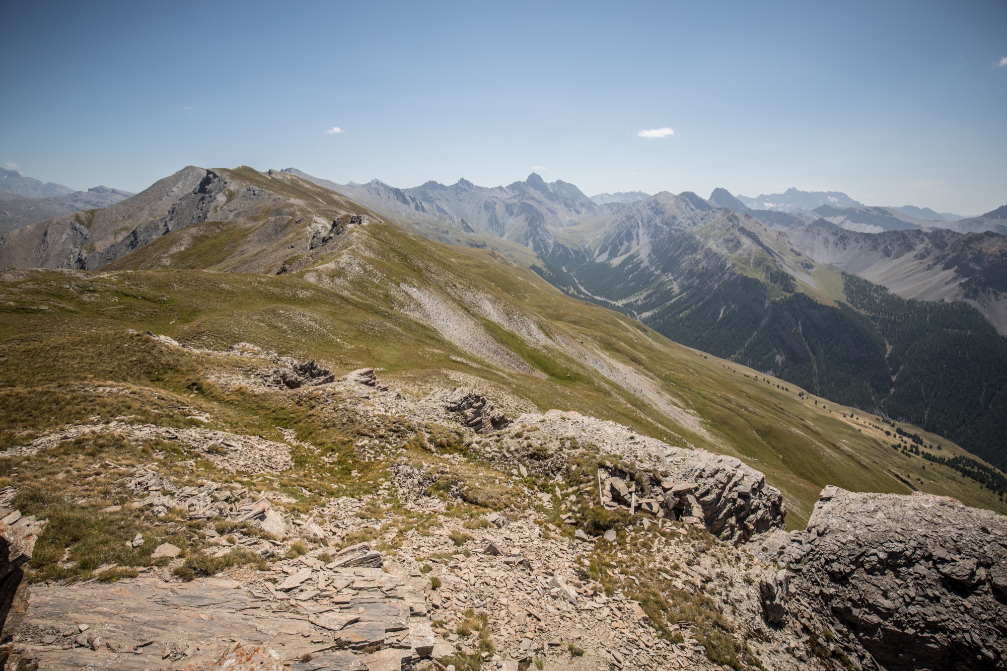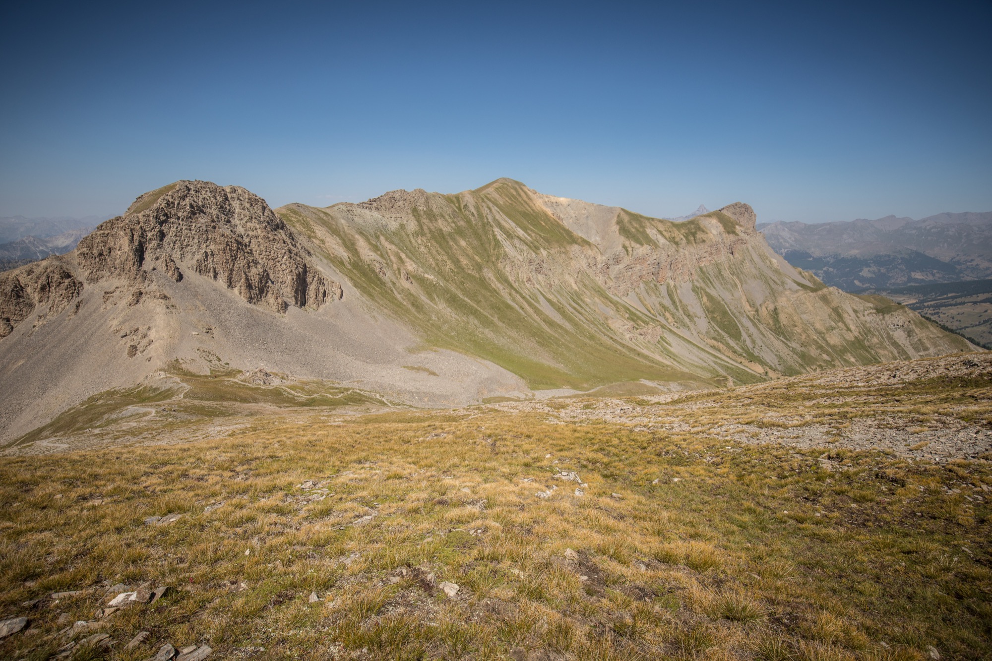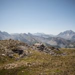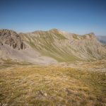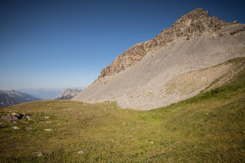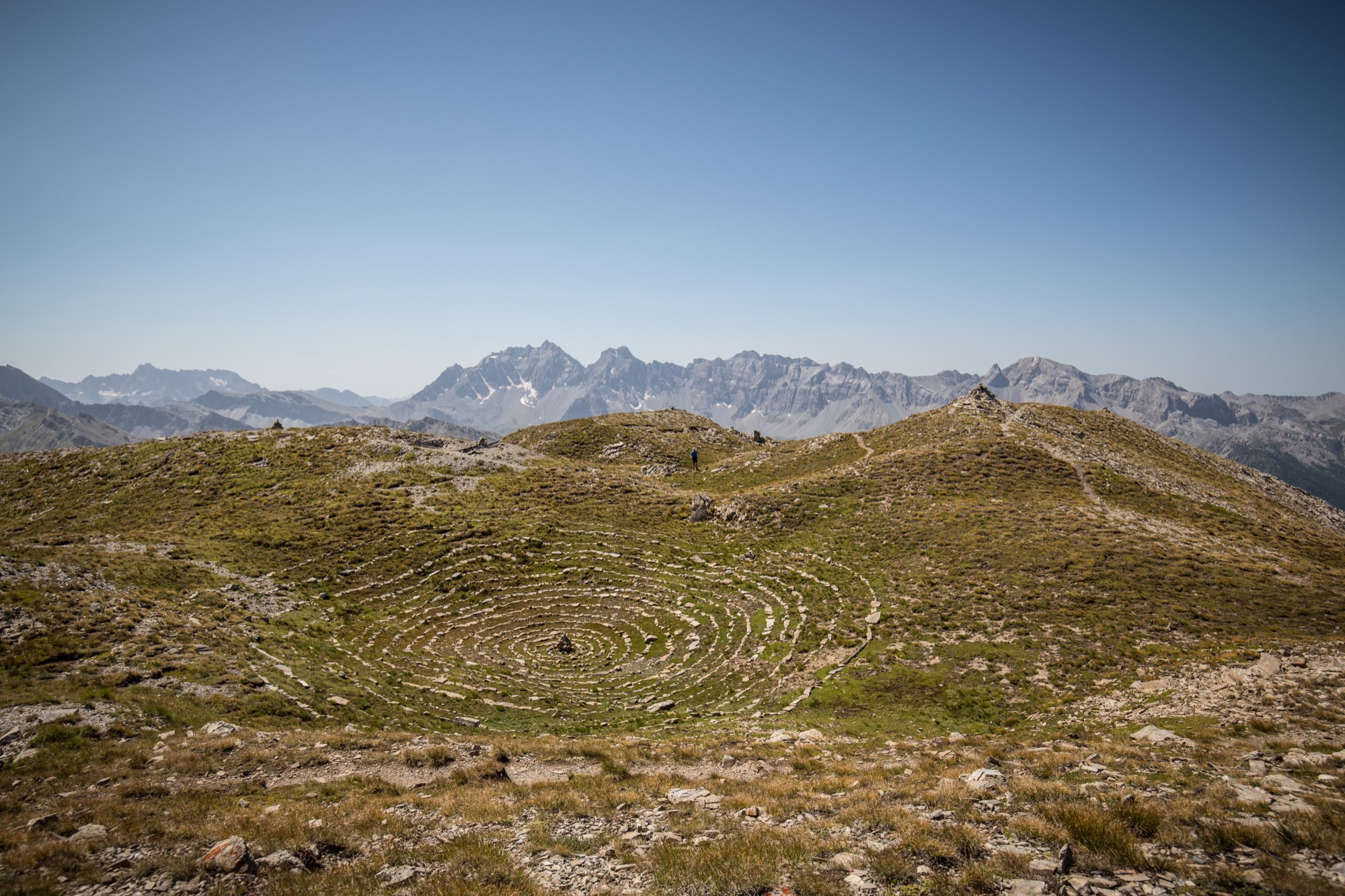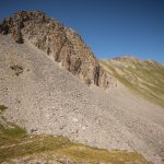 Un dernier bout de pente pas forcément plus abrupt permet donc d’atteindre la zone sommitale de la Tête de Jacquette, à 2757 mètres. Au sud, la crête du Marcous est bien visible, tout comme celle nettement plus massive abritant la Main de Dieu et les pics de la Font Sancte. C’est un peu plus diffus au nord avec les sommets dominant Saint-Véran mais dans le lointain, on voit bien le Viso et ses grands voisins ! Au sommet de la Tête de Jacquette, on trouve également quelques anciennes habitations effondrées mais aussi et surtout une grande spirale de pierres… Bon. Au moins, ça fait plein de cailloux où s’asseoir pour le déjeuner avant d’entamer la descente et filer vers les Orres ! Pas une randonnée indispensable mais clairement un joli bout de balade que l’on doit pouvoir rendre “en boucle” en partant de Saint-Véran et en longeant les jolies crêtes…