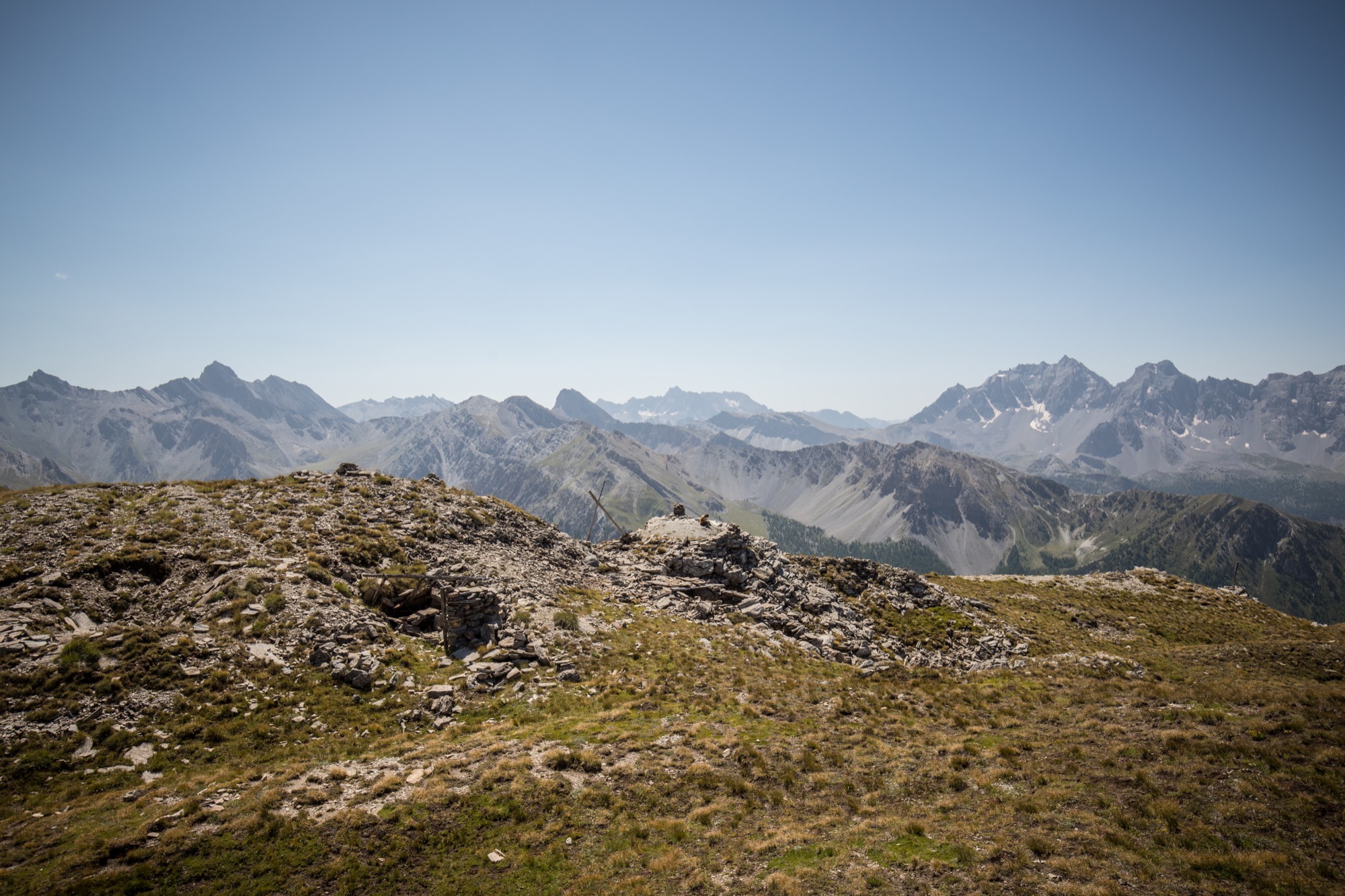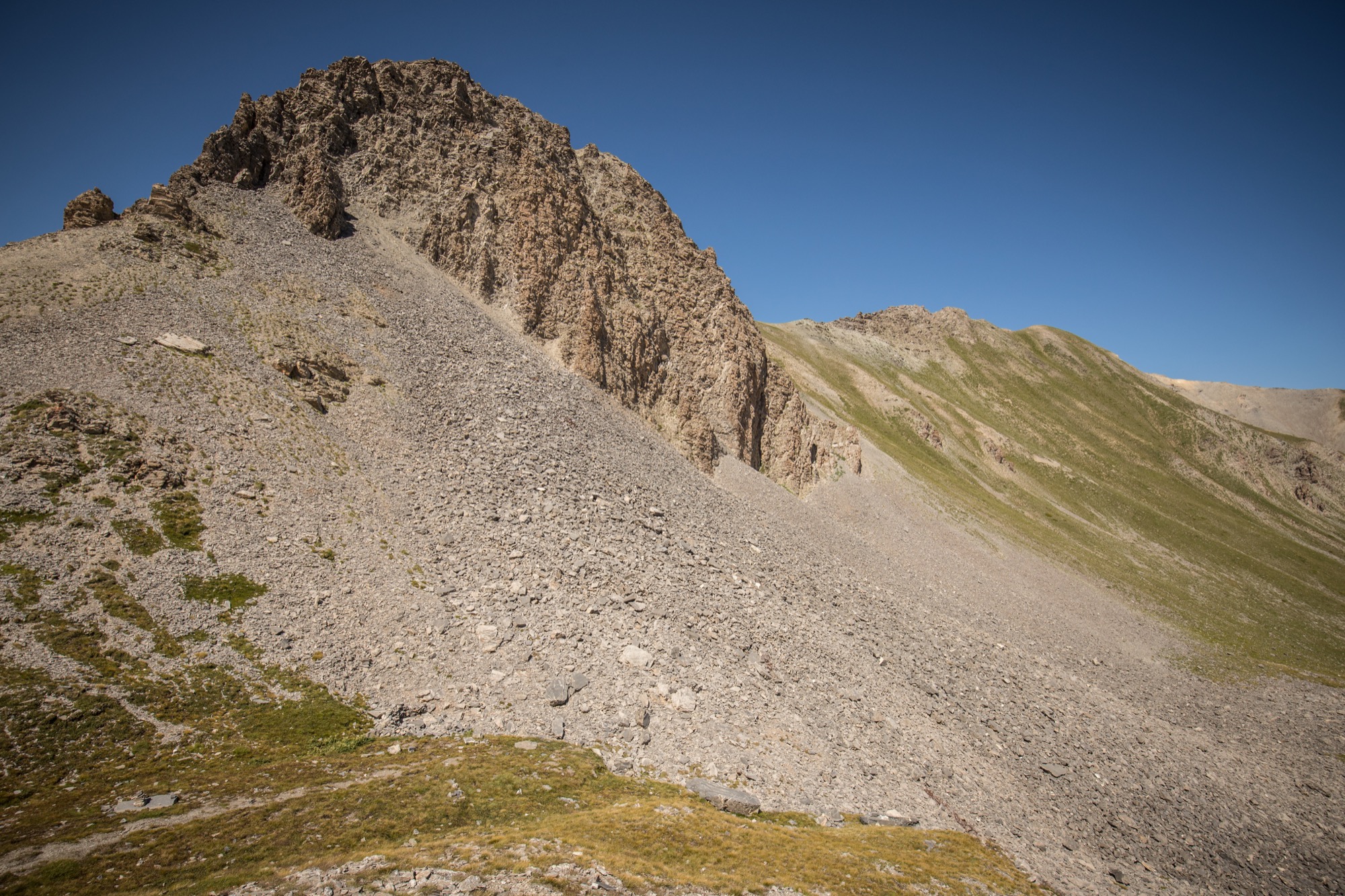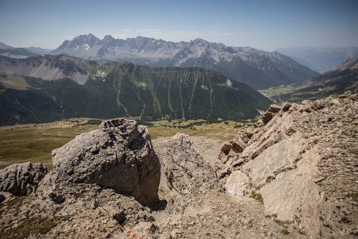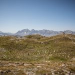 Un dernier bout de pente pas forcément plus abrupt permet donc d’atteindre la zone sommitale de la Tête de Jacquette, à 2757 mètres. Au sud, la crête du Marcous est bien visible, tout comme celle nettement plus massive abritant la Main de Dieu et les pics de la Font Sancte. C’est un peu plus diffus au nord avec les sommets dominant Saint-Véran mais dans le lointain, on voit bien le Viso et ses grands voisins ! Au sommet de la Tête de Jacquette, on trouve également quelques anciennes habitations effondrées mais aussi et surtout une grande spirale de pierres… Bon. Au moins, ça fait plein de cailloux où s’asseoir pour le déjeuner avant d’entamer la descente et filer vers les Orres ! Pas une randonnée indispensable mais clairement un joli bout de balade que l’on doit pouvoir rendre “en boucle” en partant de Saint-Véran et en longeant les jolies crêtes…