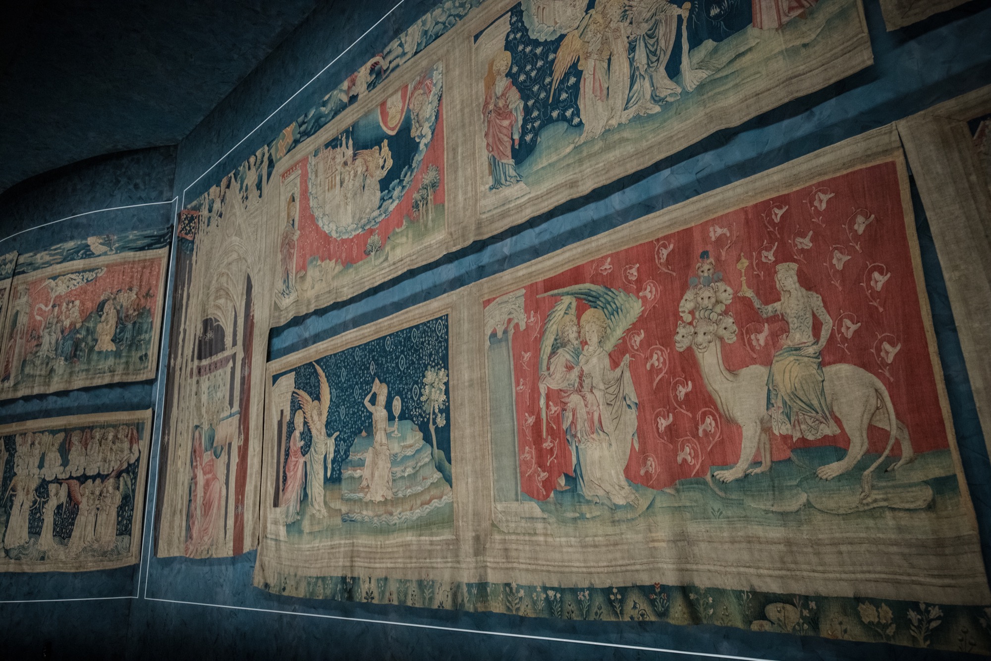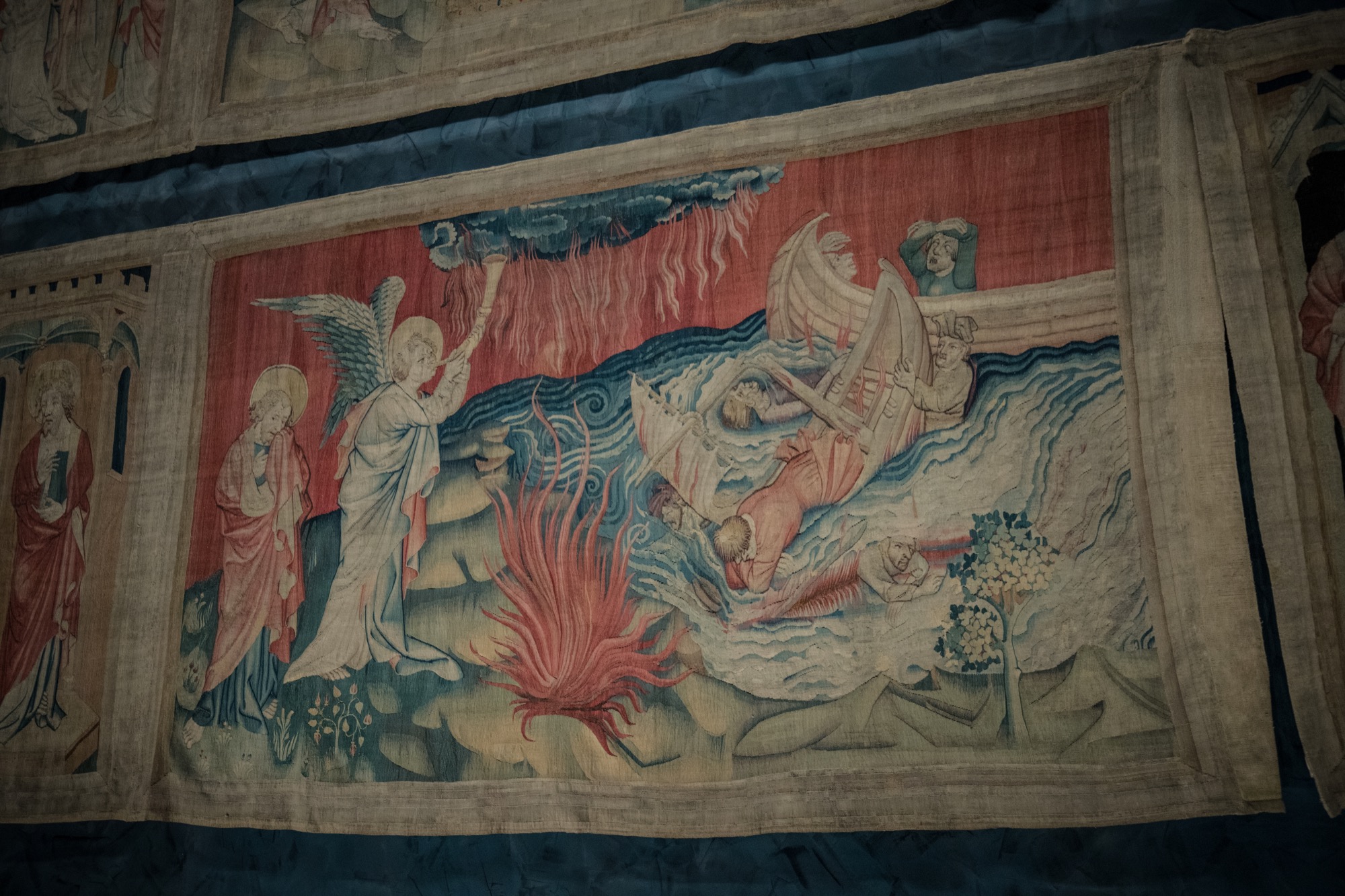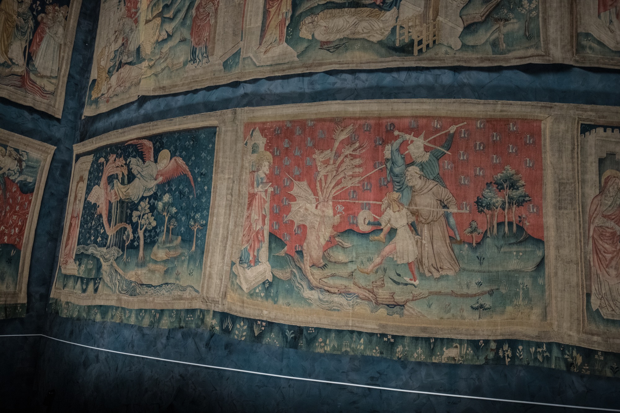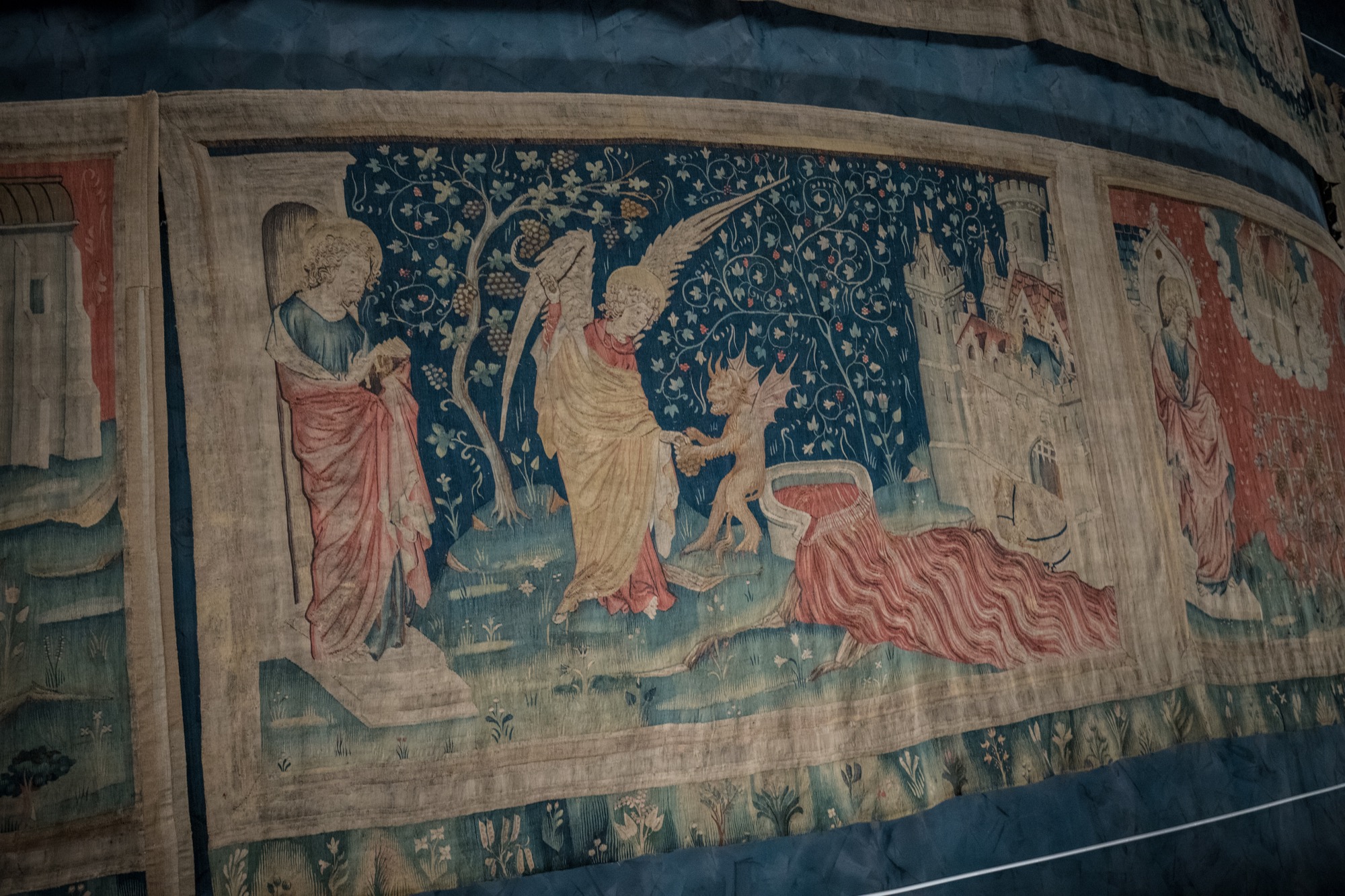 Tout ces panneaux tissés, longs de 103 mètres de long sur 4,5 de haut en moyenne, datent d’il y a plus de 600 ans ! Elle faisait même 140 mètres de long à l’origine… et c’est un miracle que cette exceptionnelle commande ait traversé les siècles, représentant encore aujourd’hui l’Apocalypse vue par Saint Jean sur l’île de Patmos. On perçoit du relief ici et là sur les panneaux, des ombres, quelques éléments modernes aussi. En fait, on pourrait passer des heures à la contempler, tableau par tableau.