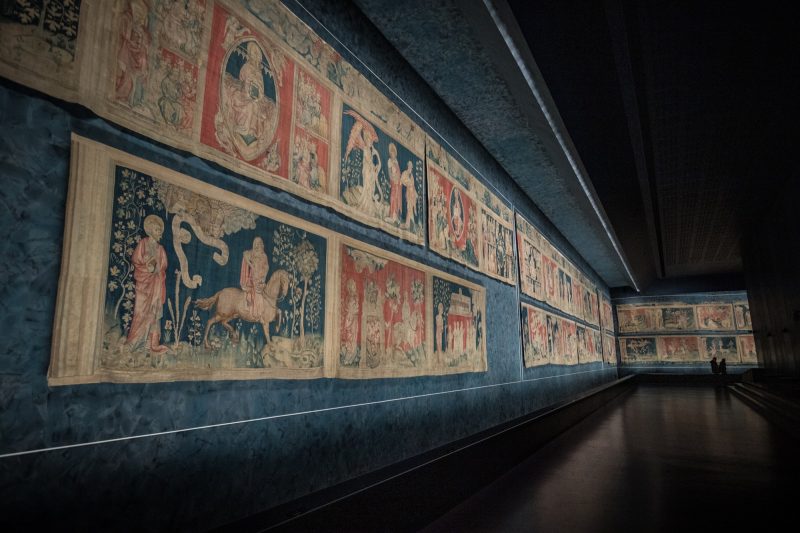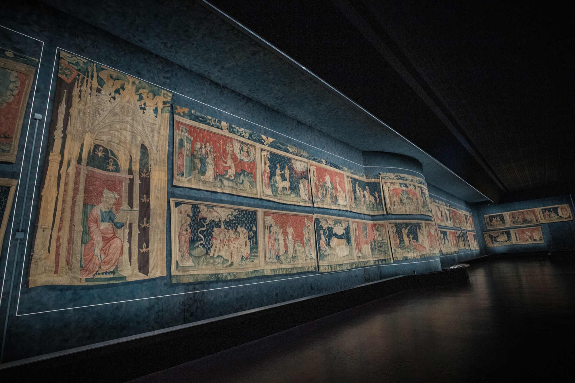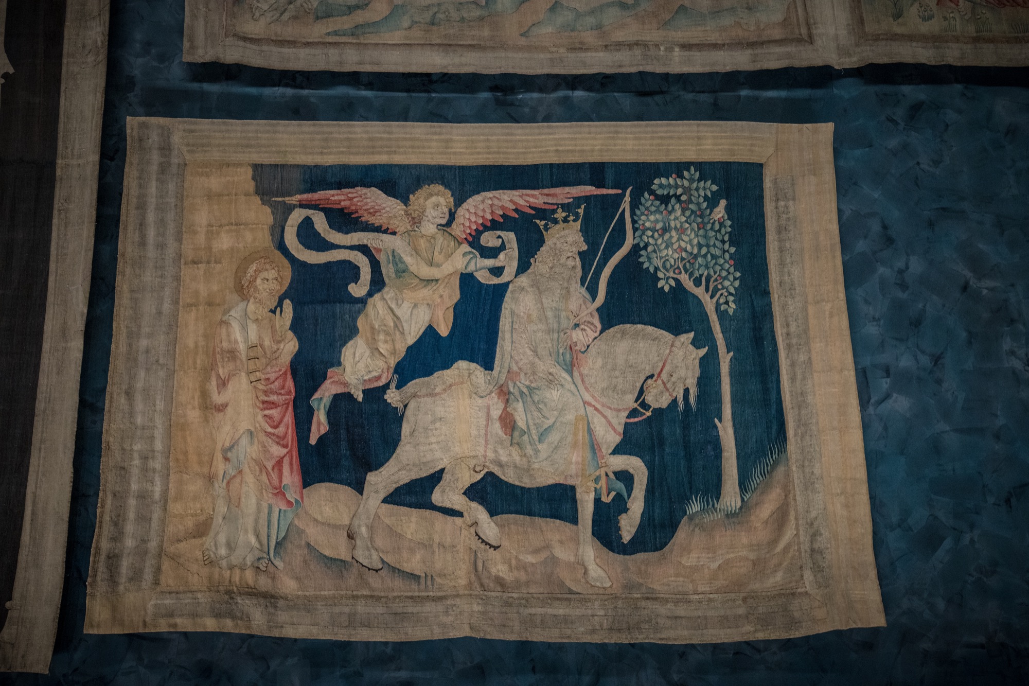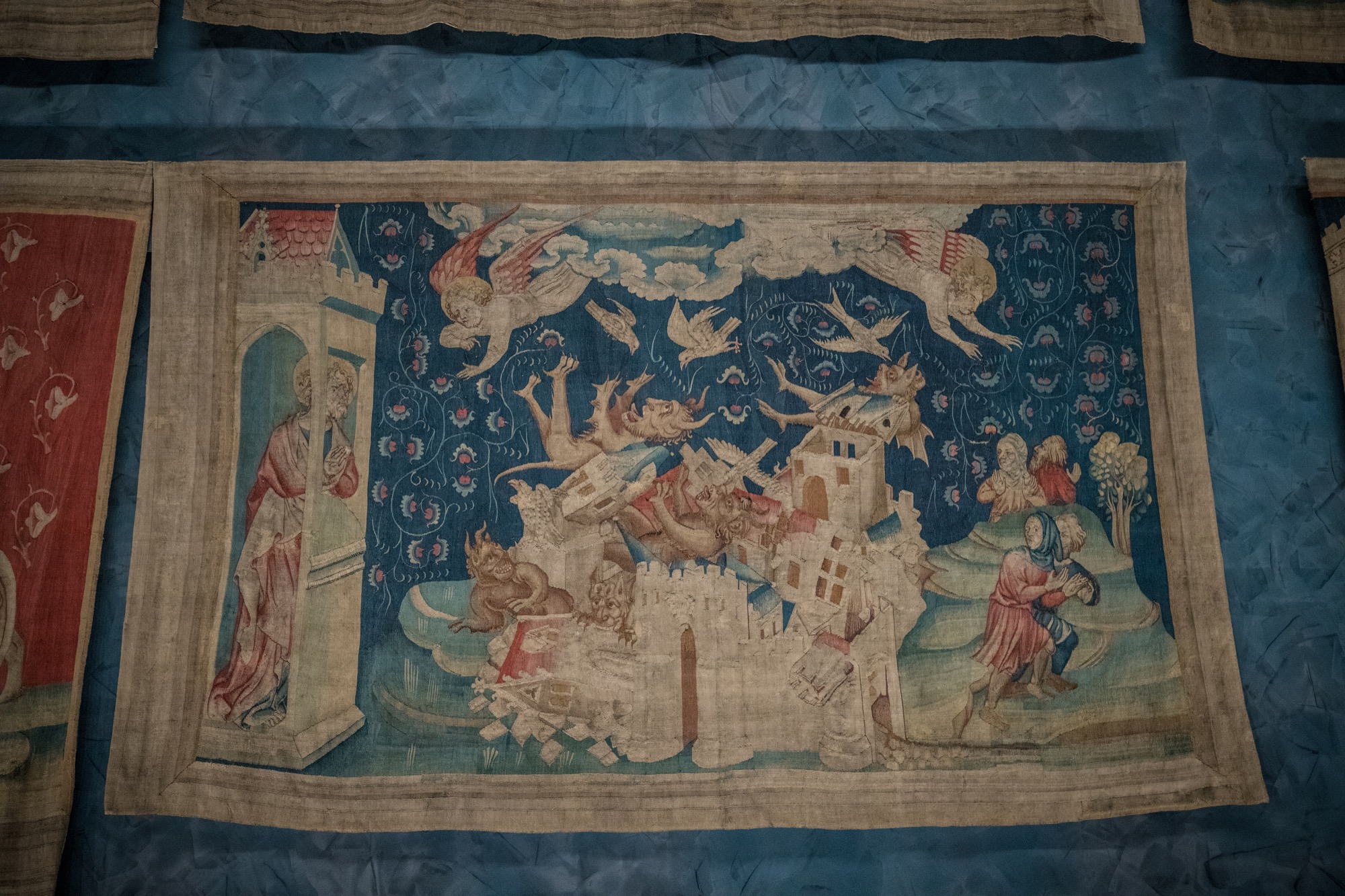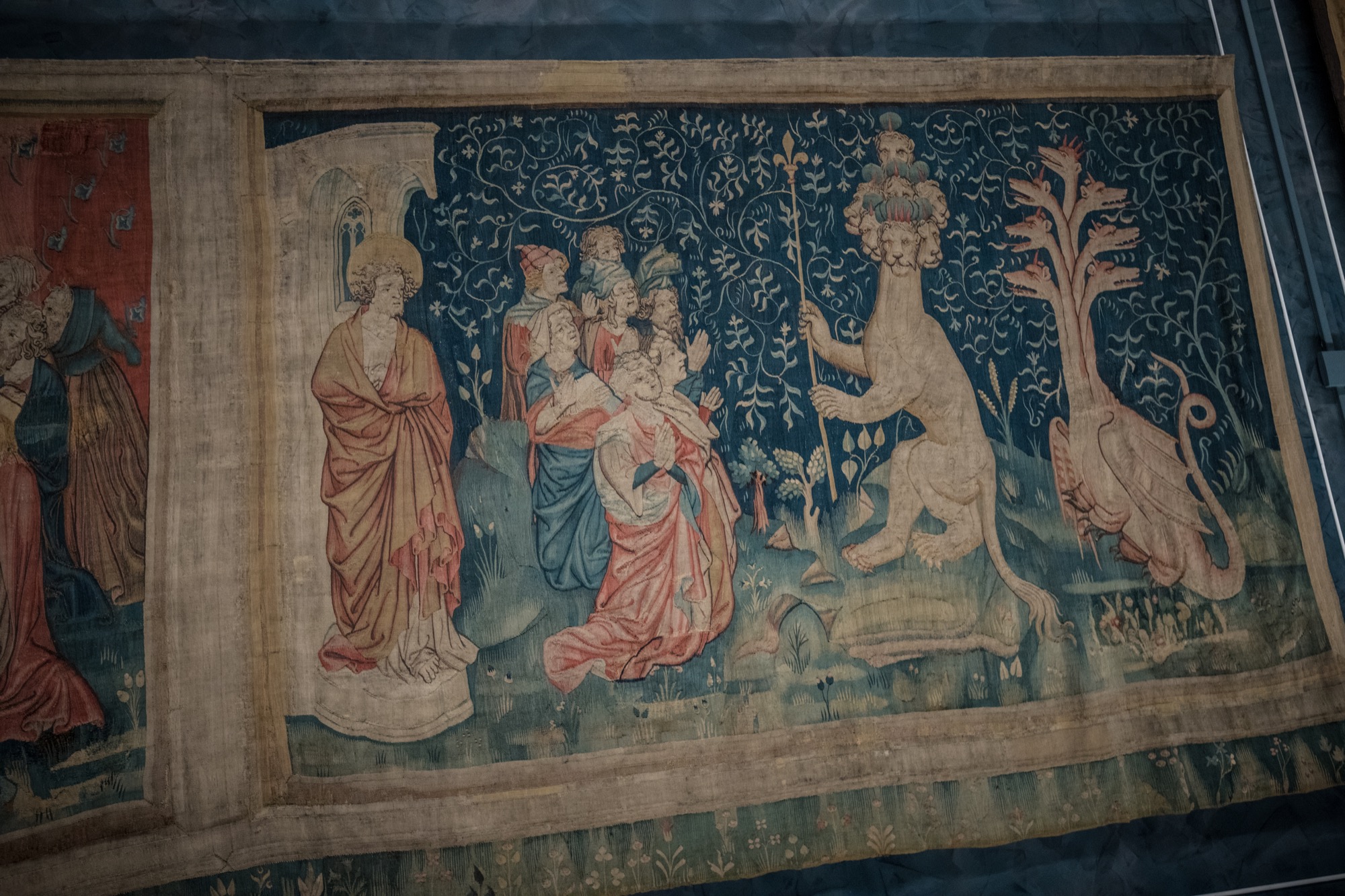 Tout ces panneaux tissés, longs de 103 mètres de long sur 4,5 de haut en moyenne, datent d’il y a plus de 600 ans ! Elle faisait même 140 mètres de long à l’origine… et c’est un miracle que cette exceptionnelle commande ait traversé les siècles, représentant encore aujourd’hui l’Apocalypse vue par Saint Jean sur l’île de Patmos. On perçoit du relief ici et là sur les panneaux, des ombres, quelques éléments modernes aussi. En fait, on pourrait passer des heures à la contempler, tableau par tableau.