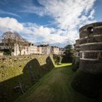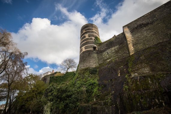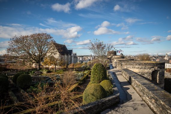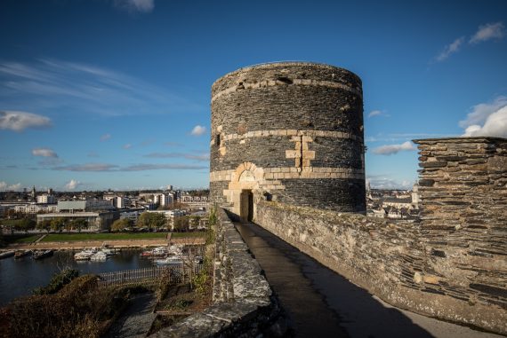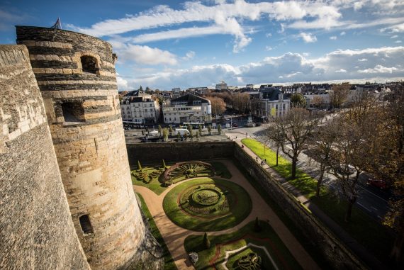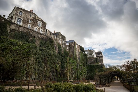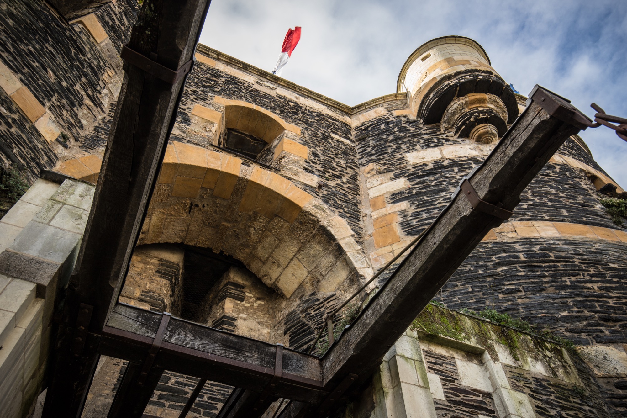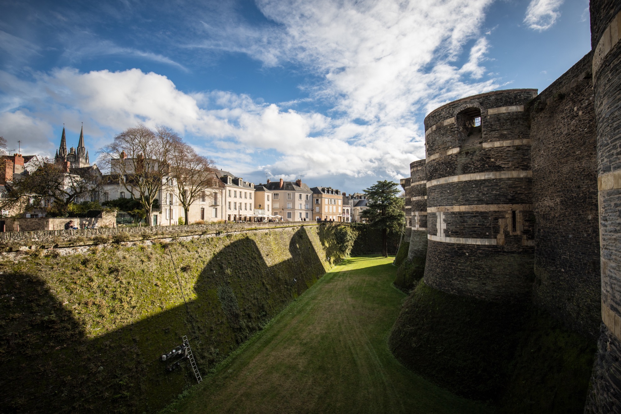 Quelques maisons de la cité se laissent voir sur les abords du château, que l’on continue de contourner pour rejoindre l’entrée principale et désormais unique moyen de pénétrer dans ses murs. Les douves sont tout aussi impressionnantes de ce côté, avec au bout de la promenade le “bout du monde”, une balustrade offrant une superbe vue sur le Maine et le quartier de la Doutre.
