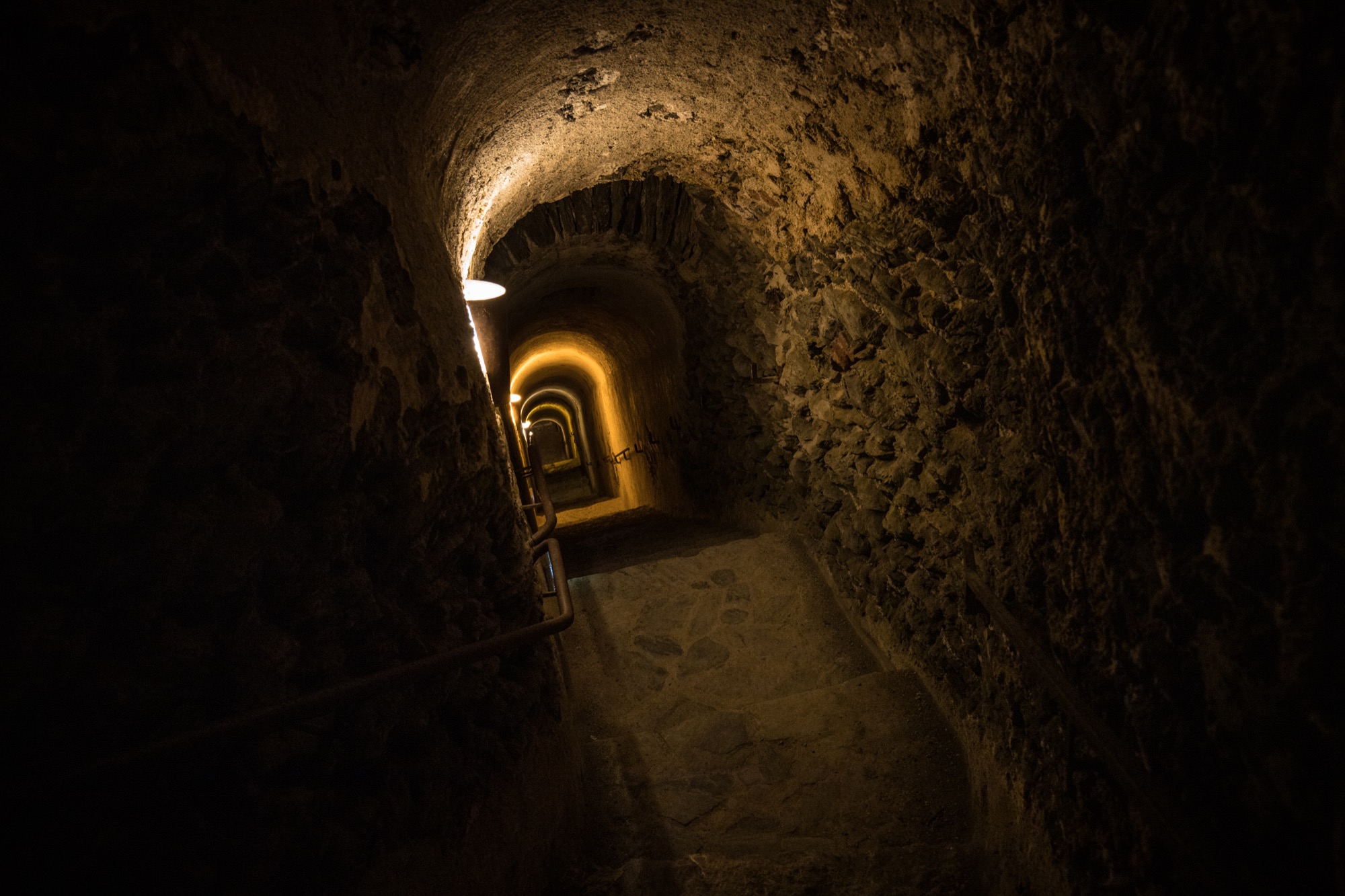 La journée commence sur le parking faisant face au centre-ville de Prats-de-Mollo. La météo est tristounette mais la ville n’en est pas moins splendide, avec son immense église et les restes de ses remparts. On imagine volontiers l’allure que pouvait avoir la ville avant que ses remparts ne soient abattus. La trace m’emmène à travers rues et me fait contourner la place fortifiée de l’église pour rejoindre le débouché des tunnels d’accès au fort Lagarde.
