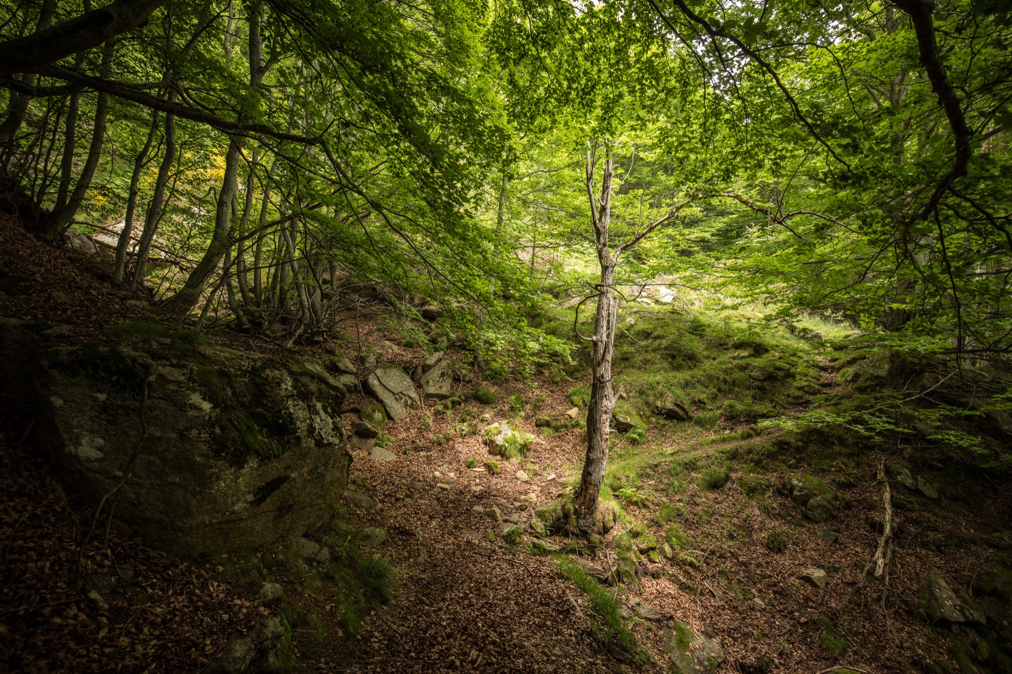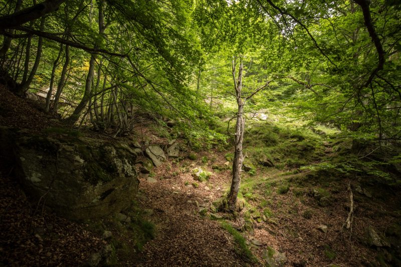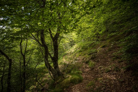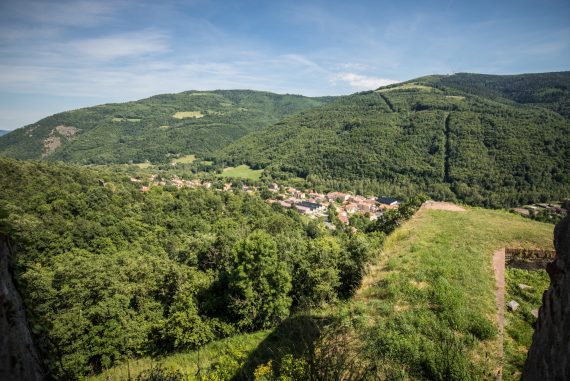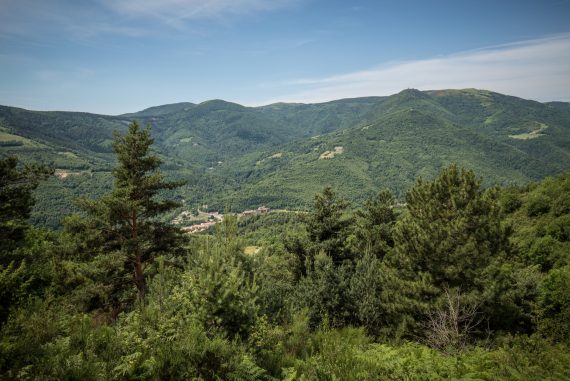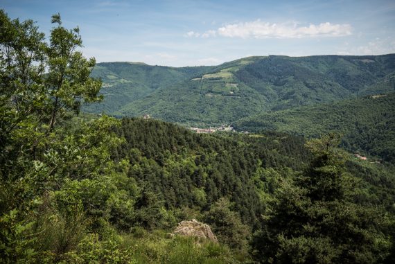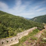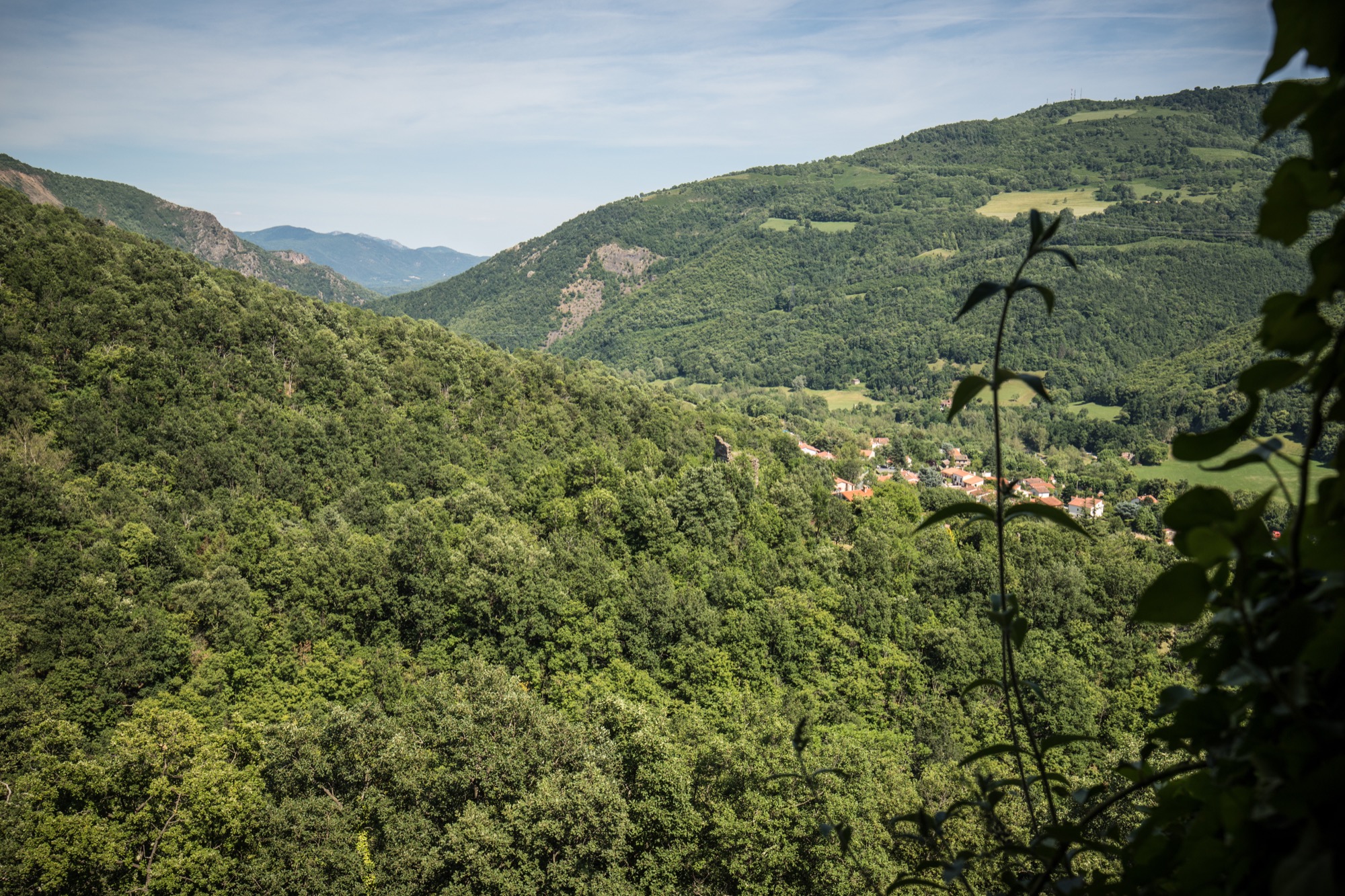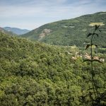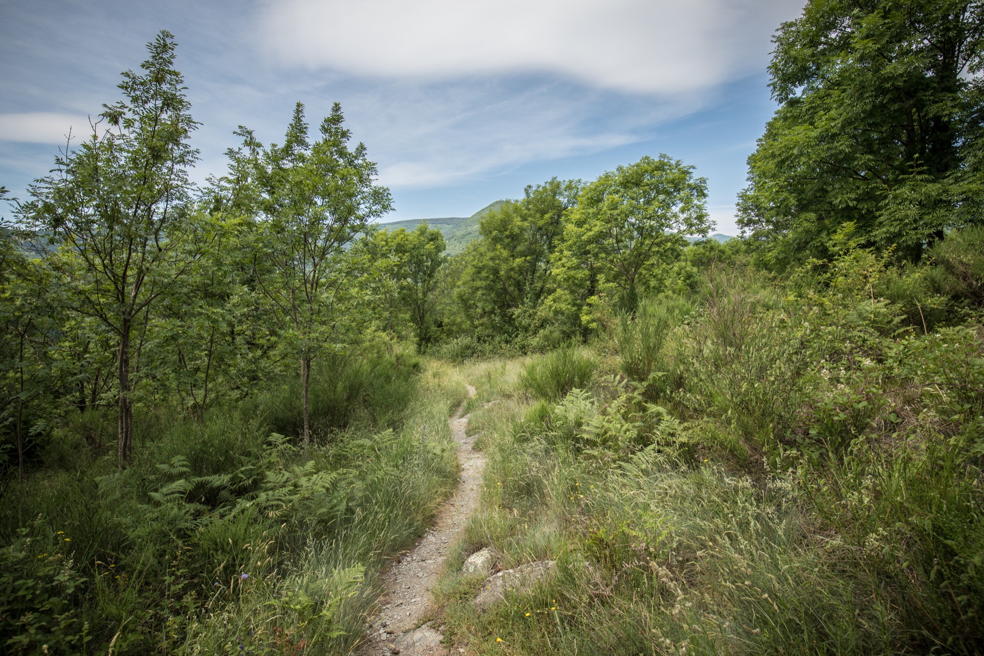 La suite de la randonnée est une belle ascension progressive à travers des paysages variés. On passe d’abord à travers des bois, pour rejoindre une zone plus clairsemée offrant de jolies vues sur la ville, le fort Lagarde mais aussi la vallée en général et plus loin, la Tour du Mir. On s’engage ensuite dans une forêt plus dense où l’ambiance est agréable, légèrement mystérieuse.