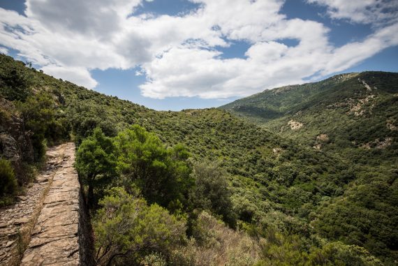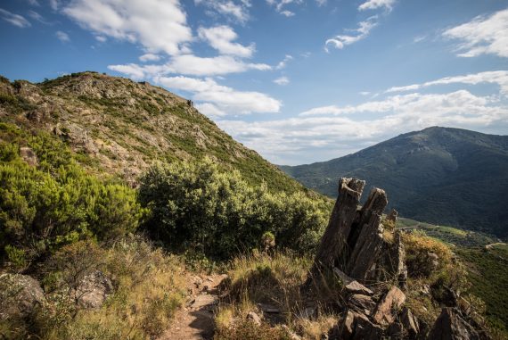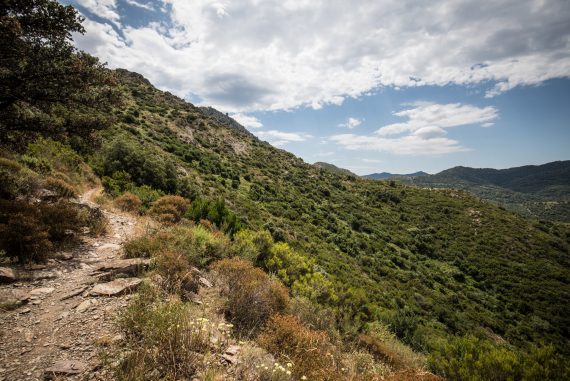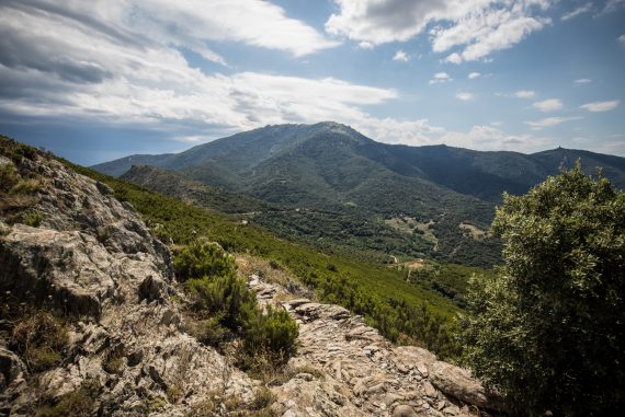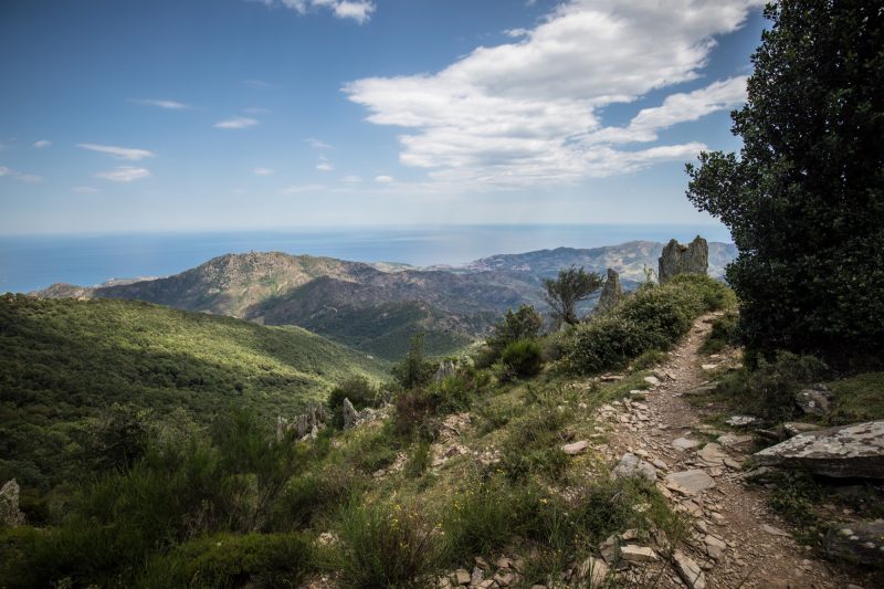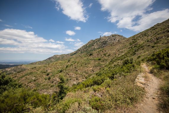Le départ se fait depuis le Coll de la Serra où un parking accueille de nombreuses voitures, la plupart des visiteurs allant voir la Tour Madeloc. Pour ma part, je bifurque à droite pour une belle section de sentier peu ou prou horizontale. On contourne alors tout l’éperon rocheux au sommet duquel se niche la tour, dominant quelques vignes ici et là et surtout en ayant en ligne de mire l’objectif du jour, le Puig de Sallfort.