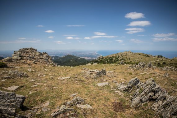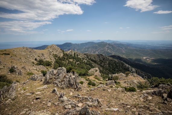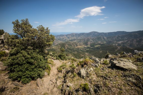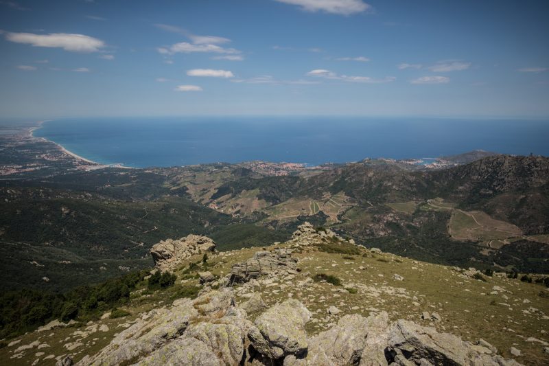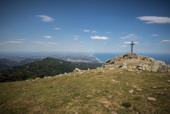 Au sud, un amas rocailleux ouvre la vue sur la Catalogne du Sud et sur les Albères, avec la plaine de Perpignan à leurs pieds. Plus au nord, un autre amas rocailleux m’attire mais il faut en réalité le dépasser pour découvrir une croix et un point de vue absolument remarquable sur toute la Côte Vermeille et ses villages. Splendide !