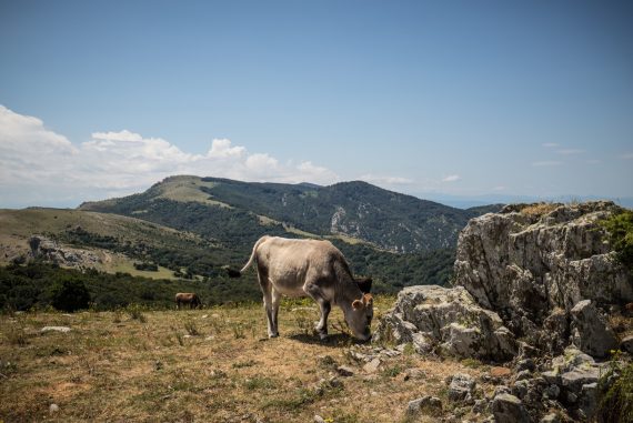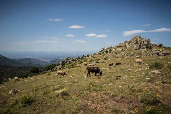 Le kilomètre et demi est à dire vrai rapidement avalé pour ce qui me concerne et me voici au sommet du Puig de Sallfort. Un grand troupeau de vaches y est établi, se déployant entre les multiples sommets rocailleux qui font le Sallfort. Le sommet n’est pas une pointe, plutôt un gros plateau avec quelques piques aux sommets desquelles il faut grimper pour découvrir le paysage.