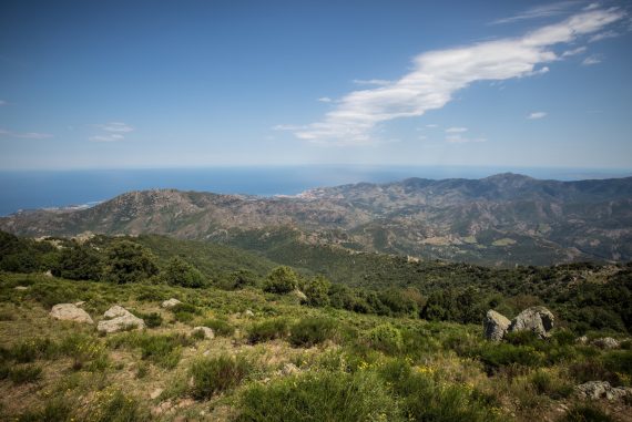 Le sentier qui monte à la Tour Madeloc est à peine balisé et cairné mais reste facilement identifiable avec quelques points blancs et jaunes, quelques cairns et une végétation laissant un sentier pour ainsi dire permanent. Il faut se battre un peu avec le maquis par endroits et mettre également les mains dans une petite cheminée qui monte aux vestiges des remparts de l’enceinte ; c’est ludique à défaut d’être facile et ça fait une bonne suée de quelques centaines de mètres de D+ pour se finir les jambes !