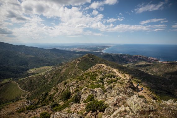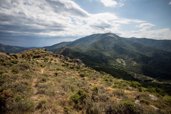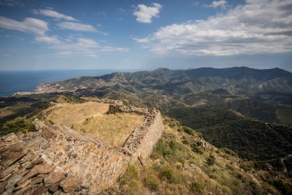 On la rejoint et on la contourne afin de prendre le chemin de la descente, assez vertigineuse et technique par endroits. Les jambes fatiguent doucement, aspirant à l’arrivée du Coll de la Serra qui est encore bien loin ! Le sentier dépasse une ancienne batterie de défense de la frontière avec l’Espagne avant de plonger enfin, brutalement, vers le col. Fin de la balade, décidément superbe, avec cette vue de fin de journée sur Collioure et sur la côte pour finir.