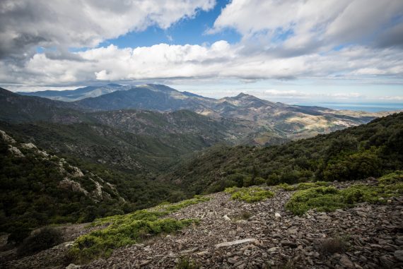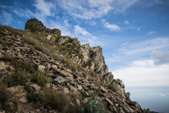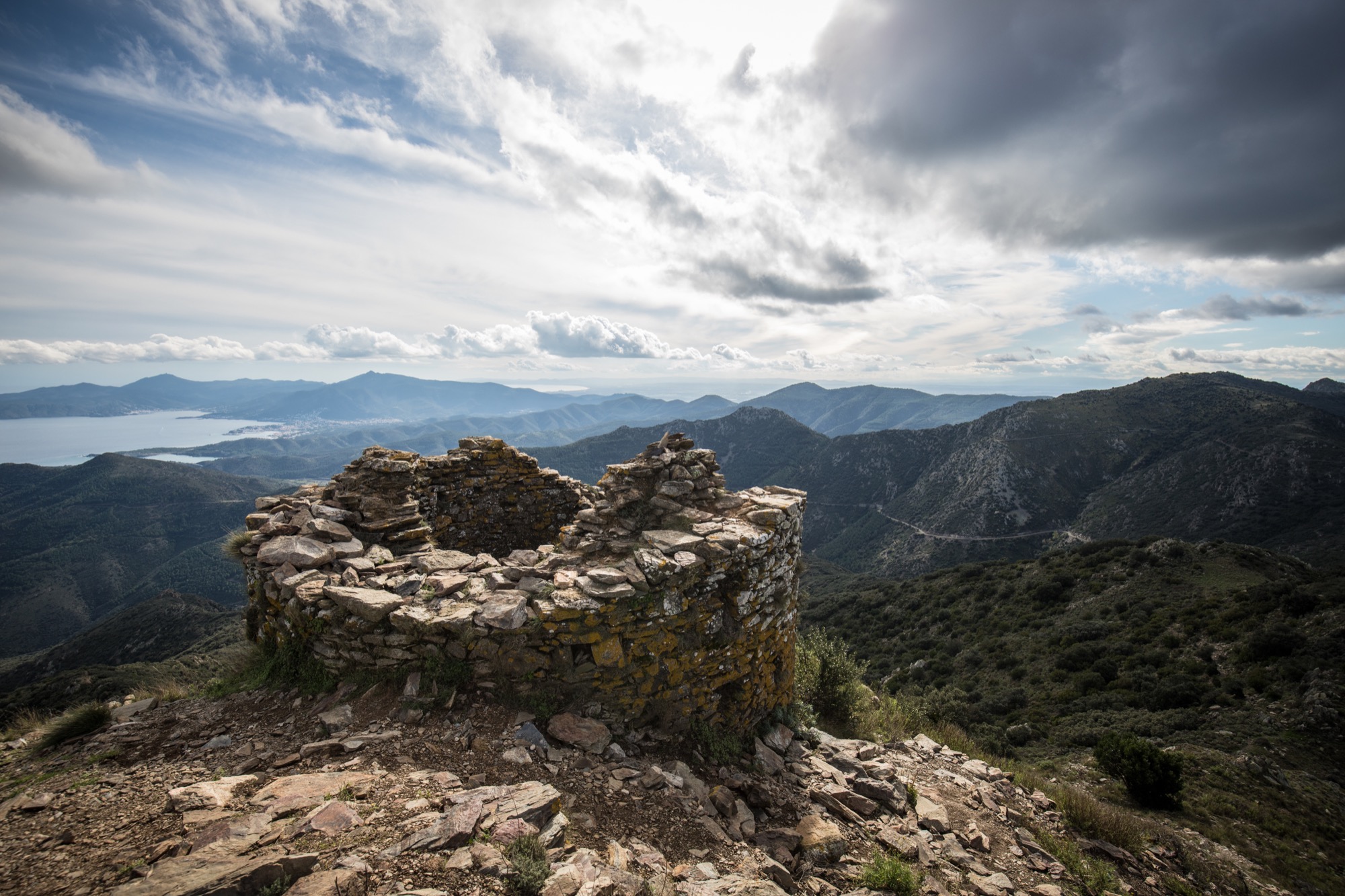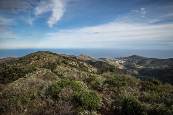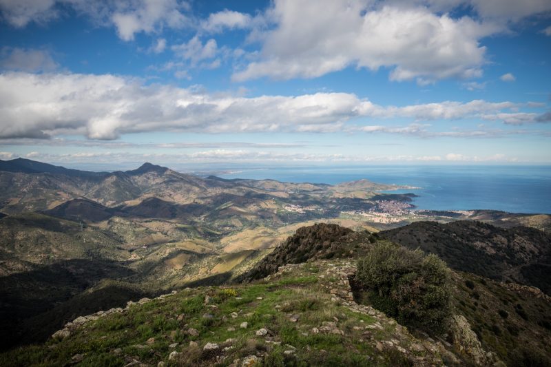 On atteint alors le col de Rumpissa, marquant la frontière entre France et Espagne. Cerbère se laisse entrevoir, tout comme PortBou et le cap de Creus. Le paysage, depuis le col, est superbe, mais il ne l’est pas encore tout à fait autant que la vue depuis Torre de Querroig, quelques minutes plus et plus haut en suivant la crête vers la mer.