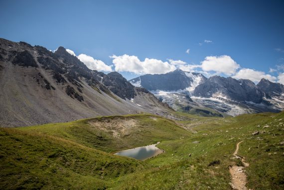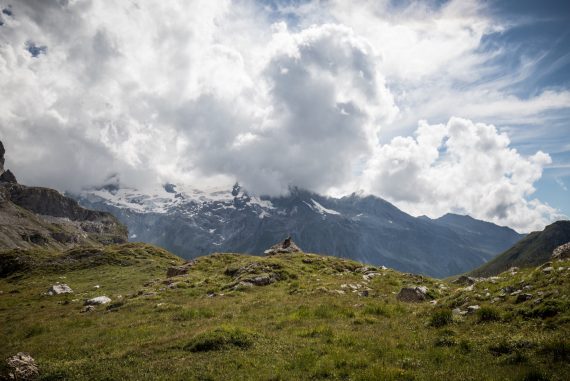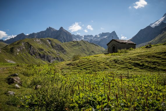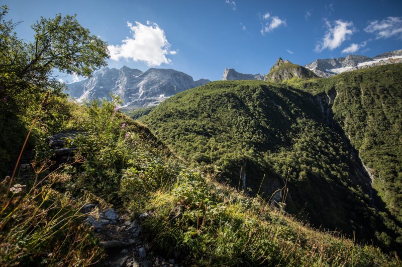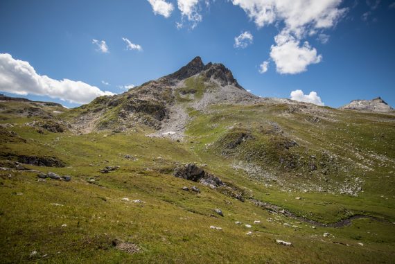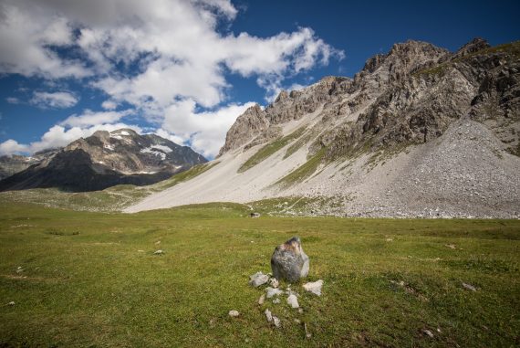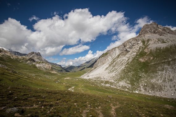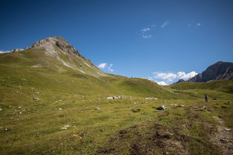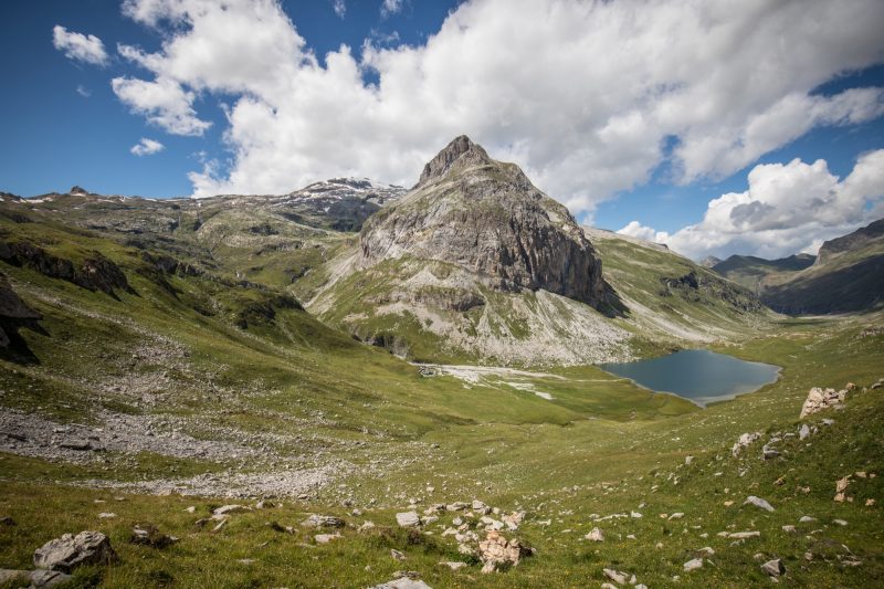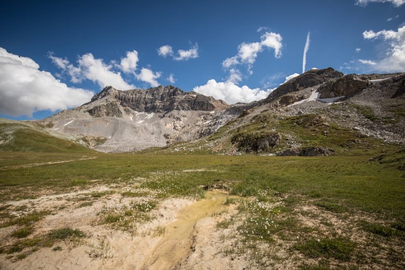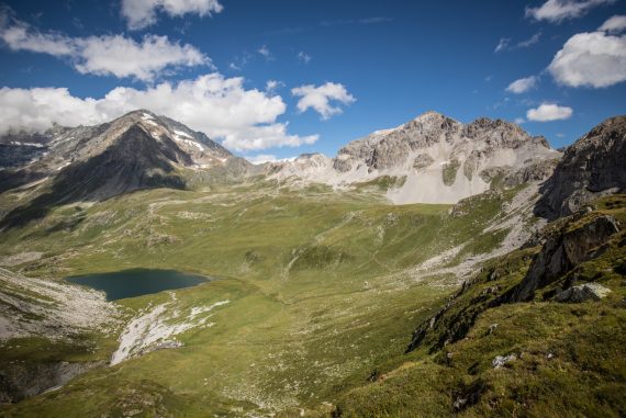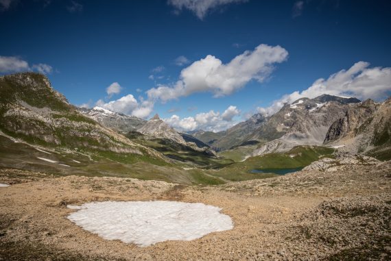 Revenons à l’aspect remarquable : cette section du sentier emprunte le GR5 et descend doucement dans une grande vallée avec une bergerie paumée au milieu de nulle part et de superbes sommets alentours. Mais le meilleur est à venir quand un sentier se démarque à gauche et dévoile au bout de quelques centaines de mètres une vue démente sur le Mont-Blanc de Peisey et tout le massif du Mont Pourri, avec au centre le lac de la Plagne.
