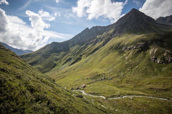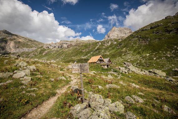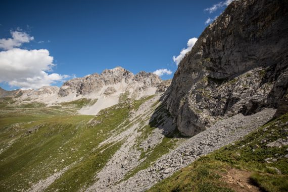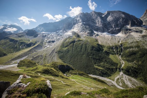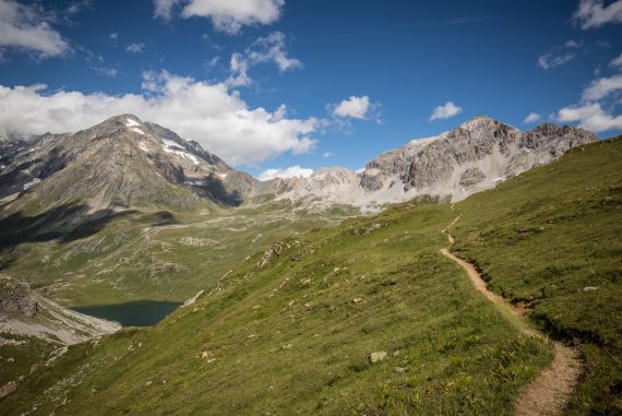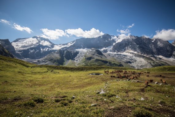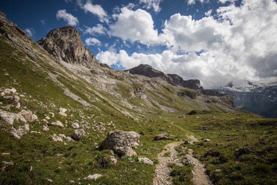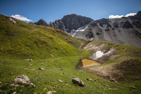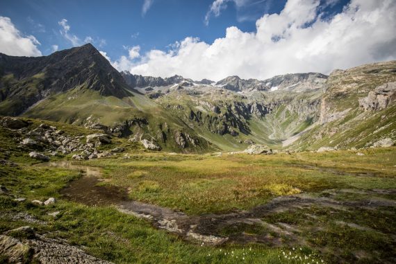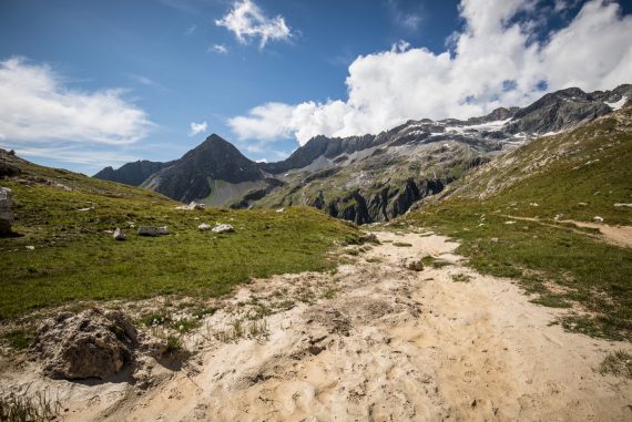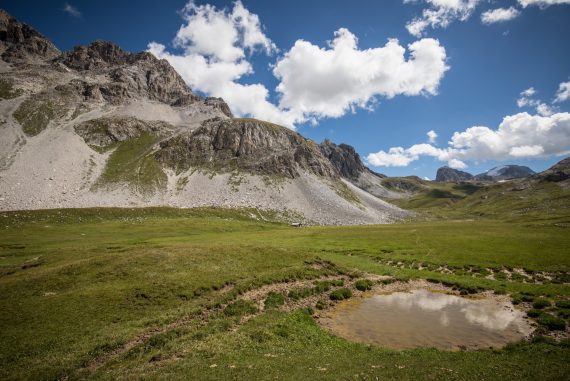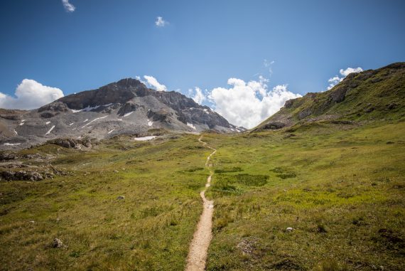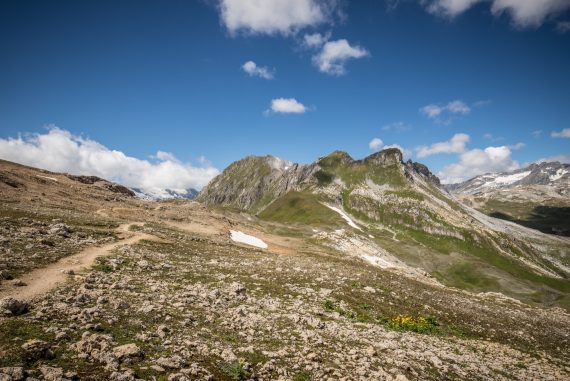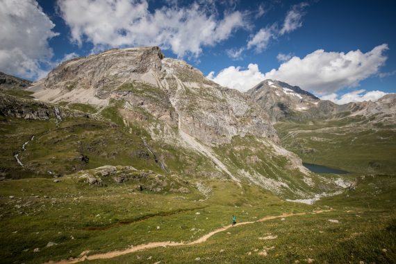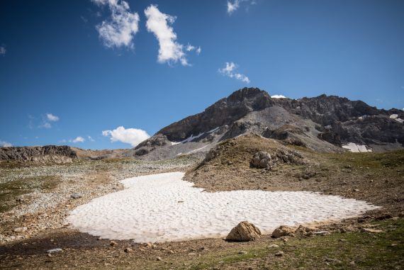 Revenons à l’aspect remarquable : cette section du sentier emprunte le GR5 et descend doucement dans une grande vallée avec une bergerie paumée au milieu de nulle part et de superbes sommets alentours. Mais le meilleur est à venir quand un sentier se démarque à gauche et dévoile au bout de quelques centaines de mètres une vue démente sur le Mont-Blanc de Peisey et tout le massif du Mont Pourri, avec au centre le lac de la Plagne.