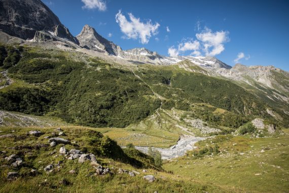 Dès le début de cette randonnée, les paysages sont écrasants de beauté. Le Grand Bec, La pointe des Volnets, celle de la Grande Glière ou encore l’immense et majestueuse Grande Casse dominent le paysage, leurs falaises abruptes plongeant vers le Doron de Champagny. Vues incroyables de si bon matin.