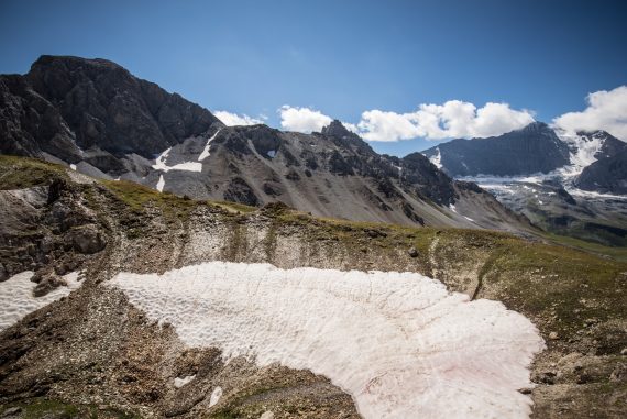 Après une traversée d’un pierrier et après avoir réussi à dévisser son regard de cet autre très photogénique Mont-Blanc, il faut encore finir de grimper quelques mètres particulièrement pentus, jusqu’au col du Plan Séry. L’ambiance est alpine, nettement plus minérale avec la proximité de la pointe du Vallaisonnay, il y a un petit parfum d’Ecrins, alors que la Vanoise est radicalement plus verte, y compris dans cette plage des 2600 et quelques mètres.