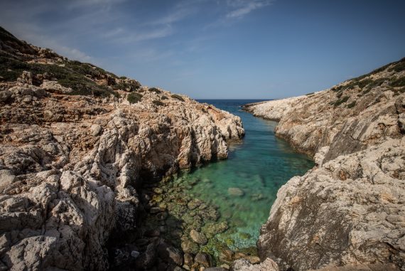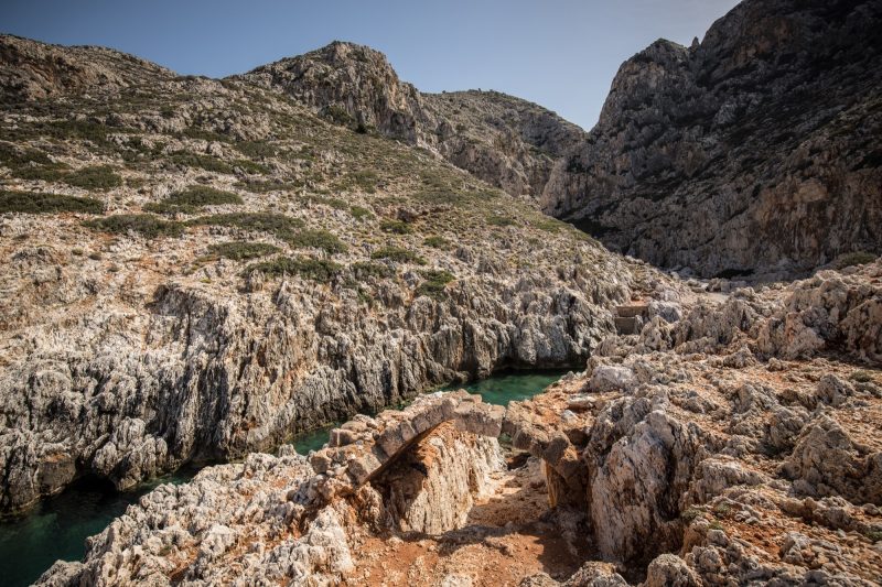 La balade pourrait s’arrêter là et s’arrête d’ailleurs là pour beaucoup… C’est bien dommage car après la grotte et le monastère, il y a les gorges de Katholiko et au bout, la mer ! Pour cela, il faut rejoindre le lit de la rivière et passer sous le pont massif du monastère. On crapahute alors en compagnie de quelques chèvres jusqu’à une petite crique de toute beauté.