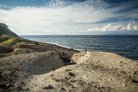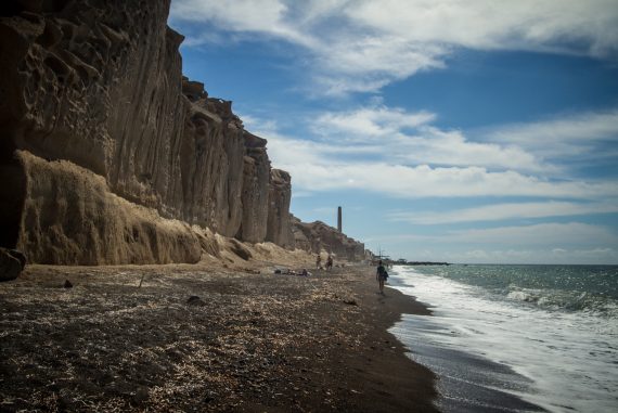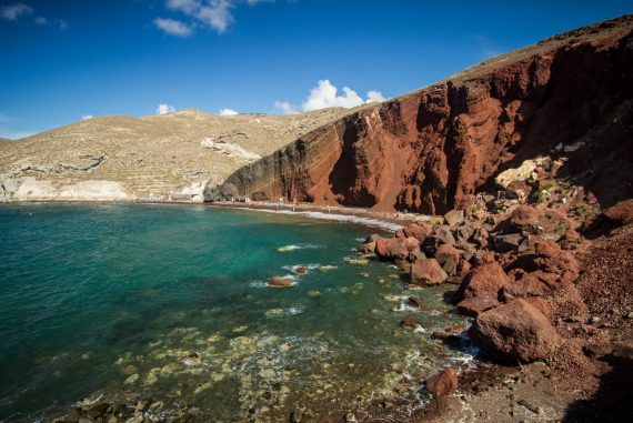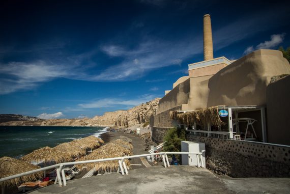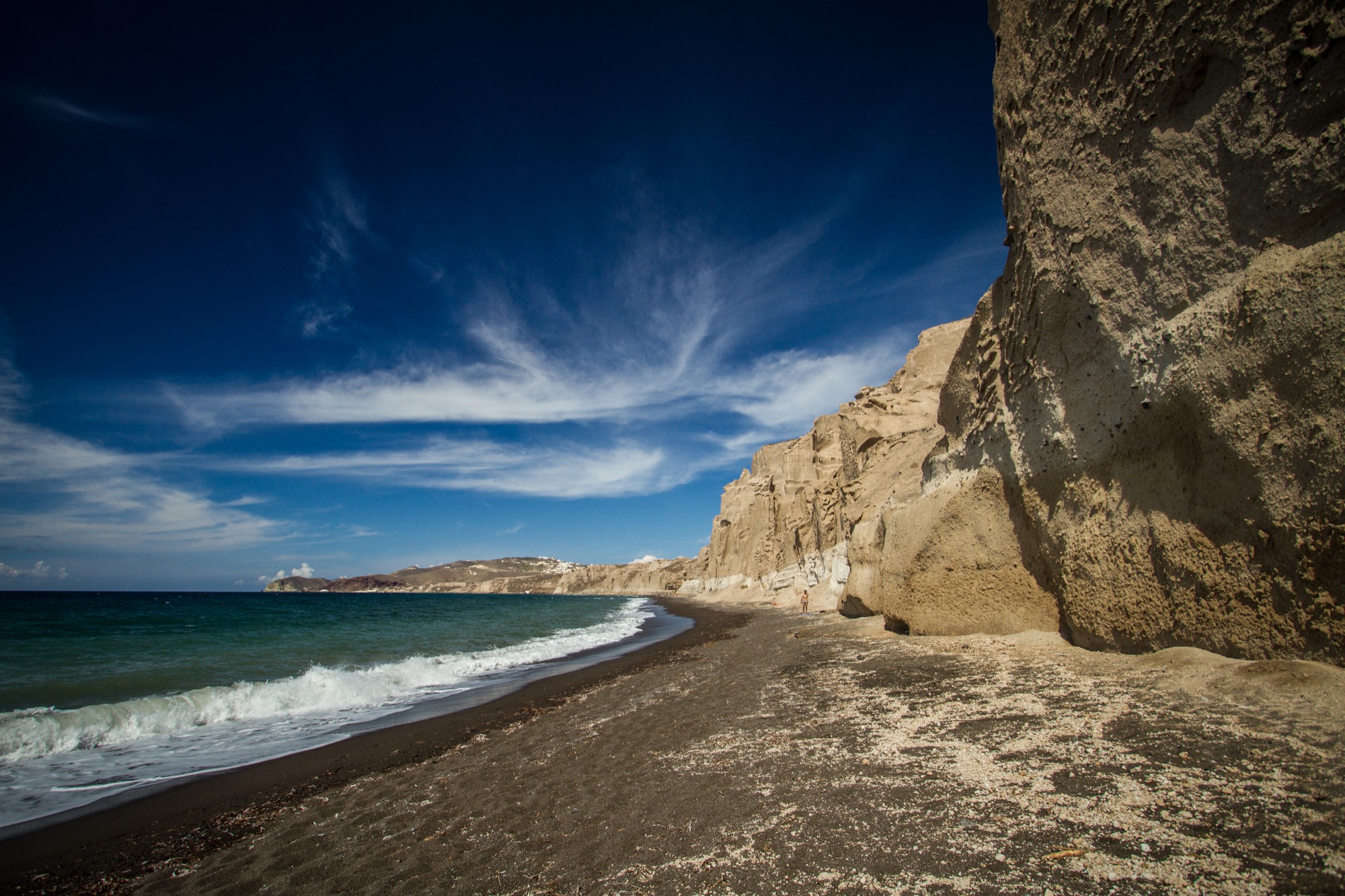 Je profite de la proximité de Red Beach pour aller y jeter un oeil mais il y a définitivement trop de monde pour envisager une baignade. Alors direction Vlichada. Ce petit village, dominé par les cheminées d’une ancienne usine de je ne sais quoi, donne sur une plage magnifique, battue par les fortes vagues du sud, soyez prudents avant de vous jeter dans les flots ! Derrière, les falaises sont sculptées, splendides. A noter : les gens sont habillés au début, pas du tout au milieu de la plage, entre Vlichada et le Theros Wave Bar, sur un autre petit bout de plage au loin. Par-fait.