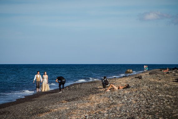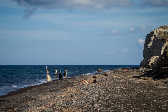 Je remonte ensuite vers le nord, mais en longeant la mer côté est, loin de la caldeira. Entre Panagia Kalou, Koloumpos et Paradisos, il y a de quoi se poser tranquillement pour une dernière baignade. Il y a également de quoi assister à une scène surréaliste mêlant un homme nu et des mariés chinois qui font leurs photos de mariage. A côté de l’homme nu. Fort heureusement, ils ne sont pas venus à côté de moi, sinon je crois que je me serais levé pour aller poser à côté d’eux.