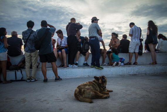 Oia, enfin. Le coucher de soleil est décevant, cette fois. Il y a tellement de monde, comparé à cette journée où je me suis baladé de coin tranquille en coin tranquille ! Même ce chien semble dépité. Je repars après un dernier verre, vue sur la caldeira, payé à prix d’or.