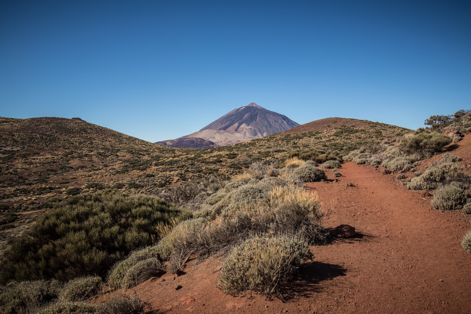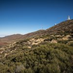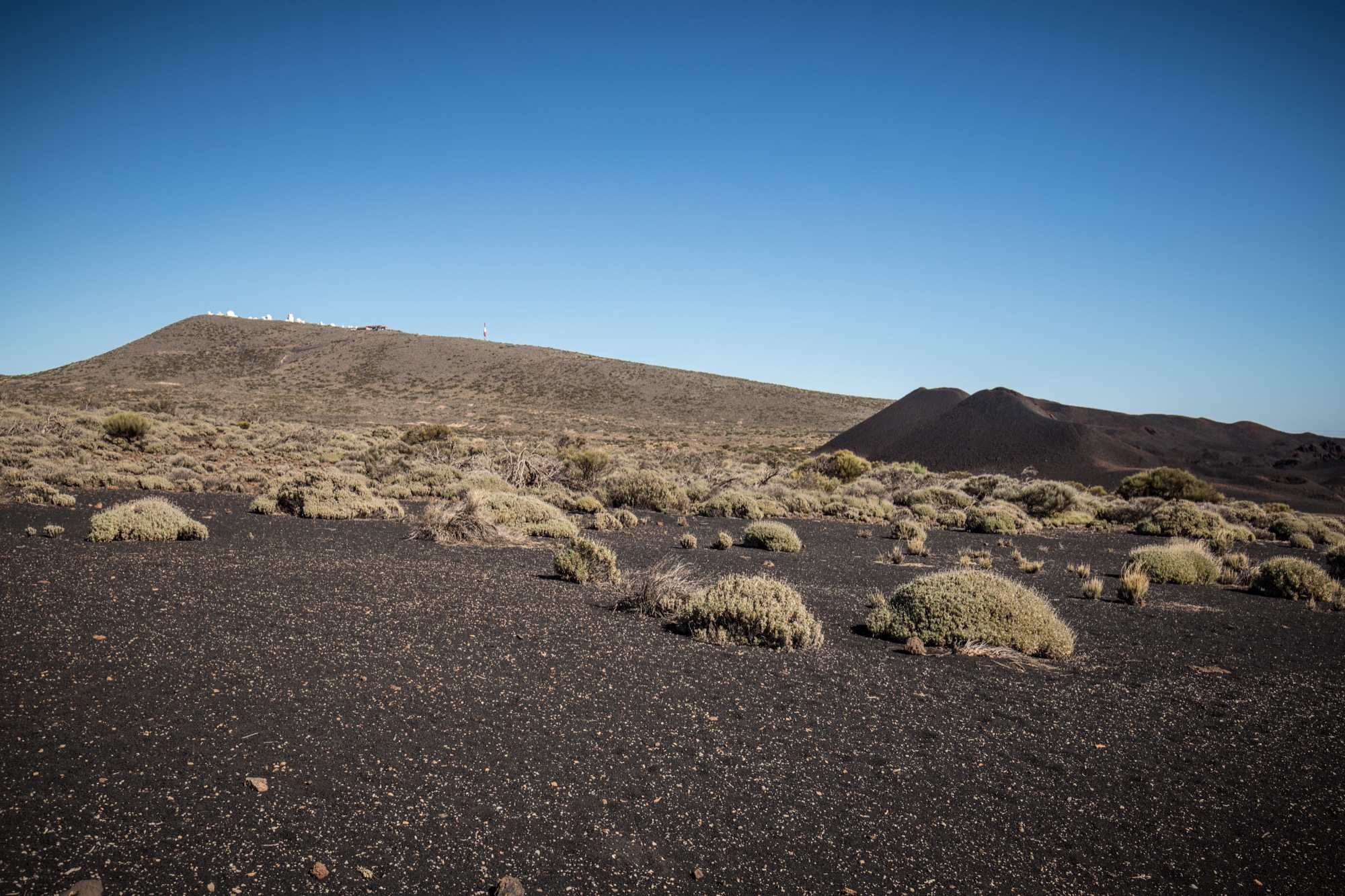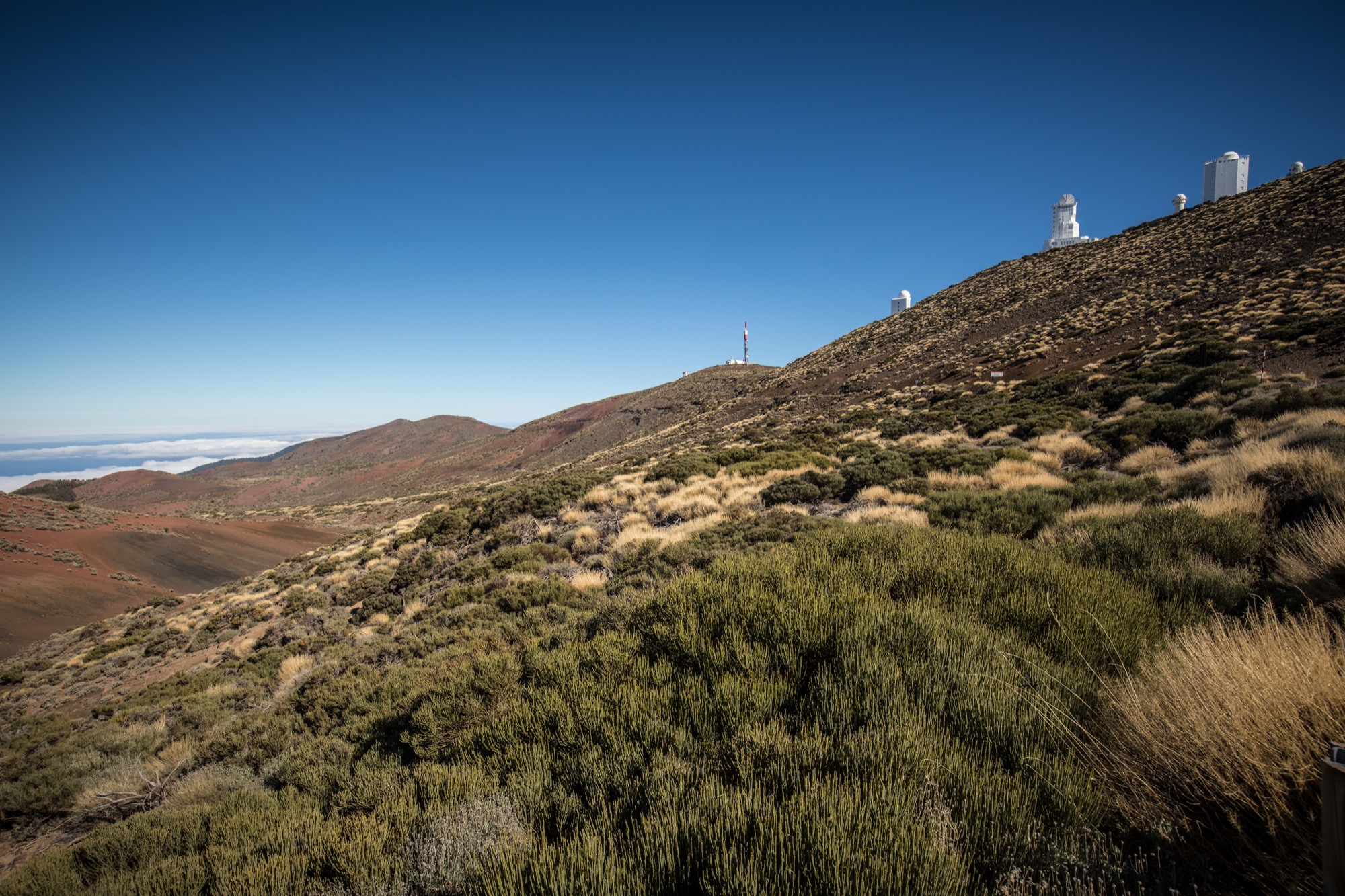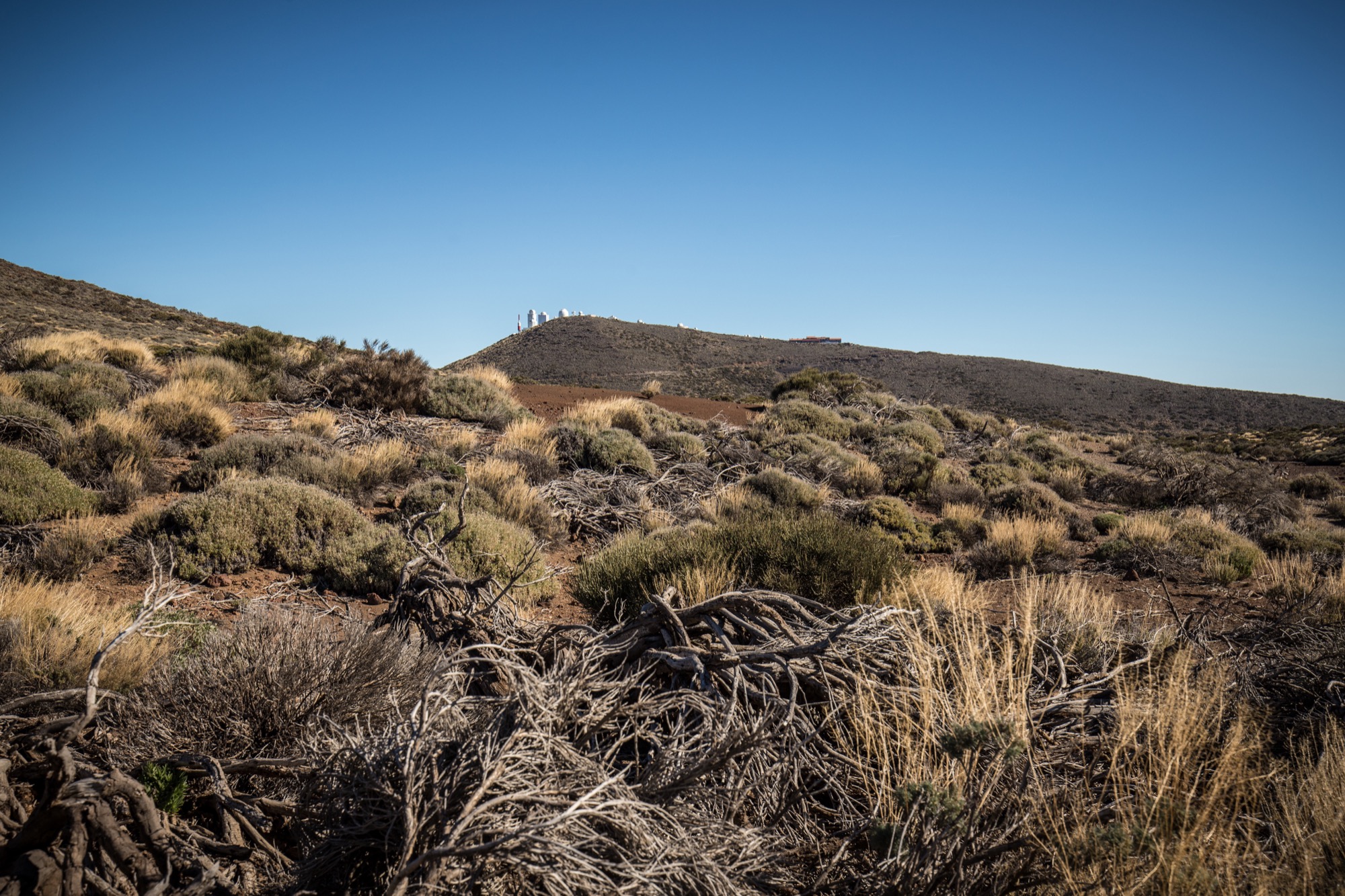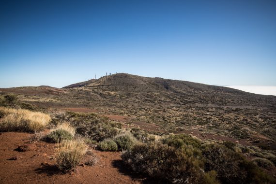 Le départ se fait non loin de l’observatoire de Tenerife. C’est parti pour un peu plus de huit kilomètres et une faible dénivelée (pour ne pas dire aucune) : idéal pour se mettre en jambes car les randonnées alpines semblent bien lointaines. On est gâtés par de très belles vues sur la zone de l’observatoire dans un premier temps, avec Gran Canaria qui se découpe en fond et puis le Teide, visible au tout début de la randonnée puis marqué par une colline réapparaît, silhouette familière et massive.