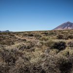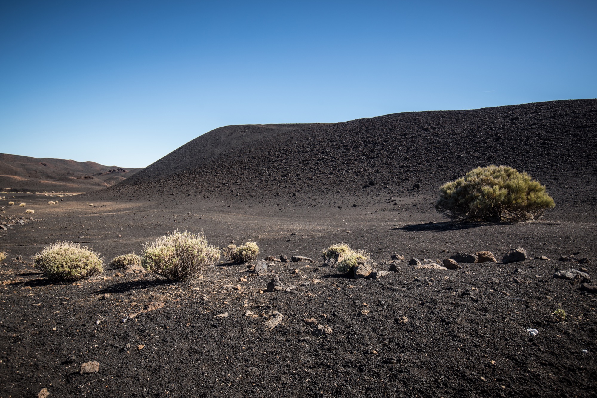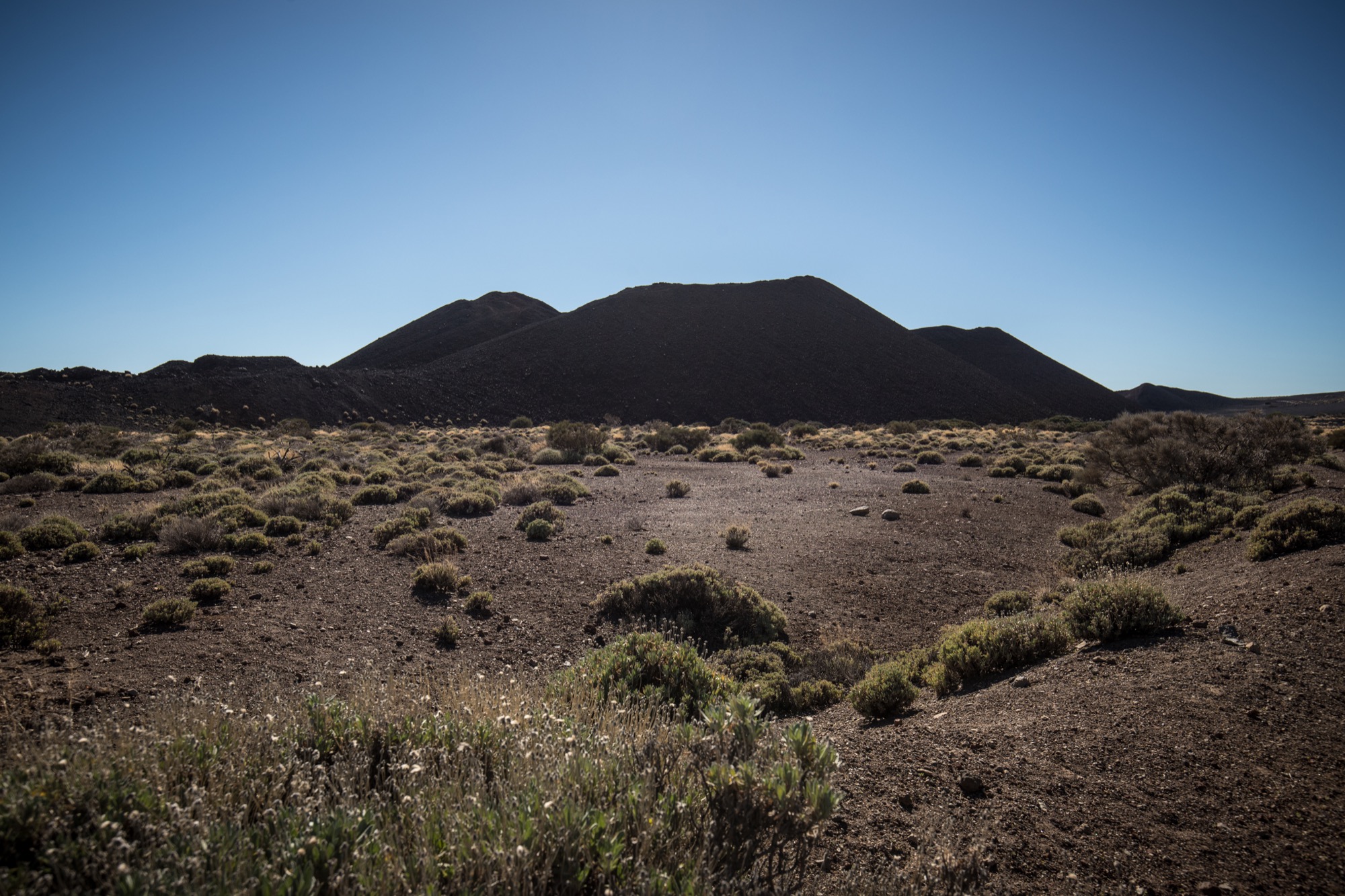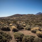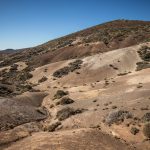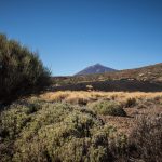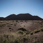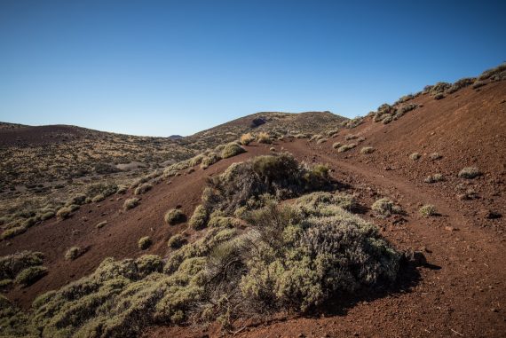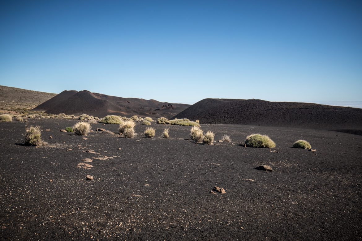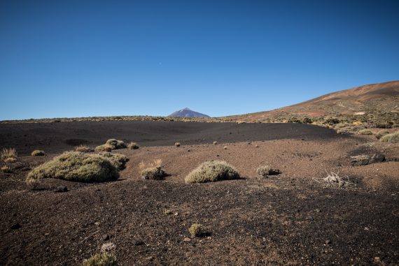 La randonnée descend ensuite vers une zone colorée et laisse entrevoir les crêtes de la caldera du Teide, ainsi que El Hierro, au loin. Le sol change de couleurs et se dénue petit à petit de végétation, le Volcan de Fasnia et quelques cônes volcaniques voisins, d’un noir de suie qui semble absorber la lumière est atteint. Des poches de végétation tentent ici et là de conquérir du terrain tandis que de l’autre côté de la piste que l’on emprunte, elle a plus simplement choisi d’entourer les poches de lave noirâtre.