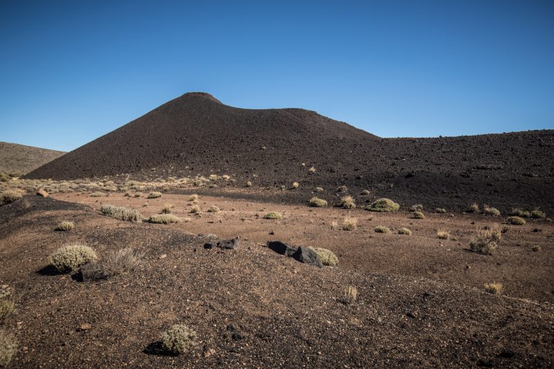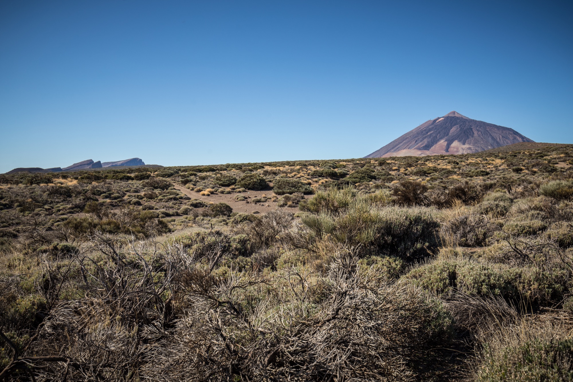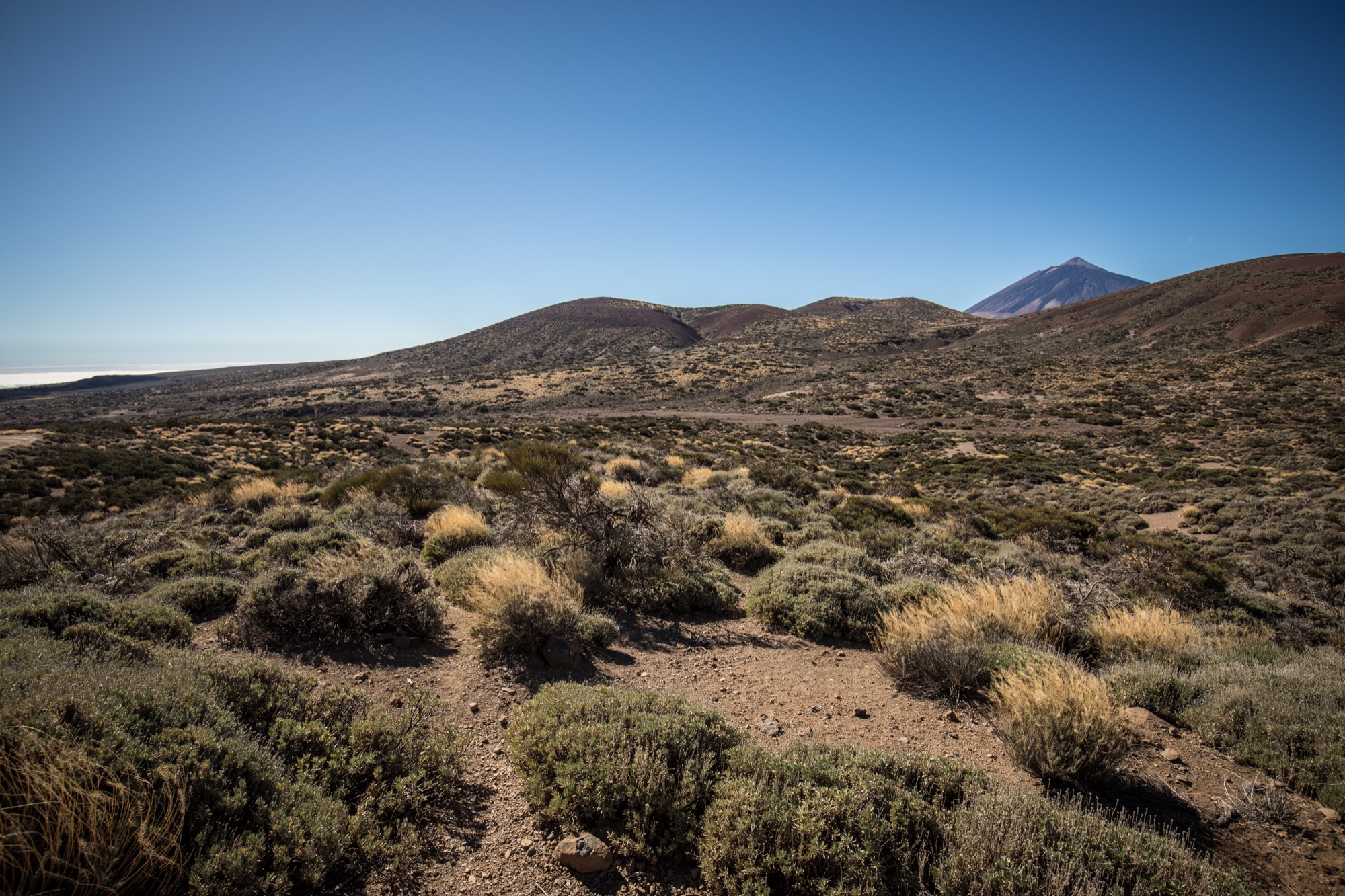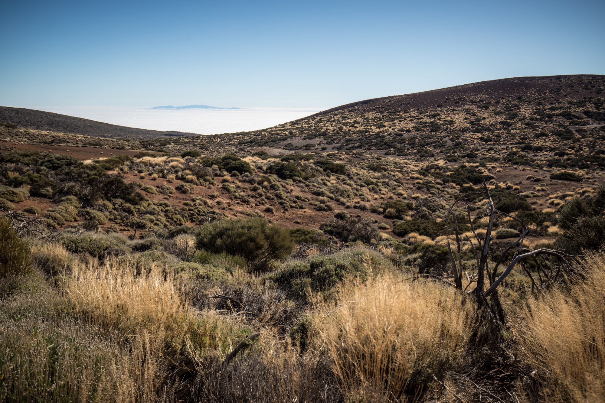 La randonnée descend ensuite vers une zone colorée et laisse entrevoir les crêtes de la caldera du Teide, ainsi que El Hierro, au loin. Le sol change de couleurs et se dénue petit à petit de végétation, le Volcan de Fasnia et quelques cônes volcaniques voisins, d’un noir de suie qui semble absorber la lumière est atteint. Des poches de végétation tentent ici et là de conquérir du terrain tandis que de l’autre côté de la piste que l’on emprunte, elle a plus simplement choisi d’entourer les poches de lave noirâtre.