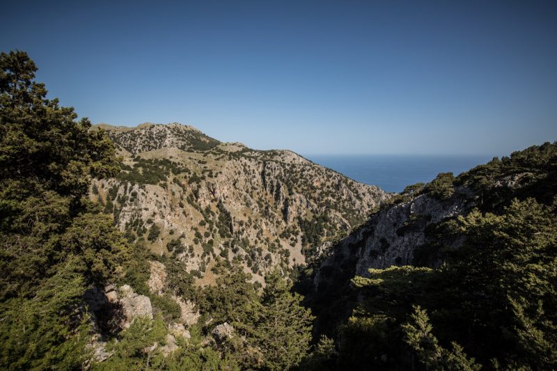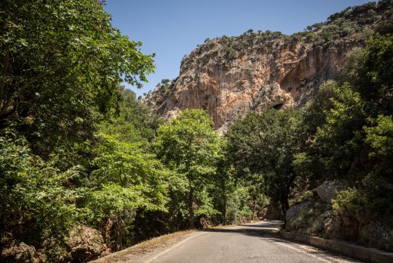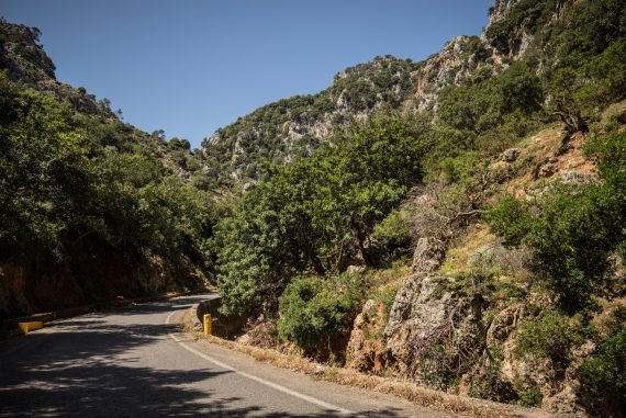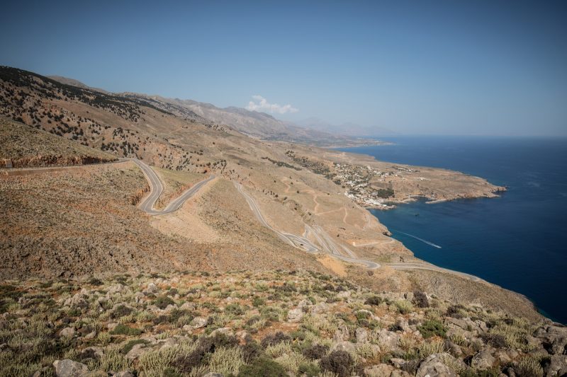 Il est maintenant temps de filer plein sud, en direction de Skafia. La route de Vryses à Chora Skafion (l’autre nom de Skafia) est une nouvelle merveille après celle arpentée le matin même entre Sougia et Hania ! La montée côté nord est un régal de conduite et de paysages et la descente au sud est encore meilleure, avec pour finir une fantastique descente le long des gorges d’Imbros et une plongée finale dans la mer à vous couper le souffle.