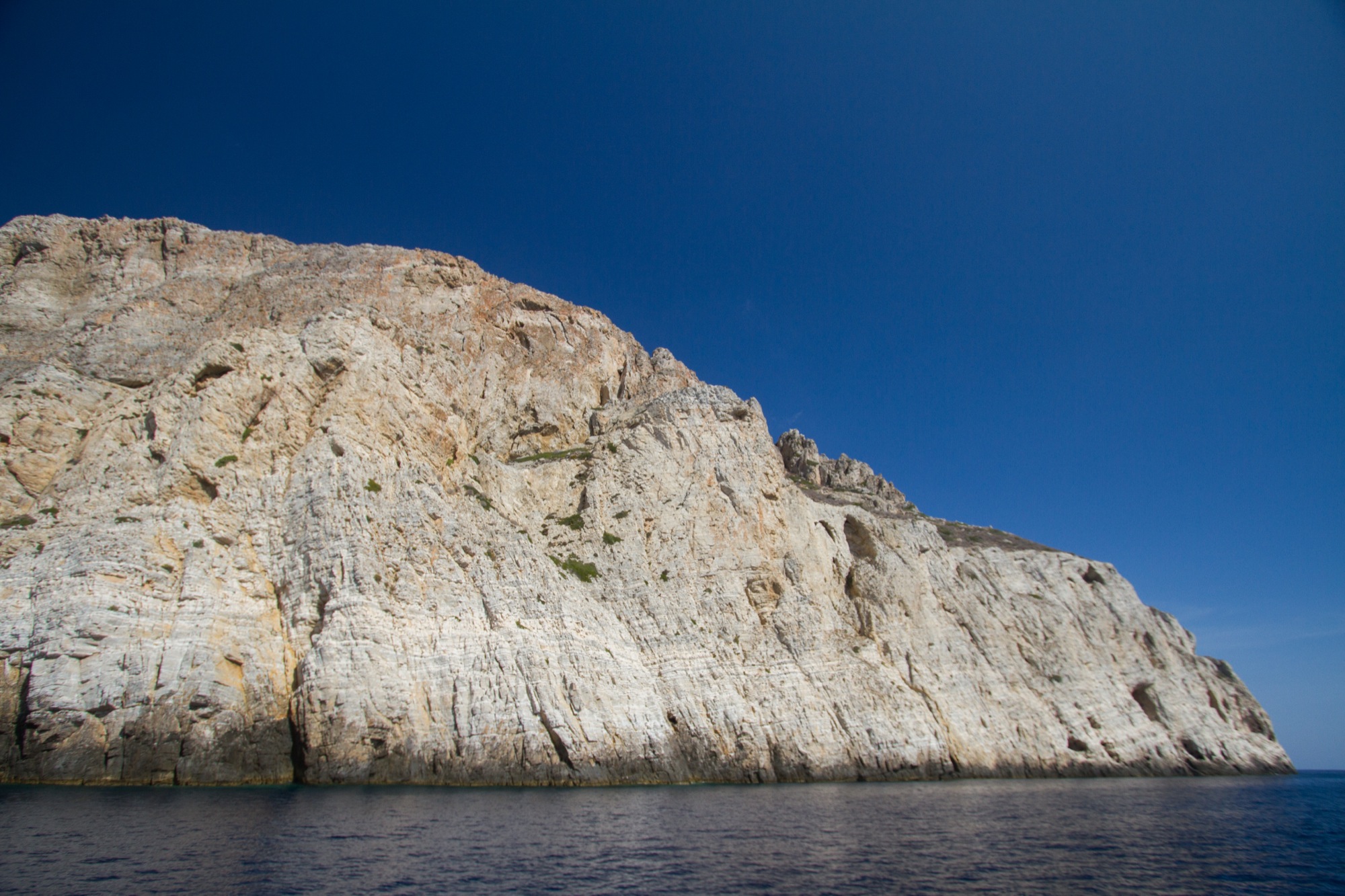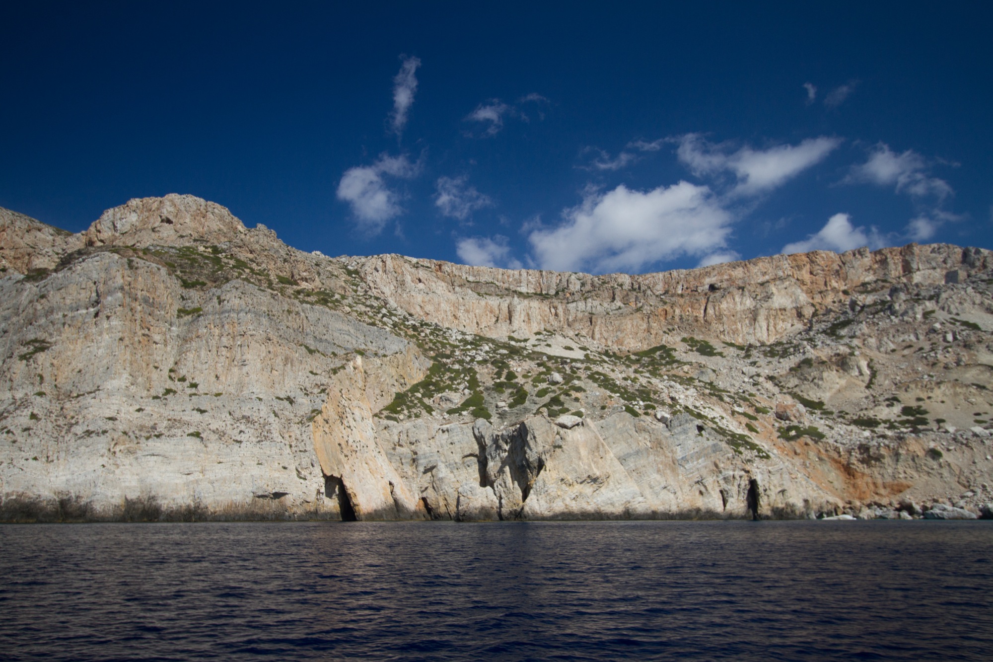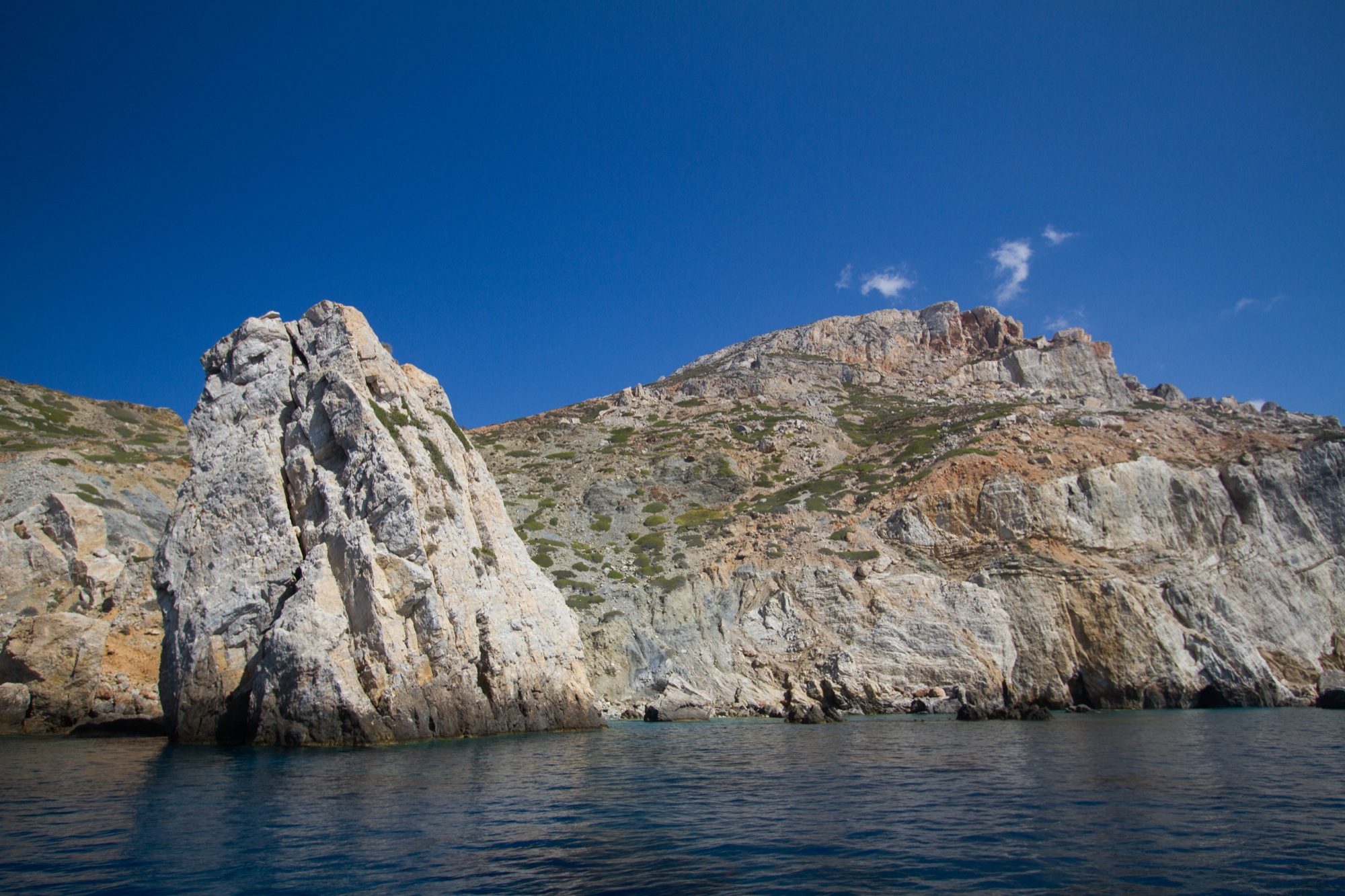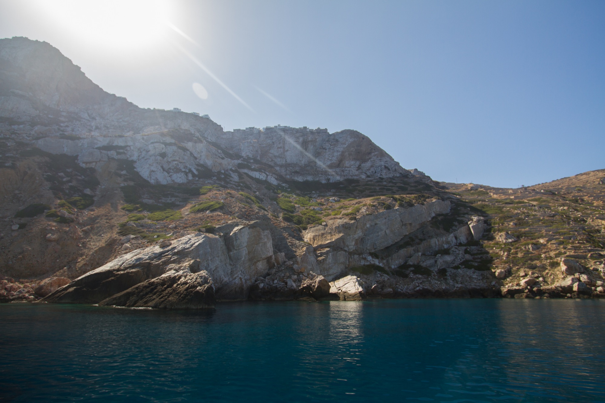 Rendez-vous à Karavostatis le matin. Le bateau se remplit peu à peu (y compris d’un photographe sympathique – vous verrez les trois dernières photos de l’article !) et on part vite en remontant la côte Nord. Les premières falaises du sud sont d’ores et déjà impressionnantes et me laissent en réalité la bouche grande ouverte. On approche de Chora et de la baie de Plaka en passant d’abord devant la grotte de Chryssospilia. Interdite d’accès, cette grotte abrite des peintures et graffitis datant de 2000 ans et on y trouva même des squelettes.