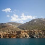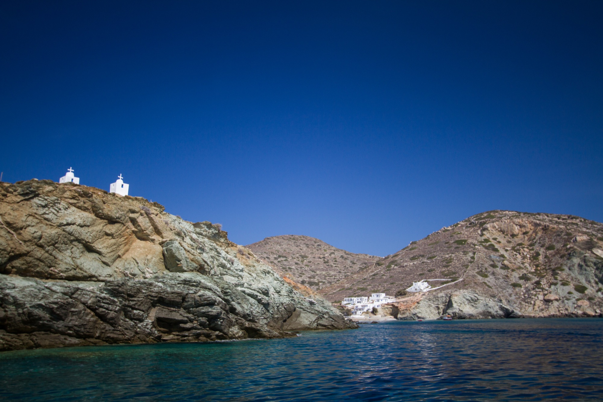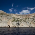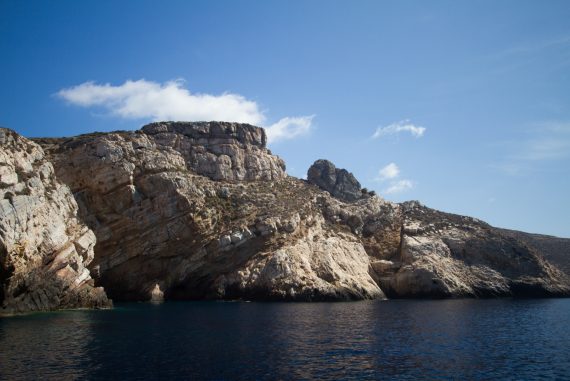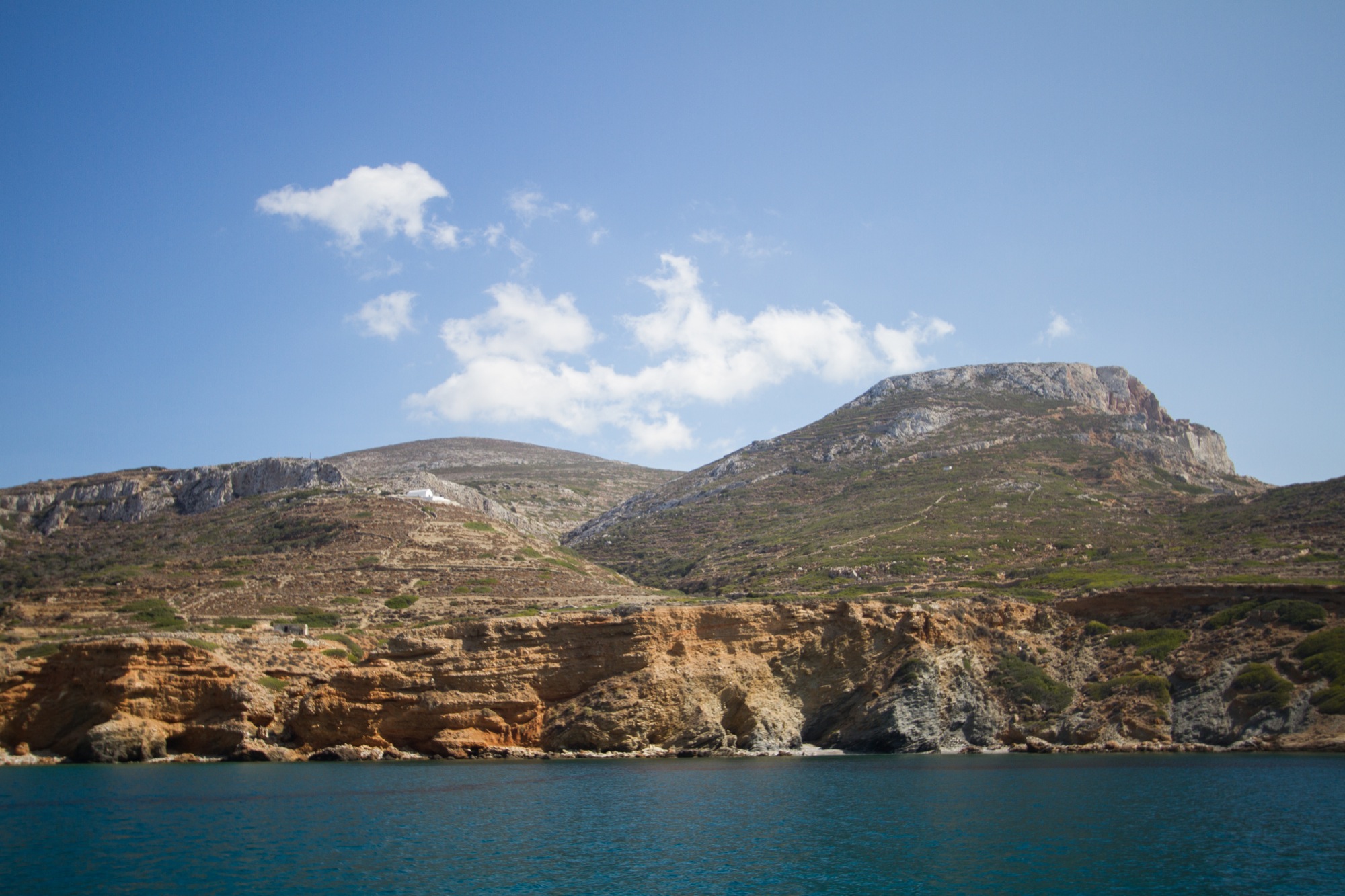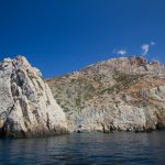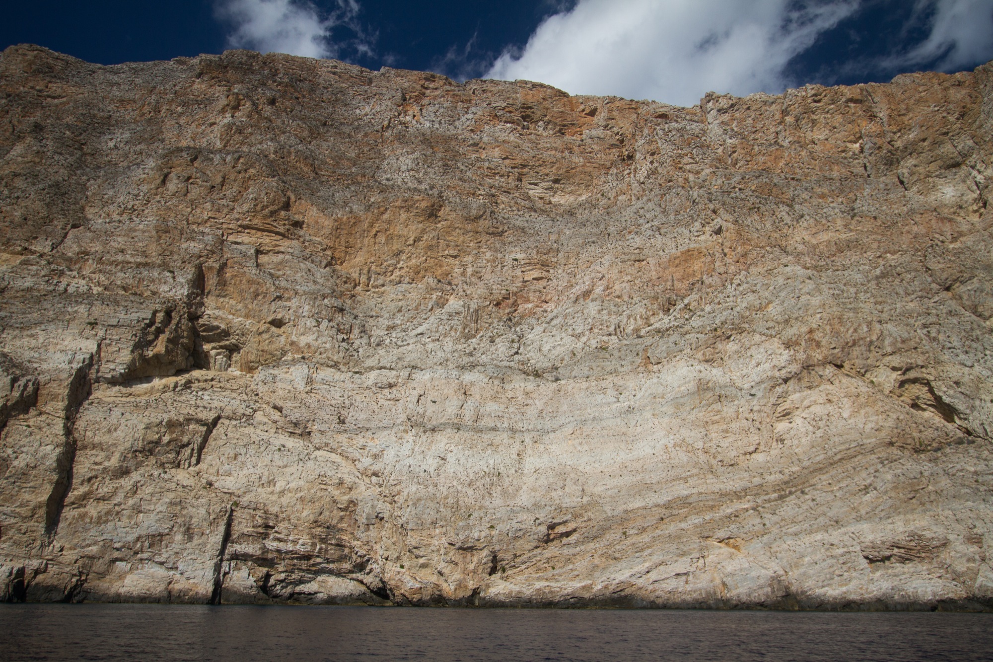 Rendez-vous à Karavostatis le matin. Le bateau se remplit peu à peu (y compris d’un photographe sympathique – vous verrez les trois dernières photos de l’article !) et on part vite en remontant la côte Nord. Les premières falaises du sud sont d’ores et déjà impressionnantes et me laissent en réalité la bouche grande ouverte. On approche de Chora et de la baie de Plaka en passant d’abord devant la grotte de Chryssospilia. Interdite d’accès, cette grotte abrite des peintures et graffitis datant de 2000 ans et on y trouva même des squelettes.
