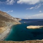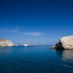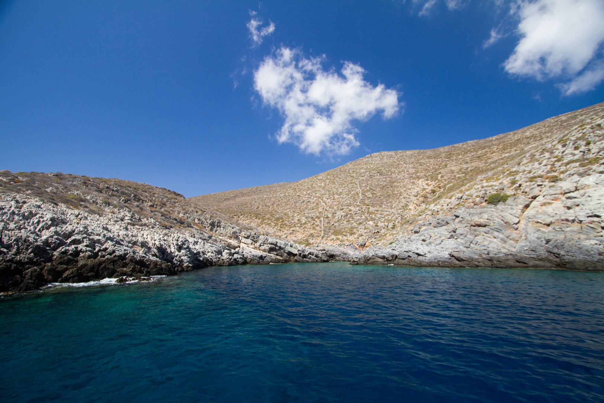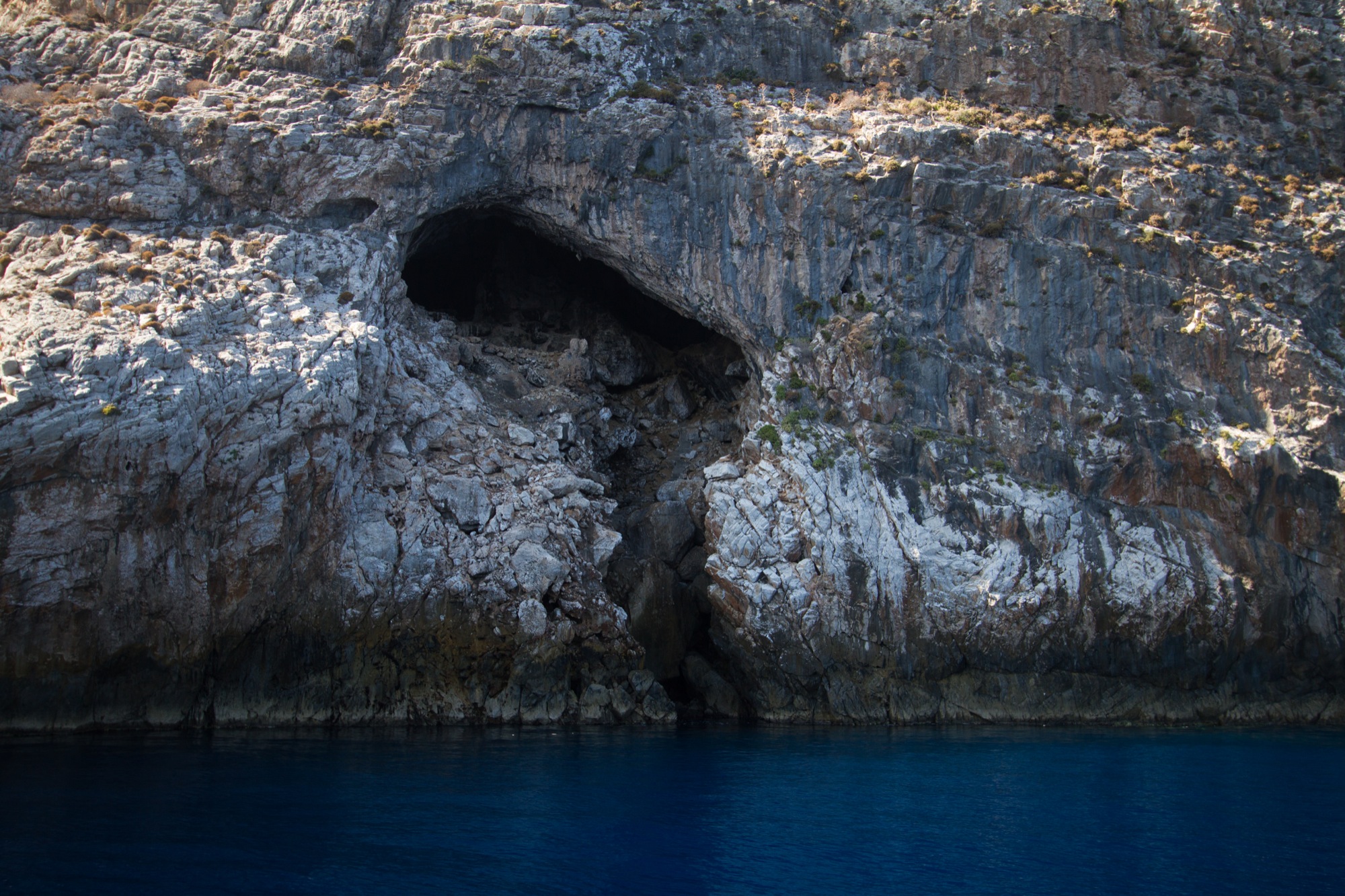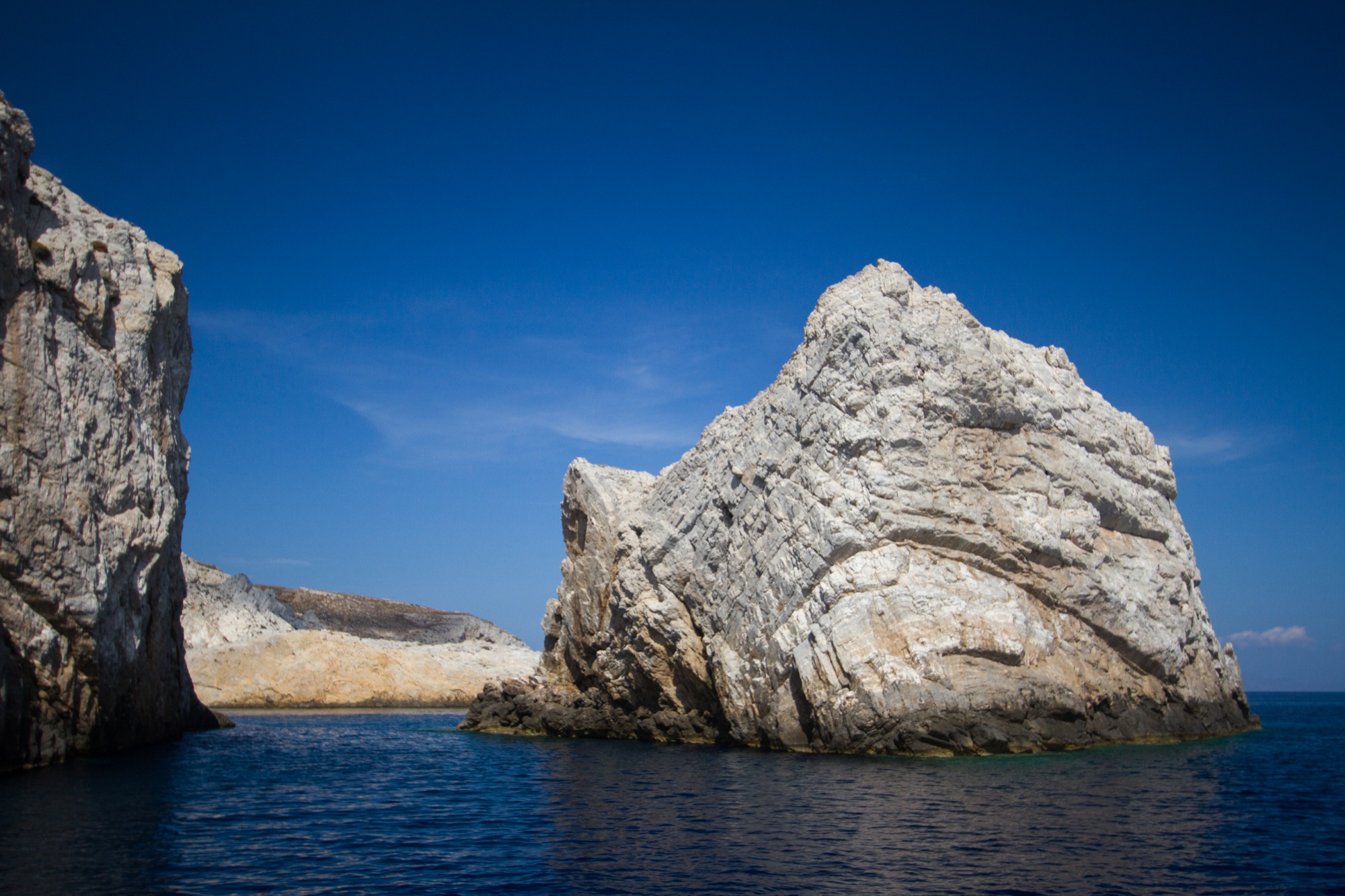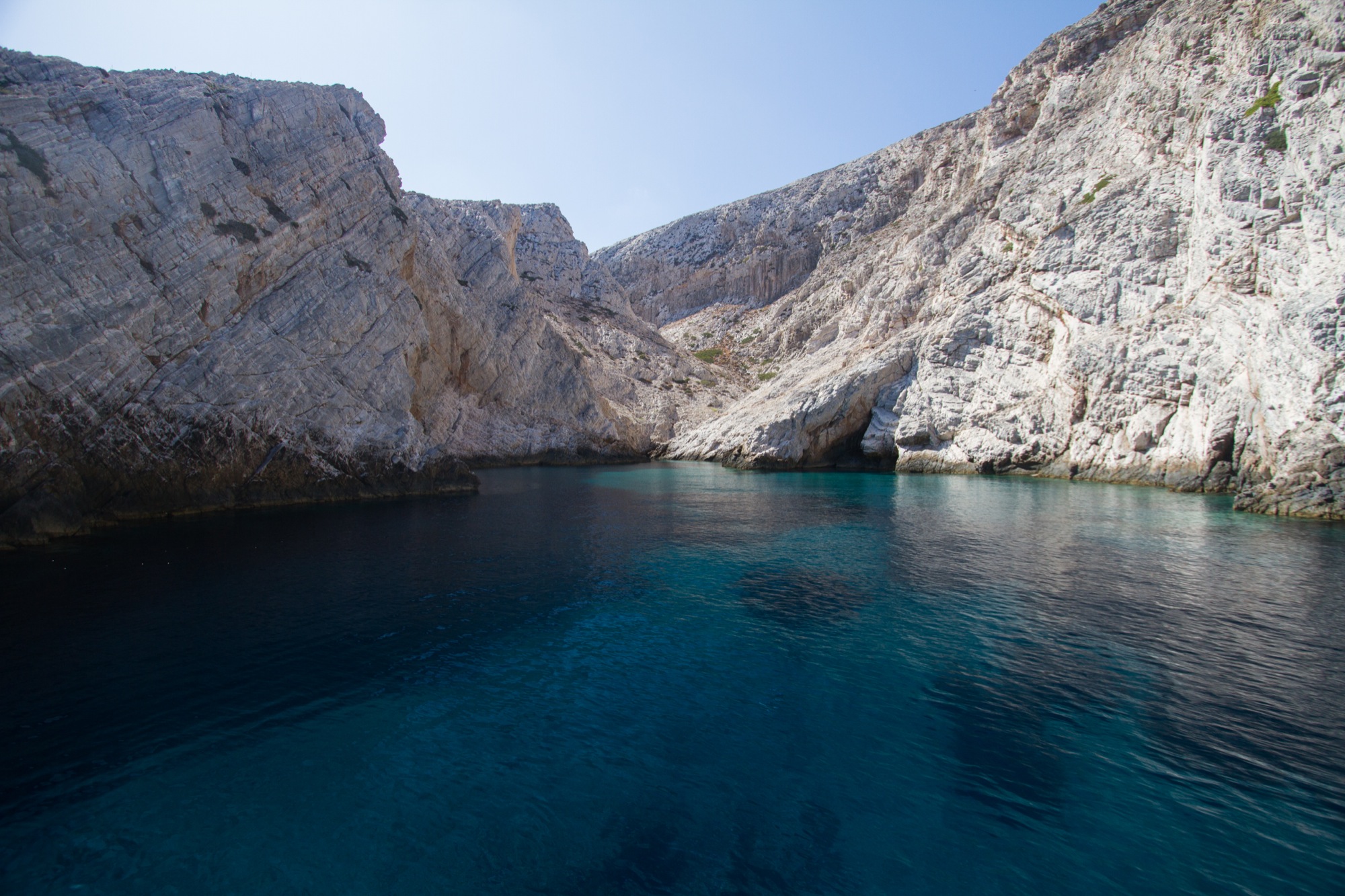 Rendez-vous à Karavostatis le matin. Le bateau se remplit peu à peu (y compris d’un photographe sympathique – vous verrez les trois dernières photos de l’article !) et on part vite en remontant la côte Nord. Les premières falaises du sud sont d’ores et déjà impressionnantes et me laissent en réalité la bouche grande ouverte. On approche de Chora et de la baie de Plaka en passant d’abord devant la grotte de Chryssospilia. Interdite d’accès, cette grotte abrite des peintures et graffitis datant de 2000 ans et on y trouva même des squelettes.