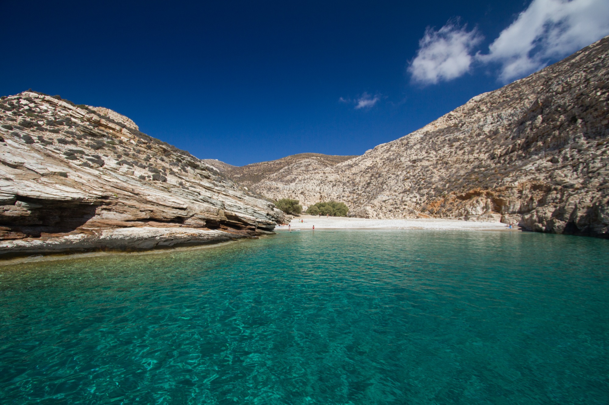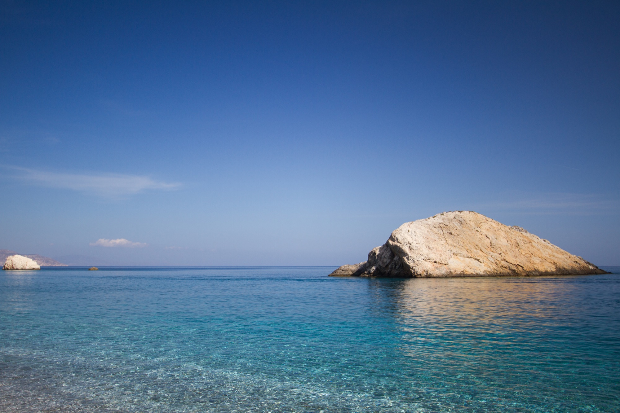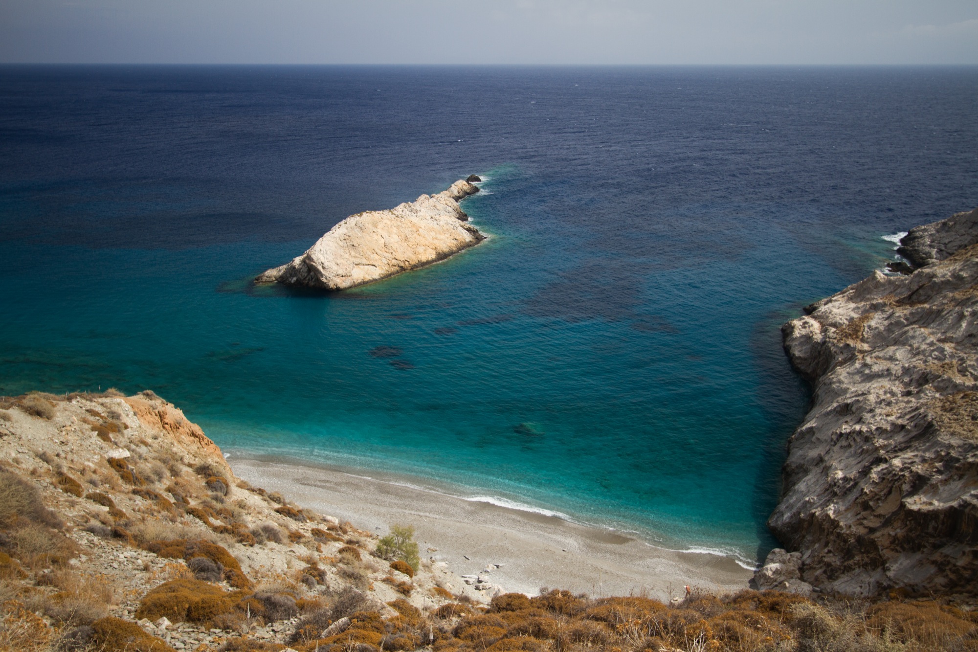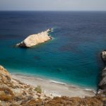Dernier point d’arrêt avant de rejoindre le port : Katergo. Cette plage, accessible assez facilement à pied et également en bateau depuis Karavostasis, est un régal avec son grand rocher qui lui fait face et sa belle étendue. Côté sud ? Les gens sans vêtements. Côté nord ? Les habillés ! Là-aussi la séparation se fait tranquillement et on s’en rendra compte le lendemain en revenant y passer la journée entière. C’est bien simple : nous étions 6 ou 8 sur l’étendue de la plage. Tran-quilles.