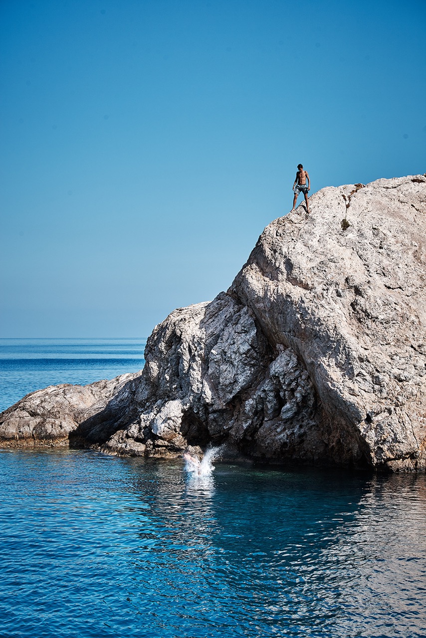 On arrive ensuite dans la baie de Chora, au pied de sa falaise dantesque. Le soleil donne pile sur nous et prendre la photo de l’ensemble relève de la gageure mais je m’acharne un peu. Il est ensuite temps d’une première baignade, dans la crique de St. Nikolaos, juste avant le cap Misotrouli.