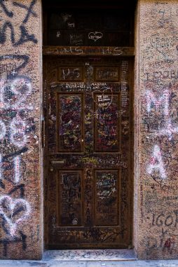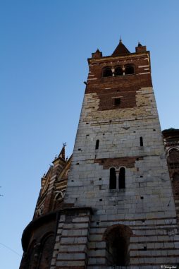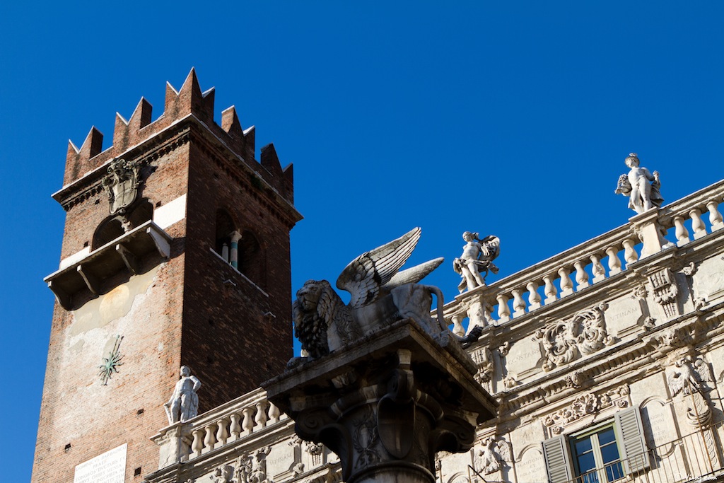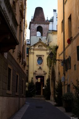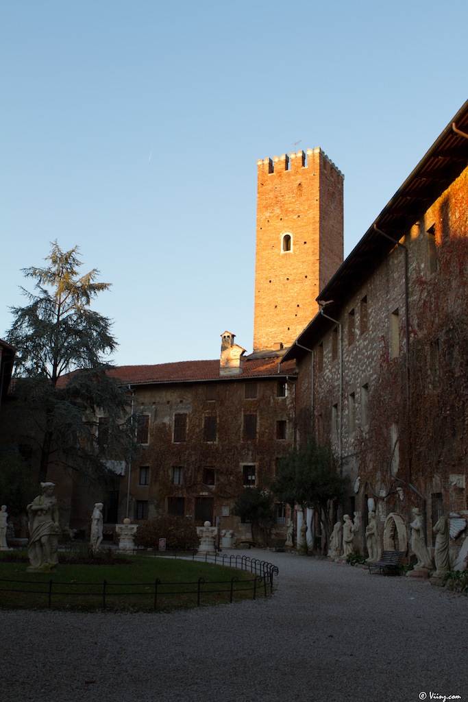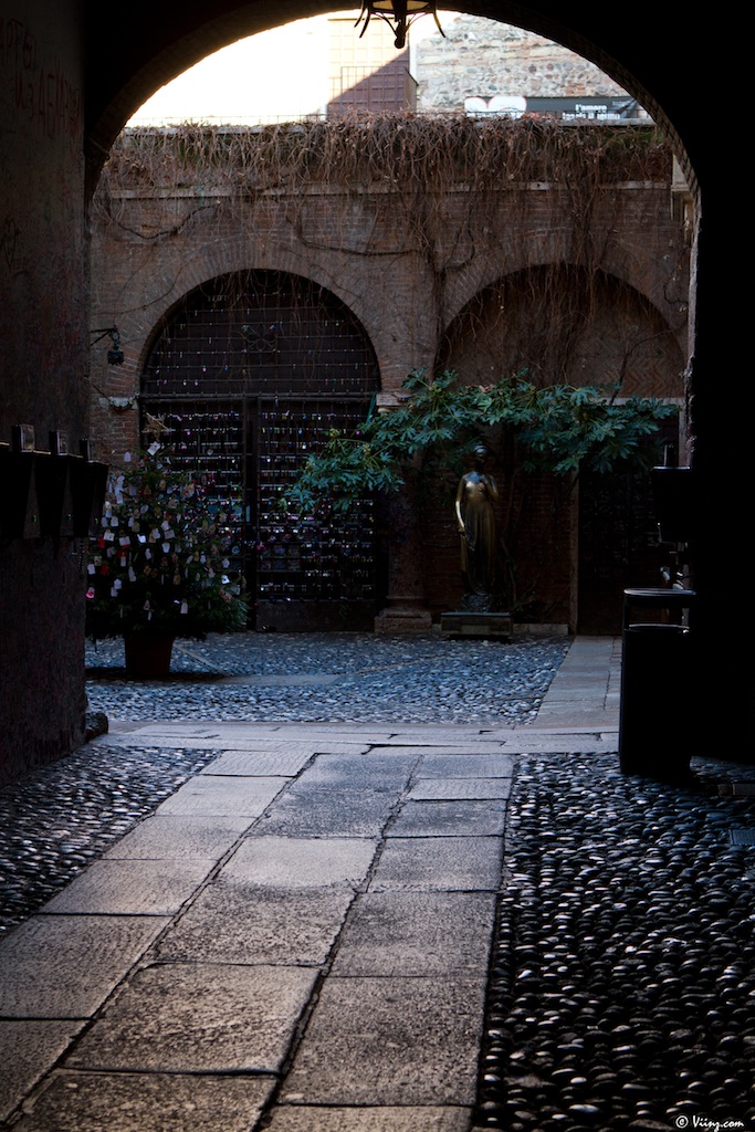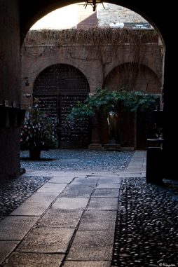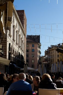 Verone, c’est aussi une place mythique, la Piazza Erbe, dominée par non moins mythique tour. Il fait vraiment bon boire un verre ici, au soleil, au milieu des touristes et des veronese. Non loin de là, il faut bien sûr s’arrêter devant la porte de Juliette. Sa silhouette trône au fond de la cour, des quantités folles de chewing-gums amoureusement mâchouillés et graffitis ratés parsèment voire couvrent les murs. Autant pour la légende.